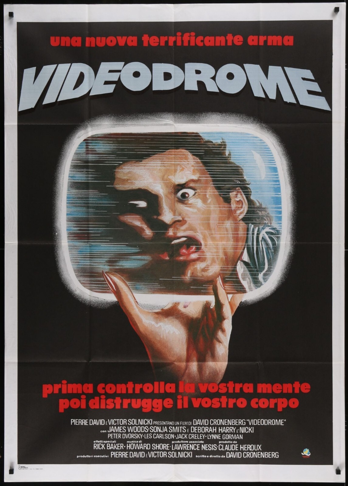 Italian film poster designed in 1983 for the cult classic Videodrome. The red text is set in all-lowercase Futura Black Agency. It translates to “a terrifying new weapon” / “First it controls your mind… then it destroys your body”. The title itself is shown in distorted sans-serif letters. For the most part, the billing block appears to be in all-caps Univers Condensed, but it’s interspersed with various non-matching glyphs.
