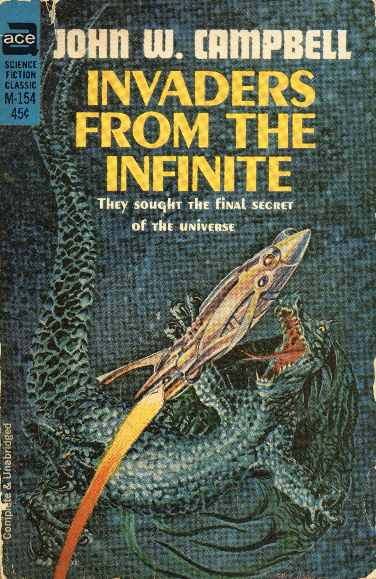 This paperback edition of Invaders from the Infinite was published as Ace Science Fiction Classic M-154 about 1966, with cover art by Gray Morrow. John W. Campbell’s science fiction novel was first published by Gnome Press and Fantasy Press in 1961.
