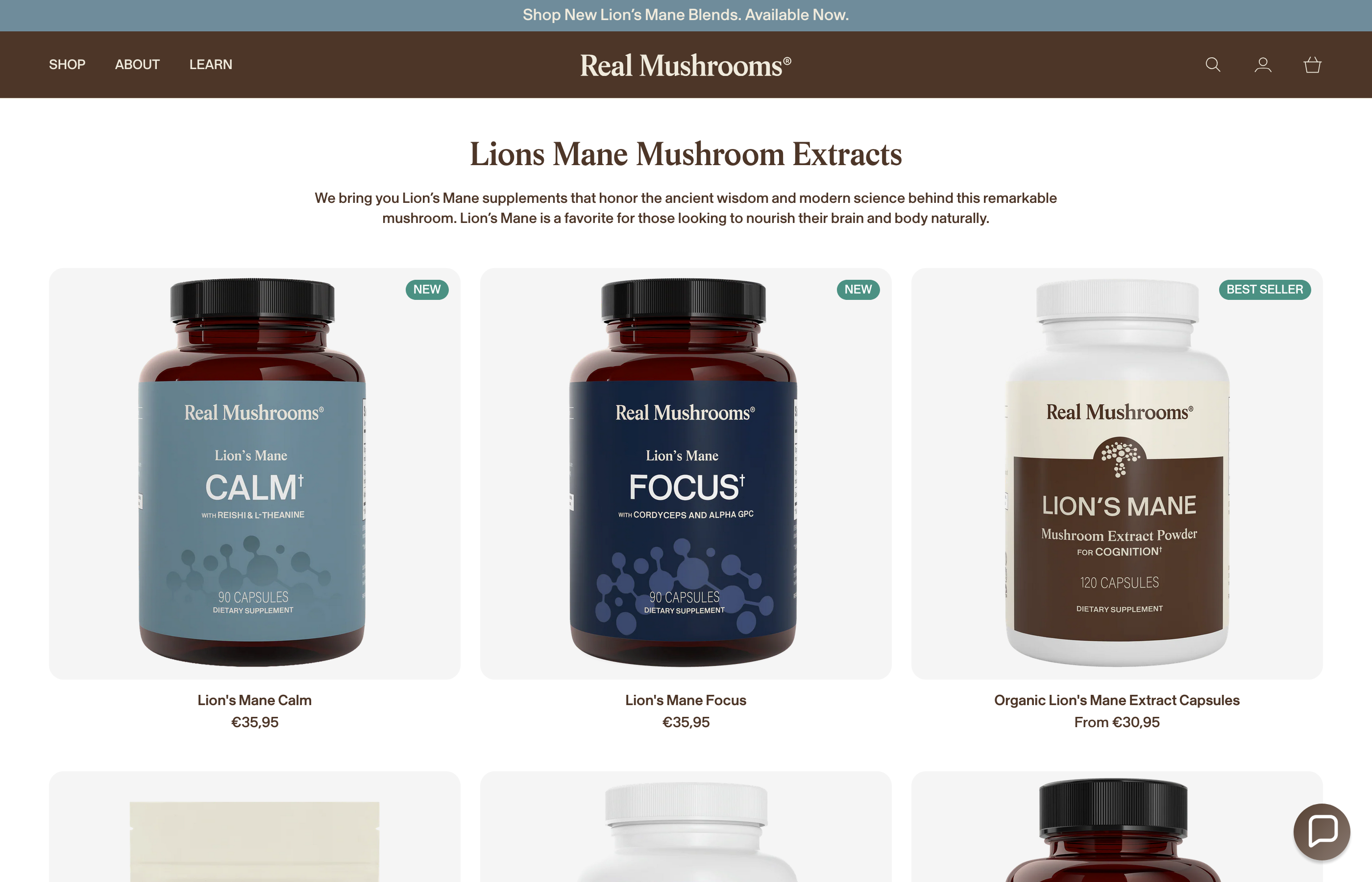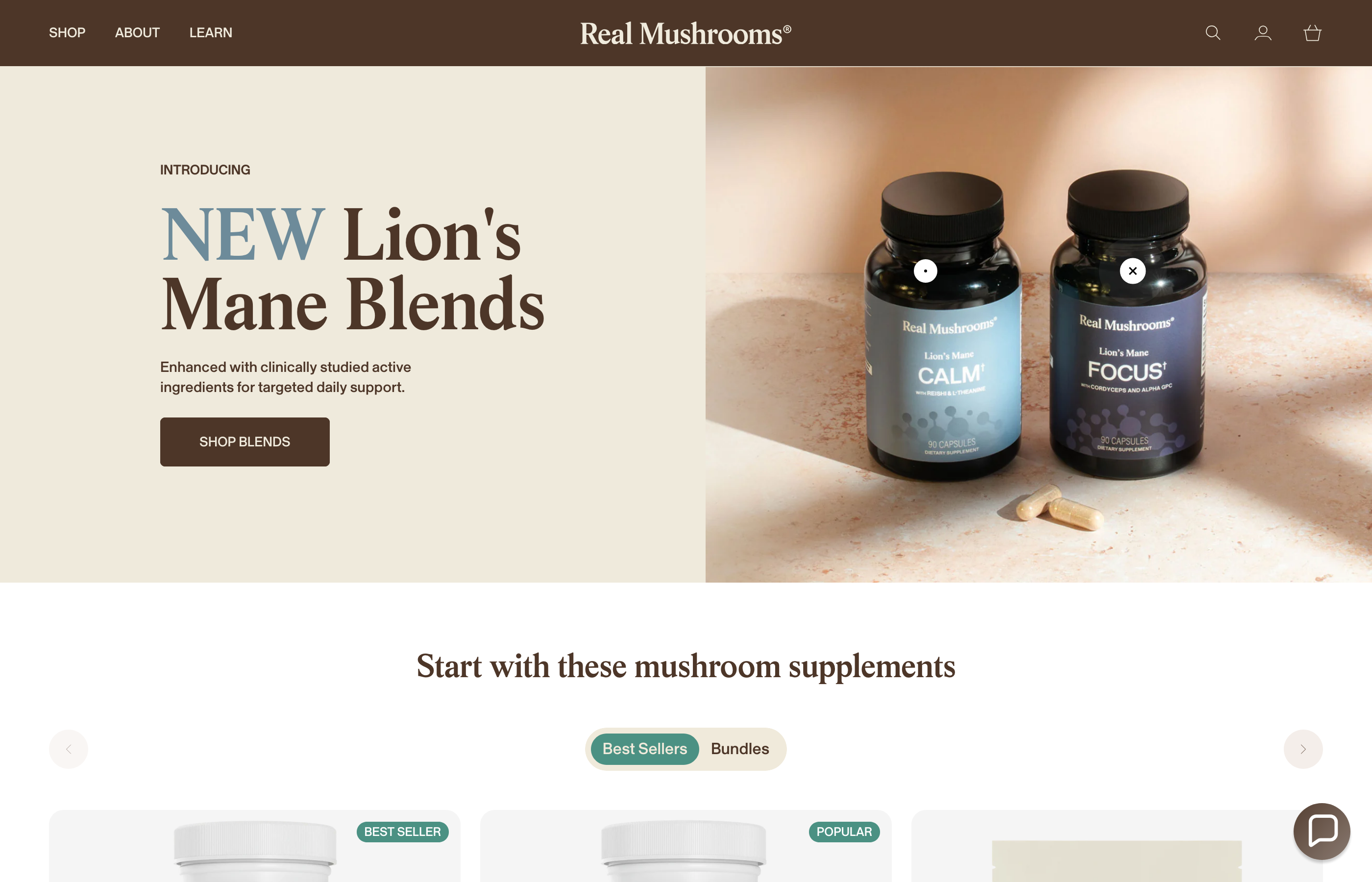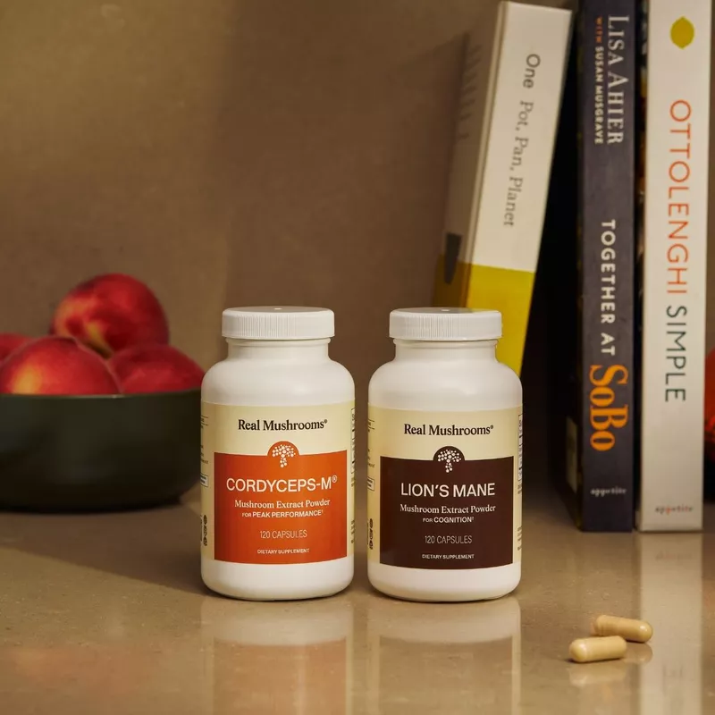 Real Mushrooms packages its mushroom supplements in a calm, earthy system of bottles and pouches, using warm neutrals, product-specific illustrations and a clear distinction between powders, capsules, blends and pet products. Across the range, the design accommodates long product names, certification marks, beta-glucan claims and serving information without losing a quiet overall feel.