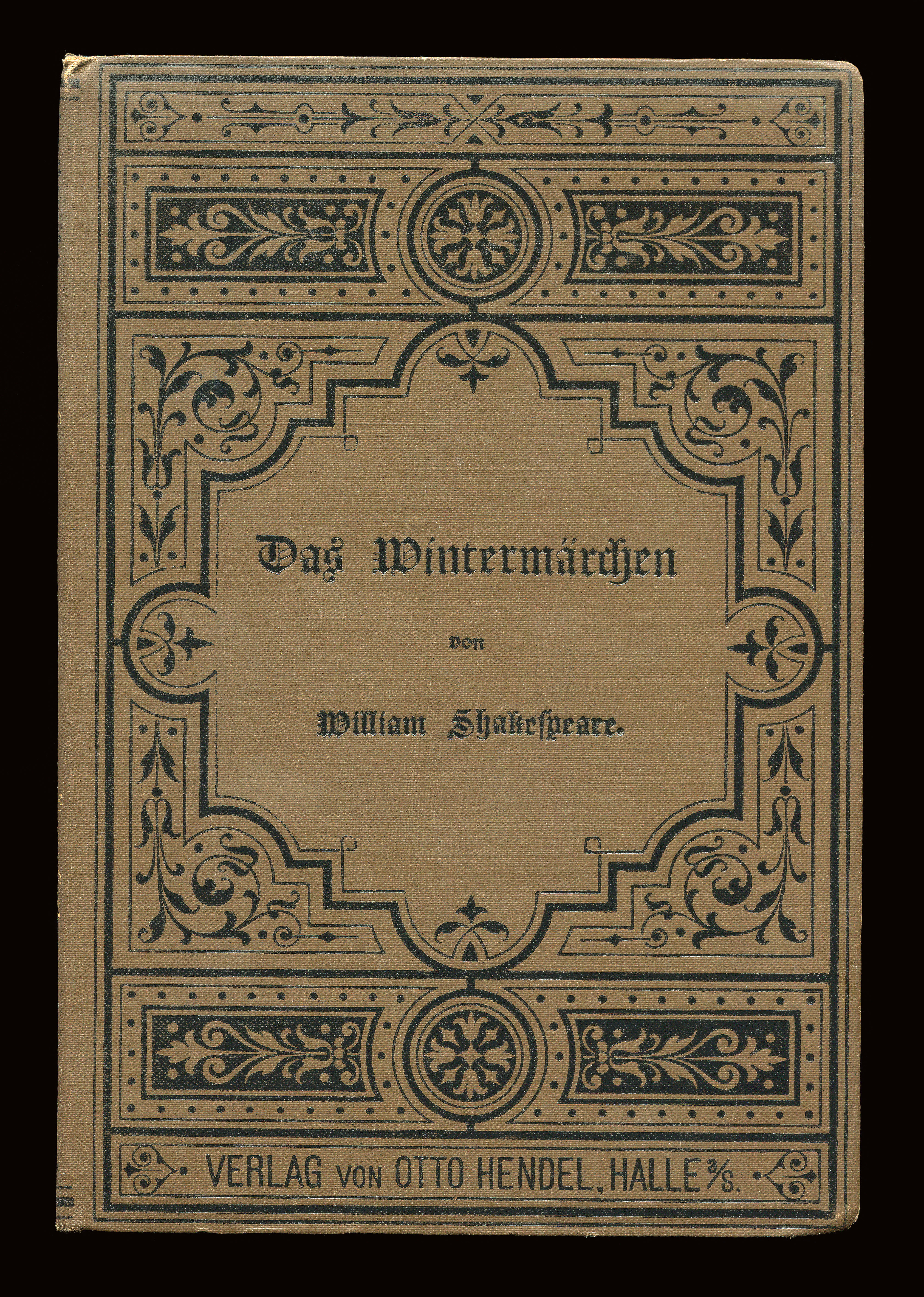 Shown here is a translation of William Shakespeare’s The Winter’s Tale, published around 1890. Title and author’s name are set in two sizes of Fleischmann-Gotisch. Cut by Johann Fleischmann in the mid-18th century and known at Enschedé as Duits (or Duyts), it was later recut at Flinsch as Fleischmann-Gotisch and at Krebs as Holländische Gotisch. The word “von” is added in some Schwabacher. The grotesk caps used for the publisher’s name probably are custom drawn.