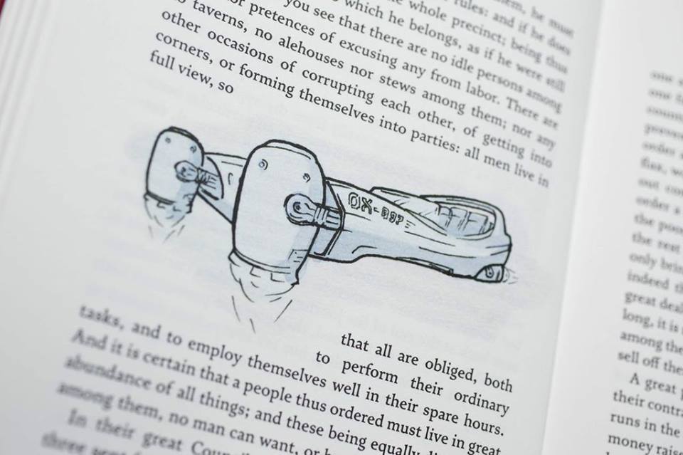 Jacqueline Dietz’s semester project at Hochschule für Technik und Wirtschaft revives More’s now 500 year old book in an ingenious way. By the simple addition of the year 2516 to the title, Dietz places the book 500 years in the future. Combined with her original illustrations, the fictional work of Utopia has suddenly become science fiction.