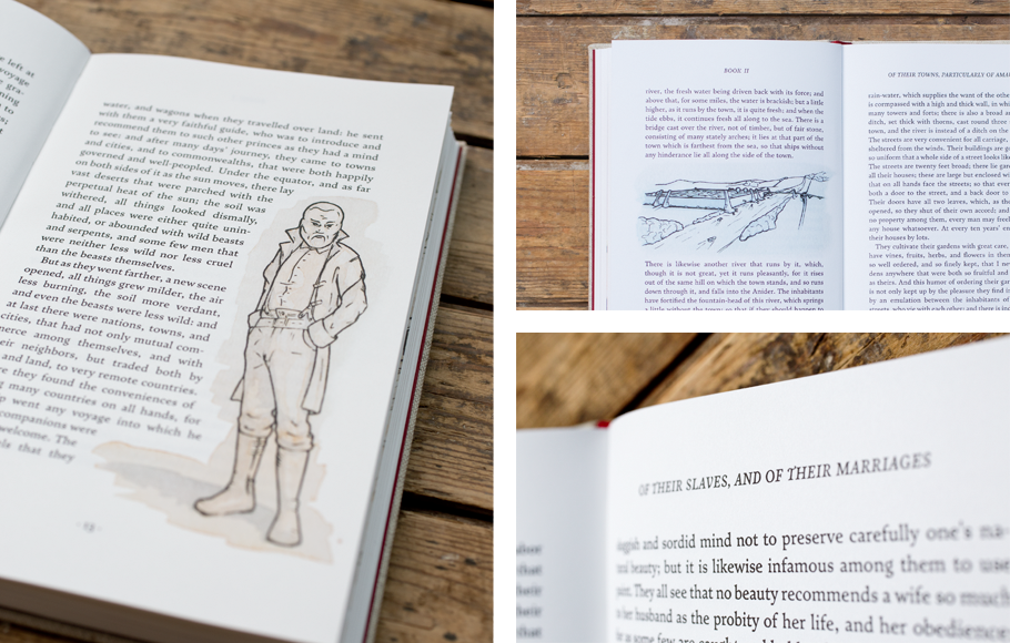 Typesetting the book in Sindre Bremnes’ debut typeface is an equally genius move. Satyr builds upon the shapes of the early humanist antiquas, which first saw light during the Renessaince – the very same period in which More wrote his book. Still, Satyr is no mere emulation of analogue tools. The letterforms are crafted independently of the broad-nib pen, almost as if the designer is shaping a boat or a viola, juxtaposing concave and convex curves to create a simultaneosly dark and airy textface. Satyr lends as much from the past, as it looks beyond now and towards the future. Breaking free from convention, its letters seems to change their mind midway through strokes, distributing weight in unusual places. With axe-like terminals and accentuated corners, Satyr creates a lively texture, just tempered enough as to not overshine the content.