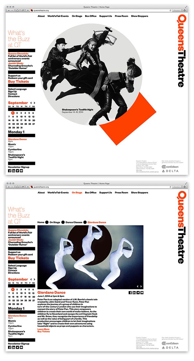 Queens Theatre Contributed by Shiva Nallaperumal on Nov 21st, 2014. Artwork published in 2014. Source: new.pentagram.com Pentagram. License: All Rights Reserved. Paula Scher’s new dynamic identity for the Queens Theatre is exquisitely modern. It uses Klim’s Founders Grotesk as the primary family and a subtly modified version of Optimo’s Theinhardt for secondary text. The subtle modification of the ‘T’ in Theatre to match the ‘Q’ in Queens is a brilliant touch at bringing the identity to perfection. Source: new.pentagram.com Pentagram. License: All Rights Reserved. Source: new.pentagram.com Pentagram. License: All Rights Reserved. Source: new.pentagram.com Pentagram. License: All Rights Reserved. Source: new.pentagram.com Pentagram. License: All Rights Reserved. Source: new.pentagram.com Pentagram. License: All Rights Reserved. Source: new.pentagram.com Pentagram. License: All Rights Reserved. Source: new.pentagram.com Pentagram. License: All Rights Reserved. Source: new.pentagram.com Pentagram. License: All Rights Reserved. Typefaces More about Founders GroteskGet Founders GroteskMore about TheinhardtGet Theinhardt Formats Advertising (2103) Branding/Identity (8359) Posters/Flyers (5698) Booklets/Pamphlets (2381) Topics Performing Arts (982) Designers/Agencies Pentagram (116) Paula Scher (21) Ludwig Janoff (1) Rory Simms (2) Tagged withtheater (335)dynamic identity (1)modified typeface (1733)logos (4932)negative space (35)CamelCase (127) Artwork location United States (9842) New York City (2891) In Sets[1] (Ivan Ilic) (172)UWUWB (Liselle Ewing) (76)Favorites (Liselle Ewing) (54)Business - "Business (Liselle Ewing) (33)Entertainment Business (Liselle Ewing) (55)Clean (Liselle Ewing) (24)ALL (Liselle Ewing) (5)Selection (Francisco Besa) (125)Designs by Women (Fonts In Use Staff) (3534)favorite (fei) (44)JKS (fei) (52)Title (Byeong Man Kim) (52) Post a comment Name Email – will not be published Website Your response Submit Comment More Founders Grotesk in use African Art Now by Osei Bonsu2022Leonardo CollinaContributed by Ben Gardiner Biennale Gherdëina website2020unknownContributed by Alain Papazian MASK. In Present-Day Art exhibition catalogue2019Atelier PolContributed by Atelier Pol Staff Pick Sponsor More in Performing Arts Von sieben bis zehn2022Julia IserbeckCéline LehnertContributed by Julia Iserbeck Pussy Faggot2012Diana PortelaAna LemosSusana LageContributed by Diana Portela Stadttheater Gießen2022Patrick HübnerYOOLContributed by Sophia Tai 2wice Websitec. 2014PentagramAbbott MillerContributed by Shiva Nallaperumal More in Advertising Peter Max clocks for General Electric1968Peter MaxContributed by Reybach C Staff Pick Restaurang deVille2011Daniel CarlstenContributed by Matthijs Sluiter Tiedye & Tonic2020Mo VázquezContributed by Mo Vázquez Berliner Berg2019Paul SpehrContributed by Dan Reynolds More Fonts In Use Collected Coffee2016Fivethousand FingersMemory StudioContributed by Richard Baird Staff Pick Hofvijver Regatta 20252025Daniel GremmeContributed by Daniel Gremme Staff Pick Gayance – She’s back on her shit tour2021Hugo MutContributed by Hugo Mut Staff Pick Palco23c. 2016Durana DuranaContributed by Soimadou Ibrahim-Aliamane Staff Pick