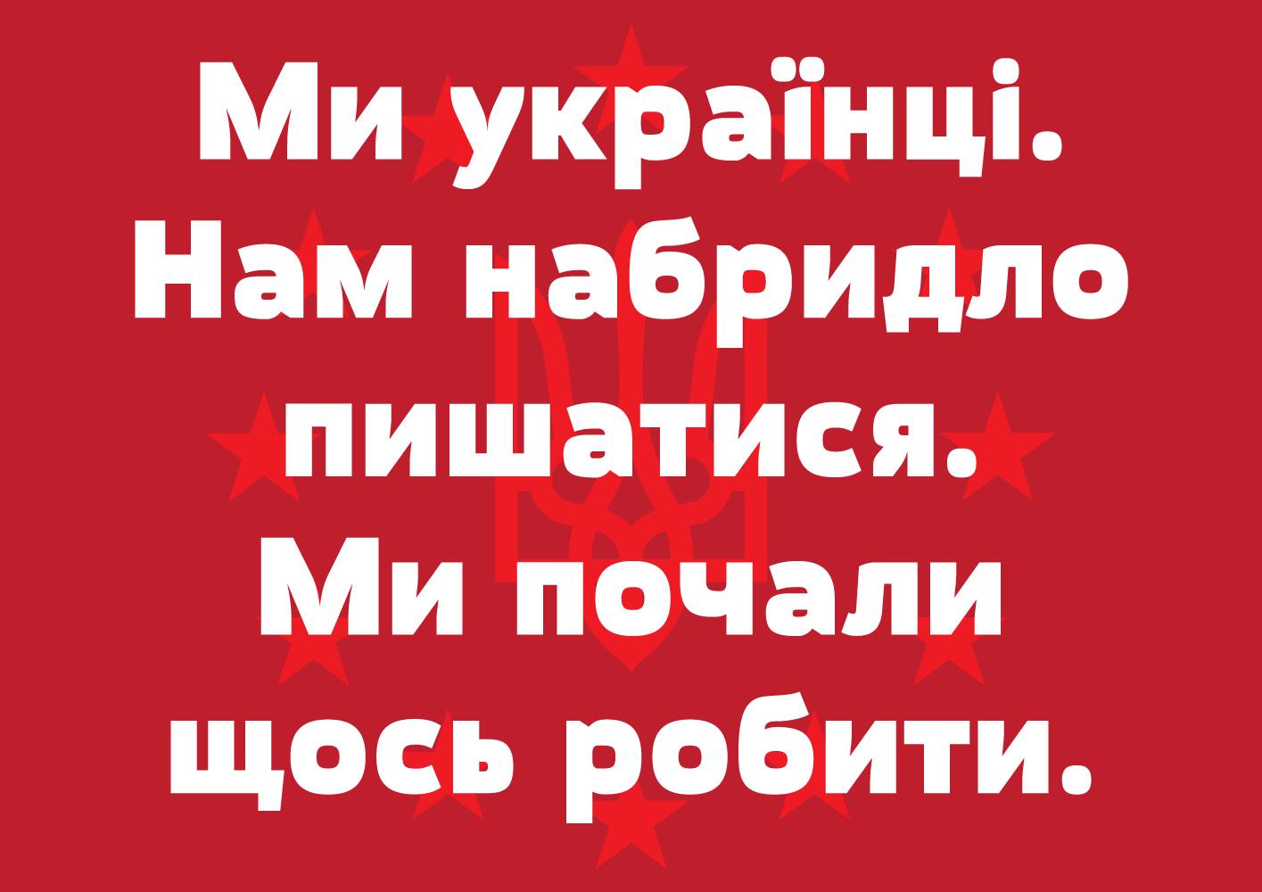 Posters of the Euromaidan Photo(s) by Sergiy Tkachenko. Imported from Flickr on Nov 24, 2014. Artwork published in 2014. Source: www.flickr.com Uploaded to Flickr by Sergiy Tkachenko and tagged with “movavigrotesque”. License: Public Domain. “Our weapon — publicity!” Source: www.flickr.com Uploaded to Flickr by Sergiy Tkachenko and tagged with “movavigrotesque”. License: Public Domain. “We are Ukrainian. We are fed up with pride. We started to do something.” Source: www.flickr.com Uploaded to Flickr by Sergiy Tkachenko and tagged with “movavigrotesque”. License: Public Domain. “Protect it!” Source: www.flickr.com Uploaded to Flickr by Sergiy Tkachenko and tagged with “movavigrotesque”. License: Public Domain. “Masks off!” Source: www.flickr.com Uploaded to Flickr by Sergiy Tkachenko and tagged with “movavigrotesque”. License: All Rights Reserved. “Country under construction. We apologize for any inconvenience” Typefaces More about Movavi GrotesqueGet Movavi Grotesque Formats Posters/Flyers (5872) Art/Illustration (502) Topics Activism (1136) Politics (871) Designers/Agencies Eliash Strongowski (1) Tagged withEuromaidan (2)protest (123)one typeface (1766)Ukrainian (language) (121)Cyrillic (script) (486) Artwork location Ukraine (141) Post a comment Name Email – will not be published Website Your response Submit Comment More in Politics Brutal exhibition, Phaidon Gallery2017Tais GhelliContributed by Tais Ghelli Forbes Ukraine, Aug/Sep 2023 issue2023Maksym ZoloiedovAnastasia LevytskaOleksandr BerdochnykContributed by Svitlana Tolmach (Rentafont) Studienrat Wahlen Heidelberg 20232023Gestaltung MannheimJuliane GutschmidtContributed by Juliane Gutschmidt Sponsor More in Posters/Flyers Jazzdor 2010 festival posters2010HelmoContributed by Indra Kupferschmid Staff Pick Mission: Impossible – Ghost Protocol (2011) posters2011BLT CommunicationsContributed by Pierre Brossard Sesc Dance Biennial 20232023Cesar AlbornozContributed by Cesar Albornoz Zealand Academy2019e-TypesContributed by Playtype Foundry More Fonts In Use Experimenta Design 2003 Poster2003Atelier Pedro FalcãoContributed by Tânia Raposo Staff Pick The Mismeasure of Man1981Jay J. SmithContributed by Florian Hardwig Staff Pick Taverne Tour 2019c. 2019Emile Lord AyotteBianca NappiVéronique LafortuneContributed by Eva Silvertant Staff Pick Artworld2021Mouthwash StudioContributed by Production Type Staff Pick Dezentralschweiz2021TGG Hafen Senn StiegerContributed by Nouvelle Noire Staff Pick Ventura pocket booksNagisa ChennotadesignContributed by Typotheque Staff Pick Dune by Frank Herbert (Ace Books, 1967 and 1974)c. 1967Don Ivan PunchatzJohn SchoenherrContributed by Florian Hardwig Staff Pick The Gloves Come Off! book launch campaign2025Christoffer LekaKaisa LekaJosh CockroftContributed by Christoffer Leka Staff Pick