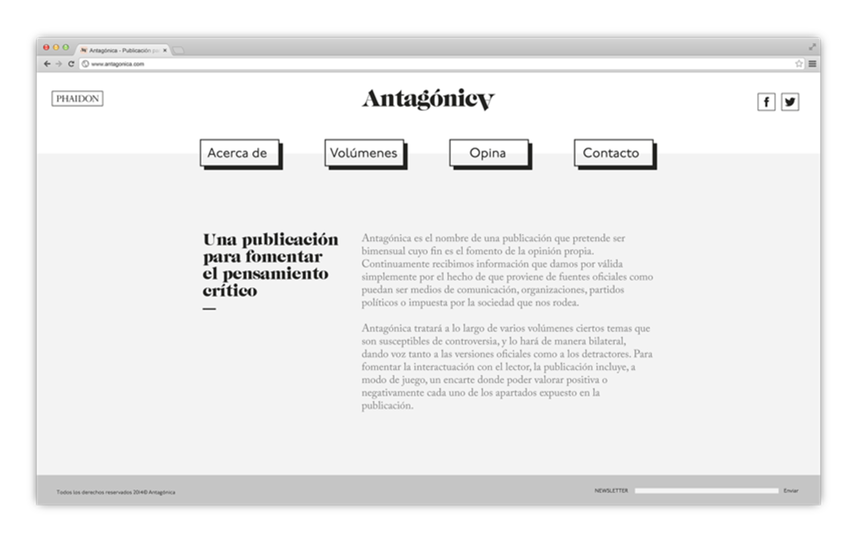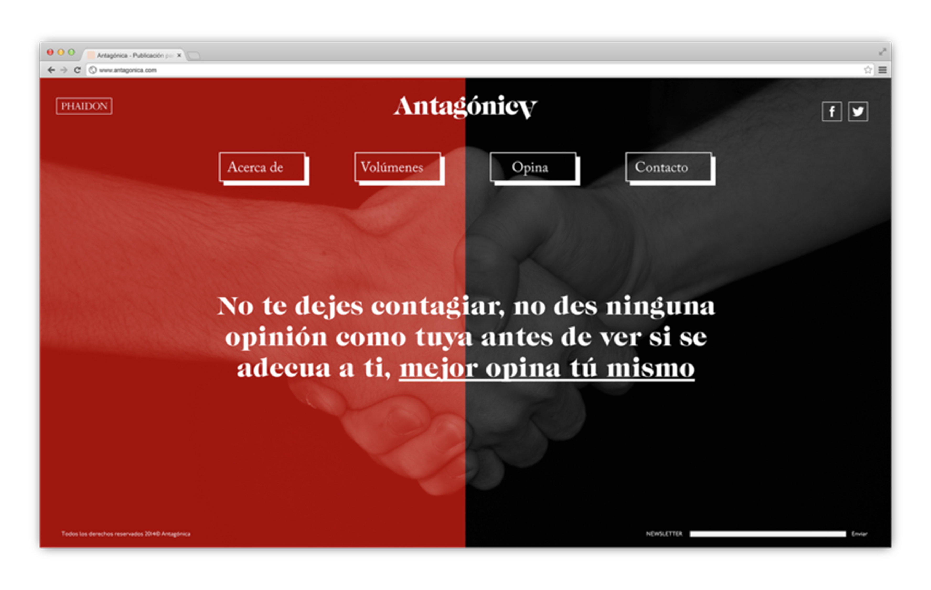 Antagónica is a biannual publication that intends to reflect on the information that is given to us and establish a tool that allows us to know all points of view so we can get a proper conclusion. Its main feature is that it is a reversible book and it can be read in both directions. The first volume is about the Nobel Peace Prize of the new Millennium.