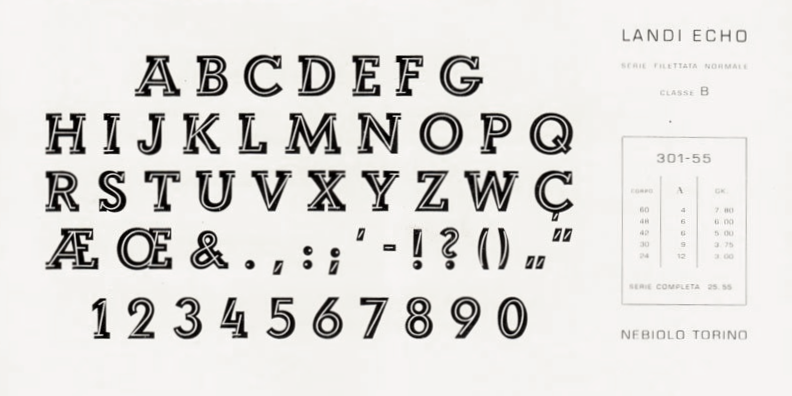 In the 1930s, Italian type designer Alessandro Butti came up with a clever idea to create a new eye-catching display typeface. The best thing: it didn’t require a whole lot of effort to produce. For Landi Echo, he took the capitals of Landi tonda nera – which was Nebiolo’s name for Welt-Antiqua halbfett, a bold low-contrast slab serif originally from Ludwig & Mayer – and added oblique thin letterforms as an inline. The result is a scintillating motion effect.