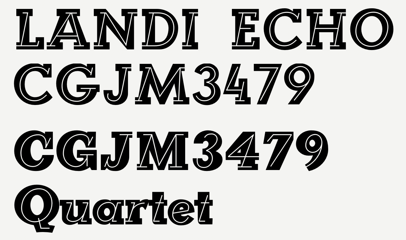 Filmotype must have loved the concept. In 1955, they added a very similar design to the catalog of fonts available for their phototypesetting machine, sorted into the “Novelty” range. Compared to Landi Echo, Filmotype Quartet is heavier, allowing the inline caps to slant more. As far as I can tell, Quartet’s underlying letterforms aren’t derived from an existing typeface. Stymie, Memphis, and Beton are similar, but none comes particularly close. The unknown designer went further than Butti, and also did a lowercase.