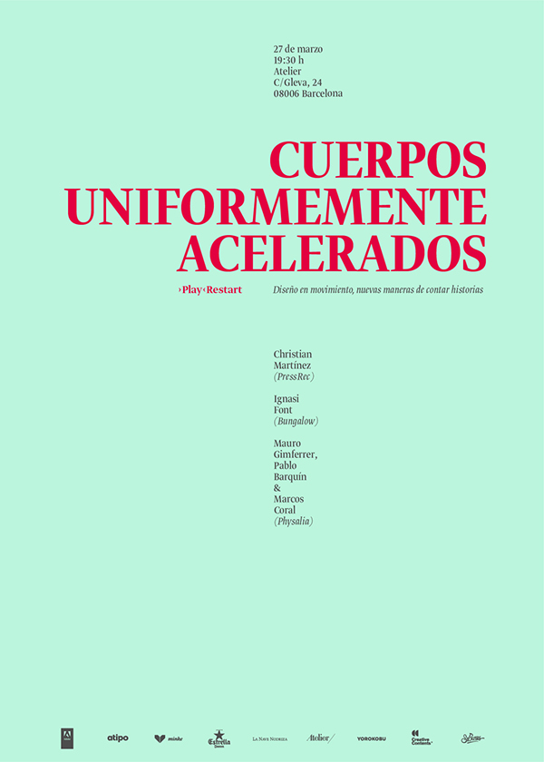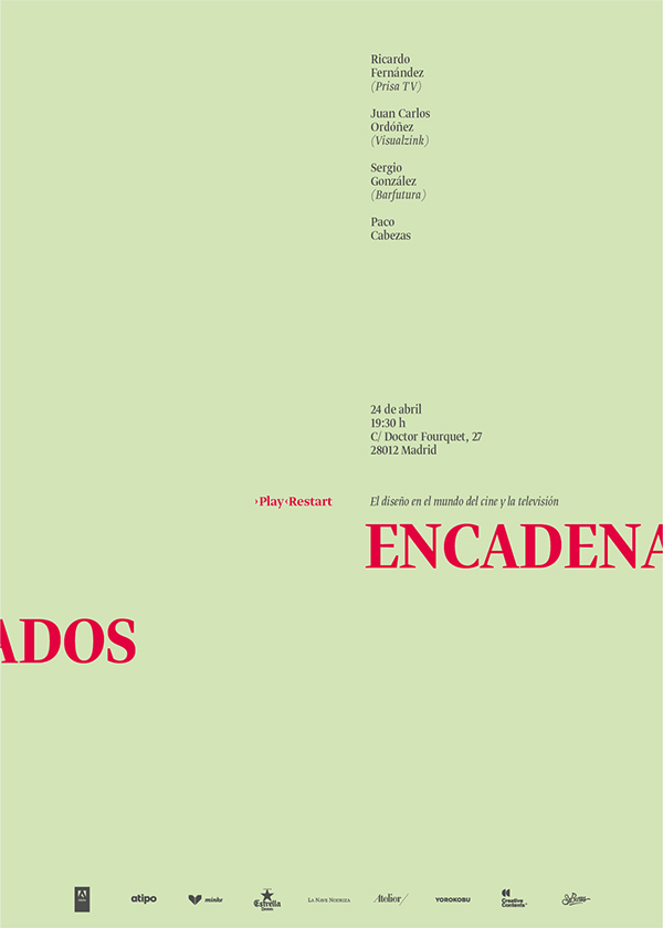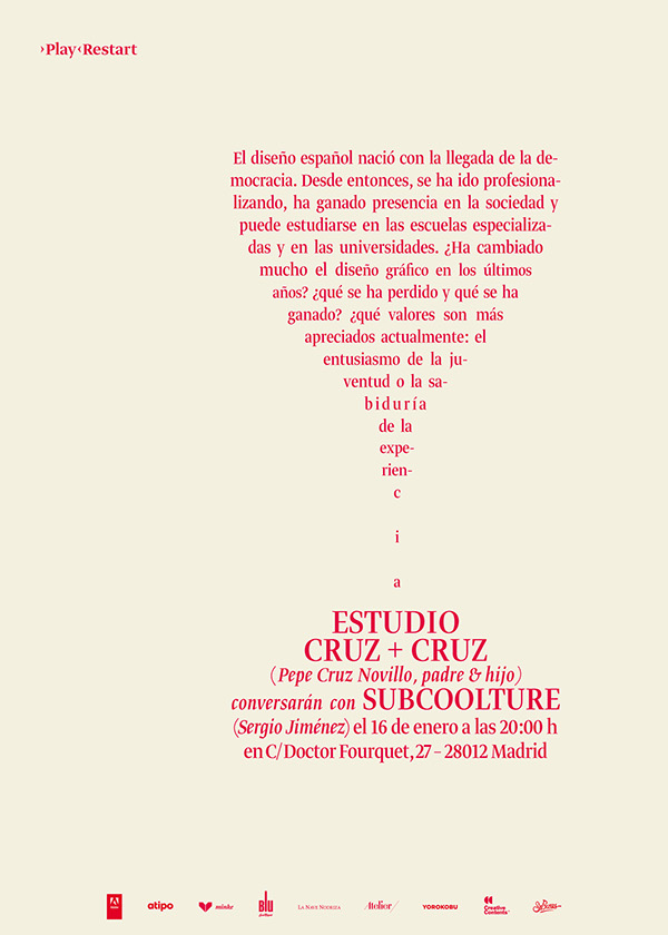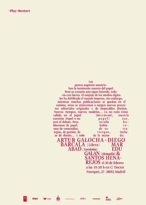 ›Play‹Restart Contributed by Shiva Nallaperumal on Dec 27th, 2014. Artwork published in 2014. Source: atipo.es Atipo. License: All Rights Reserved. Identity for ›Play‹Restart, a design event that aims to create dialogue between design professionals by giving the word precedence over the image. Source: atipo.es Atipo. License: All Rights Reserved. Source: atipo.es Atipo. License: All Rights Reserved. Source: atipo.es Atipo. License: All Rights Reserved. Source: atipo.es Atipo. License: All Rights Reserved. Source: atipo.es Atipo. License: All Rights Reserved. Source: atipo.es Atipo. License: All Rights Reserved. Source: atipo.es Atipo. License: All Rights Reserved. Source: atipo.es Atipo. License: All Rights Reserved. Typefaces More about Greta DisplayGet Greta Display Formats Branding/Identity (8299) Posters/Flyers (5652) Topics Event (3147) Graphic Design (2963) Designers/Agencies Atipo (2) Tagged withsimple (60)type fit to shape (151)skulls (109)arrows (742)guillemets («») (182)metallic foil (354)strike-through (67)image made with type (154)stationery (798)cropped type (493)Spanish (language) (800)exclamation mark (!) (352)series (1145) Artwork location Spain (1034) Gijón (2) In SetsStuff (Tom Lucas) (10)Jessica's Set (Jessica Levine) (15) Post a comment Name Email – will not be published Website Your response Submit Comment More in Graphic Design Toormix New Papers2009ToormixContributed by Florian Hardwig Yarron Felderc. 2018Yarron FelderContributed by Yarron Felder Here Creative2025Here CreativeContributed by Teguh Arief Sponsor More in Branding/Identity Lido Sounds visual identityc. 2023HFA StudioContributed by Giulia Boggio Canton of Bern corporate design (2020)2020NoordJonny WüthrichContributed by Nikolai Arnaudov Union Spacesc. 2025Two Times ElliottContributed by Order Type Foundry Staff Pick Precision websiteContributed by Emtype Foundry More Fonts In Use Fulbright University Vietnam2019unknownContributed by Darden Studio Staff Pick Die erste Polka, Hanser Verlag edition1975Klaus DetjenContributed by Stephen Coles Staff Pick Qreative Kontent2015République StudioContributed by République Studio Staff Pick bauhaus now magazinec. 2019Stan HemaFabian Maier-BodePeer HempelContributed by Fabian Maier-Bode Staff Pick Heroes by Joe McGinniss (Viking Press, 1976)1976Neil StuartContributed by Florian Hardwig Staff Pick California license plate (script, 1993–)1993unknownContributed by Stephen Coles Staff Pick La Bâtie Festival de Genève2018Twice StudioContributed by Swiss Typefaces Staff Pick Mussenlust2018Karen PolderContributed by Karen Polder Staff Pick