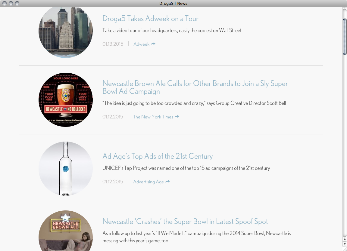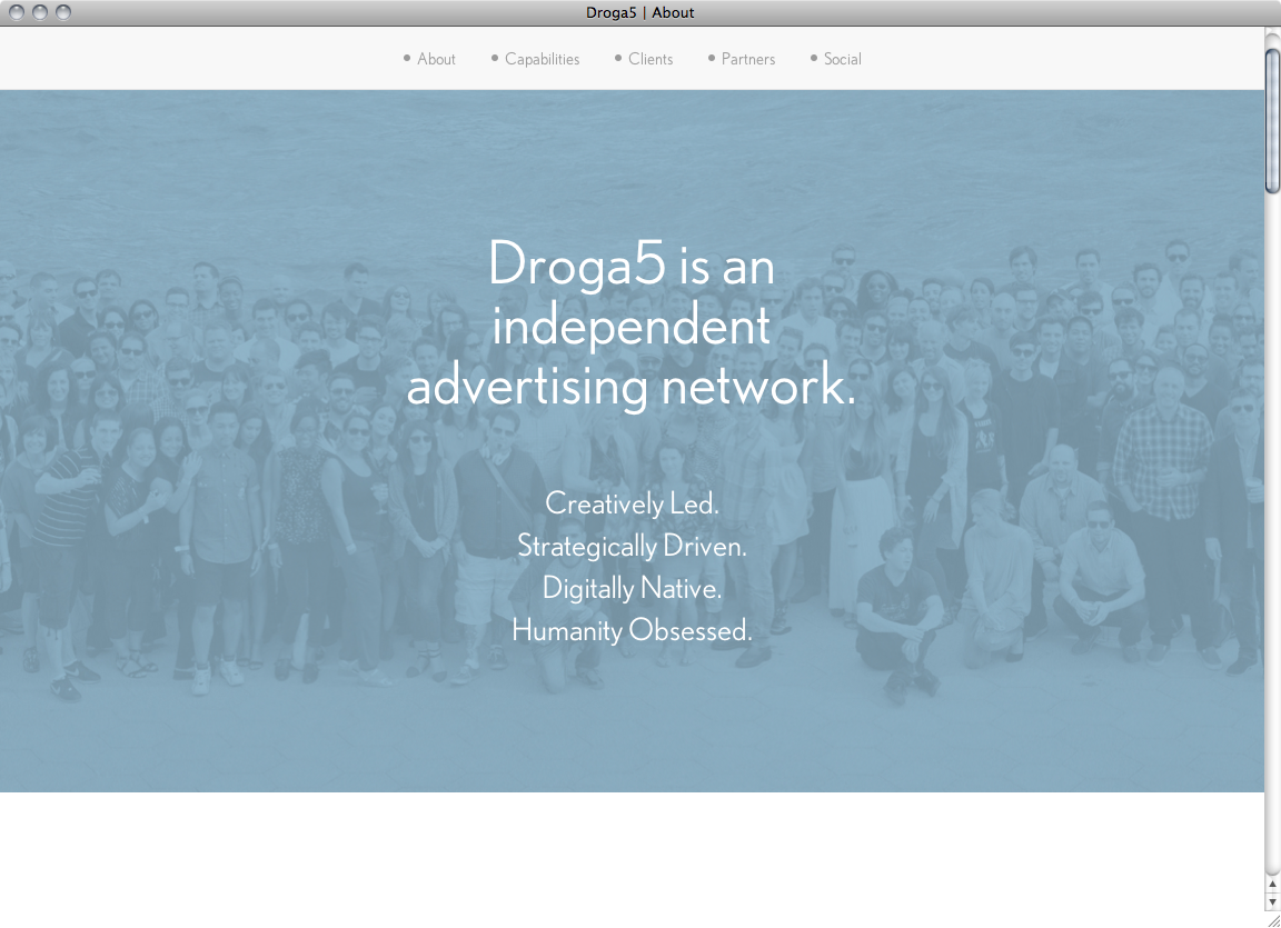 Droga5 website Contributed by Webtype on Jan 15th, 2015. Artwork published in 2014. Source: droga5.com License: All Rights Reserved. The New York based global advertising agency Droga5 uses exclusively Nobel for its website matching the airy overall appearance of the online portfolio. Source: droga5.com License: All Rights Reserved. Source: droga5.com License: All Rights Reserved. Source: droga5.com License: All Rights Reserved. Source: droga5.com License: All Rights Reserved. Typefaces More about Nobel (Frere-Jones)Get Nobel (Frere-Jones) Formats Web (5623) Topics Graphic Design (3009) Designers/Agencies Droga5 (3) Tagged withadvertising agencies (23)type in a circle (604)one typeface (1753)portfolios (772)webfonts (449) Artwork location United States (9922) New York City (2914) In Setsportfolio (Fletcher Boland) (8)La Escapada (Katharina Gallo) (10)Webtype (Webtype) (241) Post a comment Name Email – will not be published Website Your response Submit Comment More Nobel (Frere-Jones) in use Modern Address Design address numbersContributed by Stephen Coles Staff Pick Readymag Newsletter2013Anton HerasymenkoReadymagContributed by Webtype Staff Pick Readymag: 2013 Mags of the Year2013Anton HerasymenkoReadymagContributed by Stephen Coles Sponsor More in Graphic Design New Year’s greetings from Kontext Kommunikationc. 2020Kontext KommunikationContributed by Kontext Kommunikation Font Magazine 006: “Cuba” articleConor MangatPhoto(s) by Stephen Coles on Flickr. Staff Pick Repair Revolution! poster2023Dafi KühneContributed by Dafi Kühne Lark Design × WithPrint Christmas cards2020Lark StudioContributed by F37® More in Web Form Follows Function – flip clock2013Jongmin KimContributed by Stephen Coles StratusGrid websitec. 2018unknownContributed by JAF Reclaim Award2019NeoactioContributed by WELTKERN® Typefaces Nature Morte2023Studio OmeletteCécile DumetierContributed by Production Type More Fonts In Use Nico, Gianni, Frank & Maurizio – Canti D’Innocenza, Canti D’Esperienza1973Gian Carlo GreguoliContributed by Matthijs Sluiter Staff Pick South Korean road signsc. 2009Studio DumbarHong-ik University SeoulContributed by Pieter van Rosmalen Staff Pick Spike Island Open2013James LangdonContributed by Pierre Pané-Farré Staff Pick Can at Musikhalle Hamburg concert poster1973Günther KieserContributed by Florian Hardwig Staff Pick