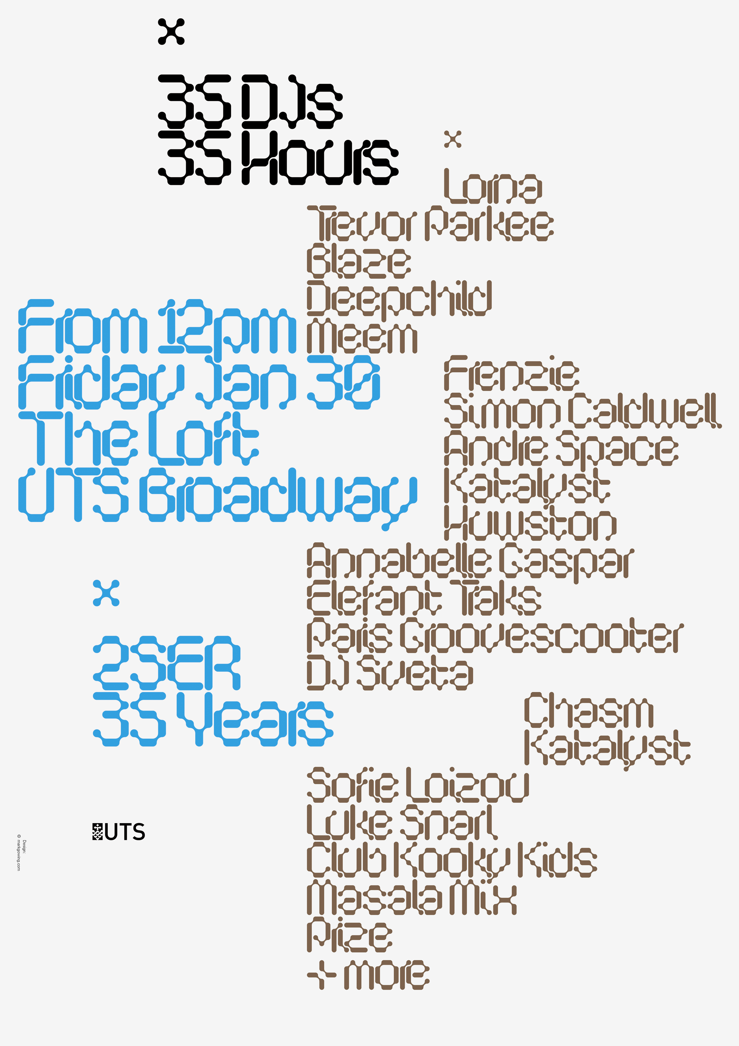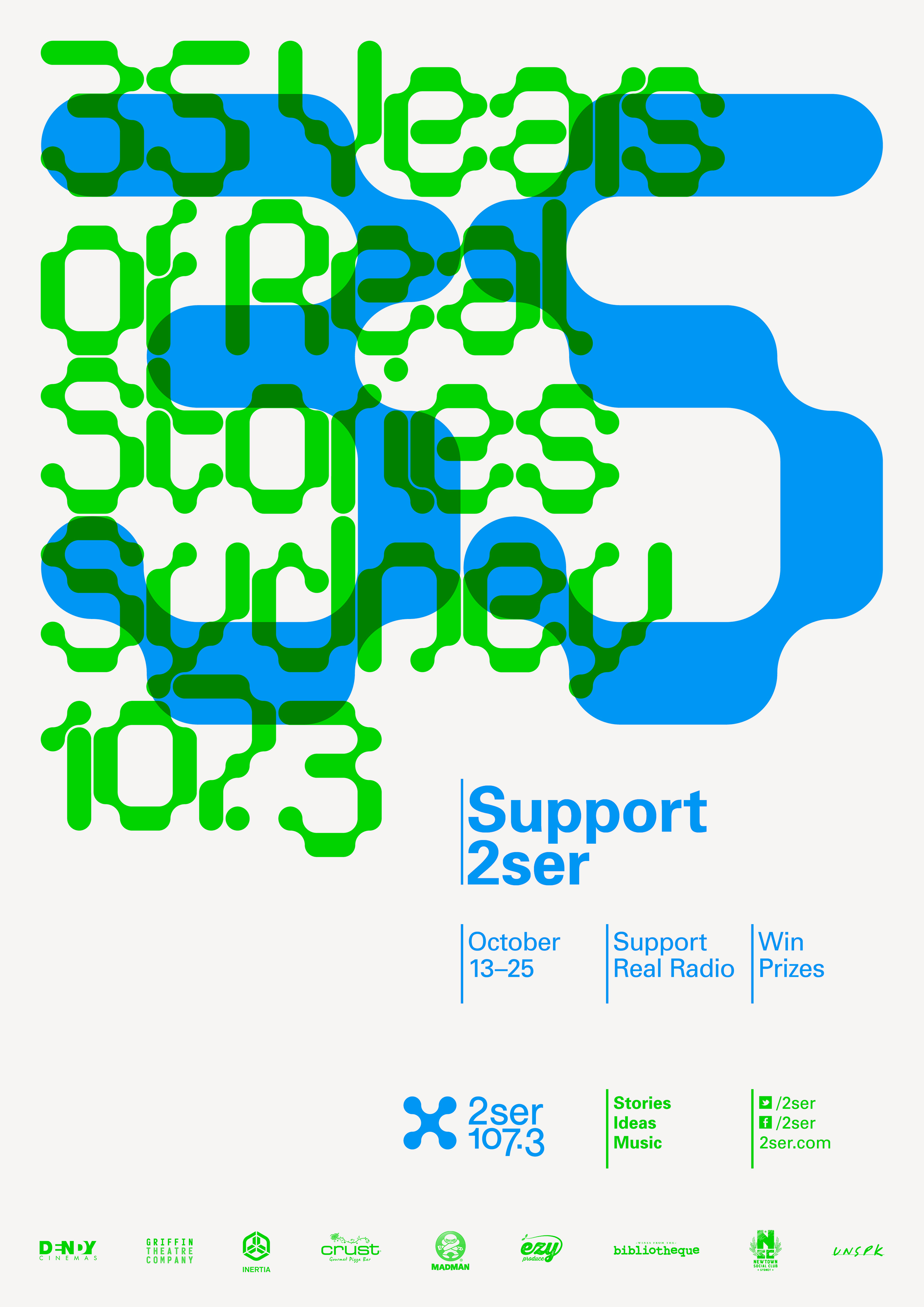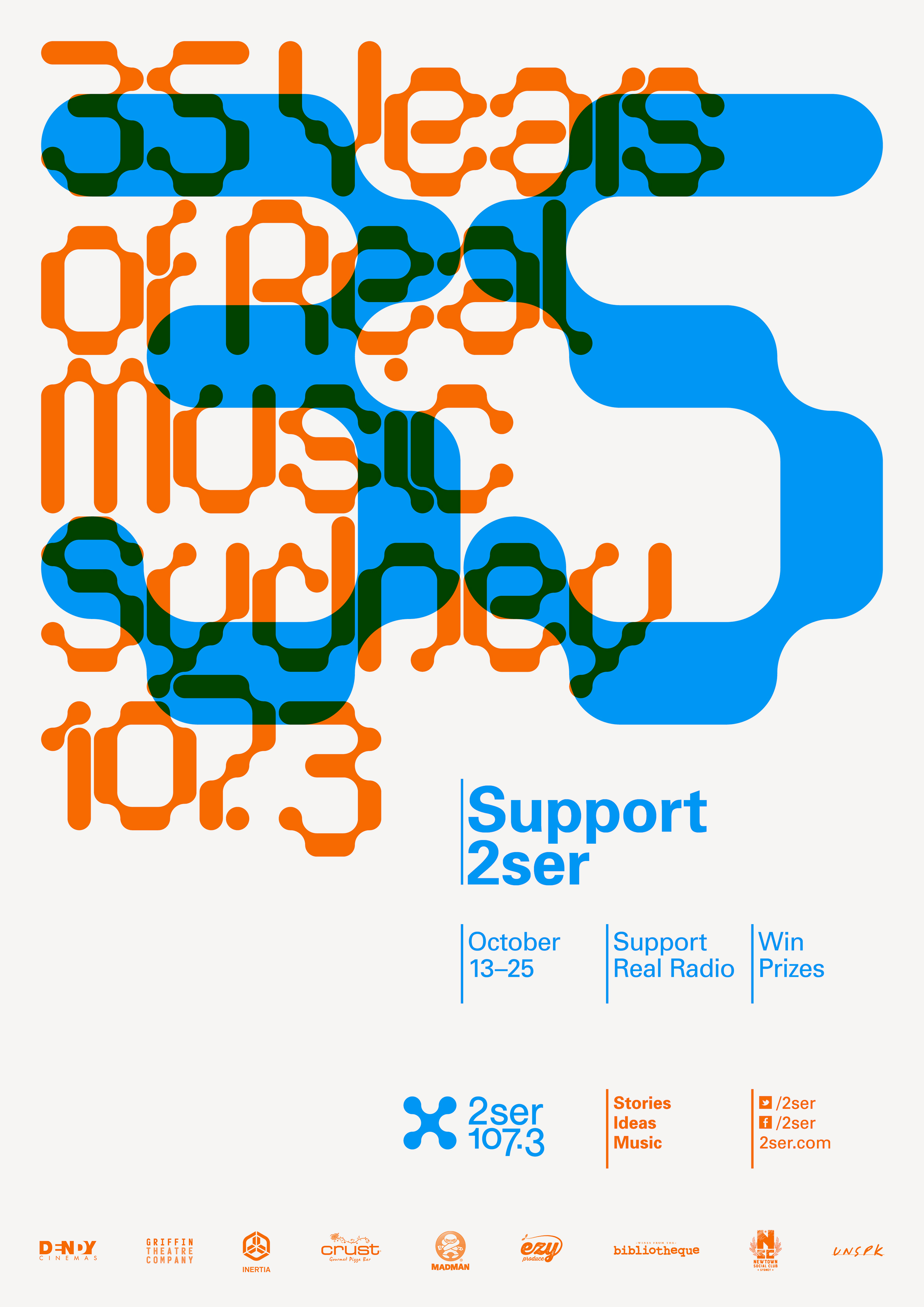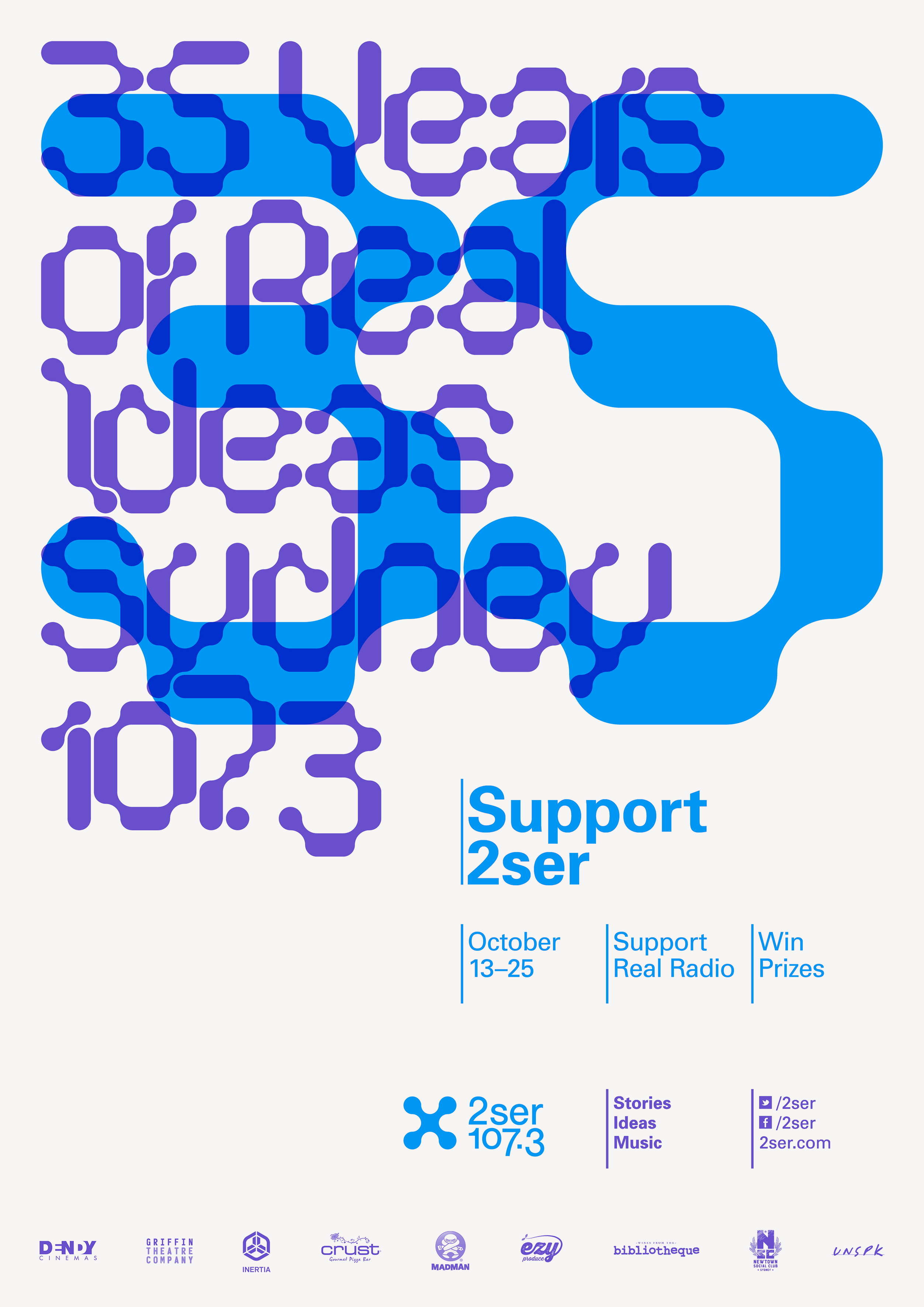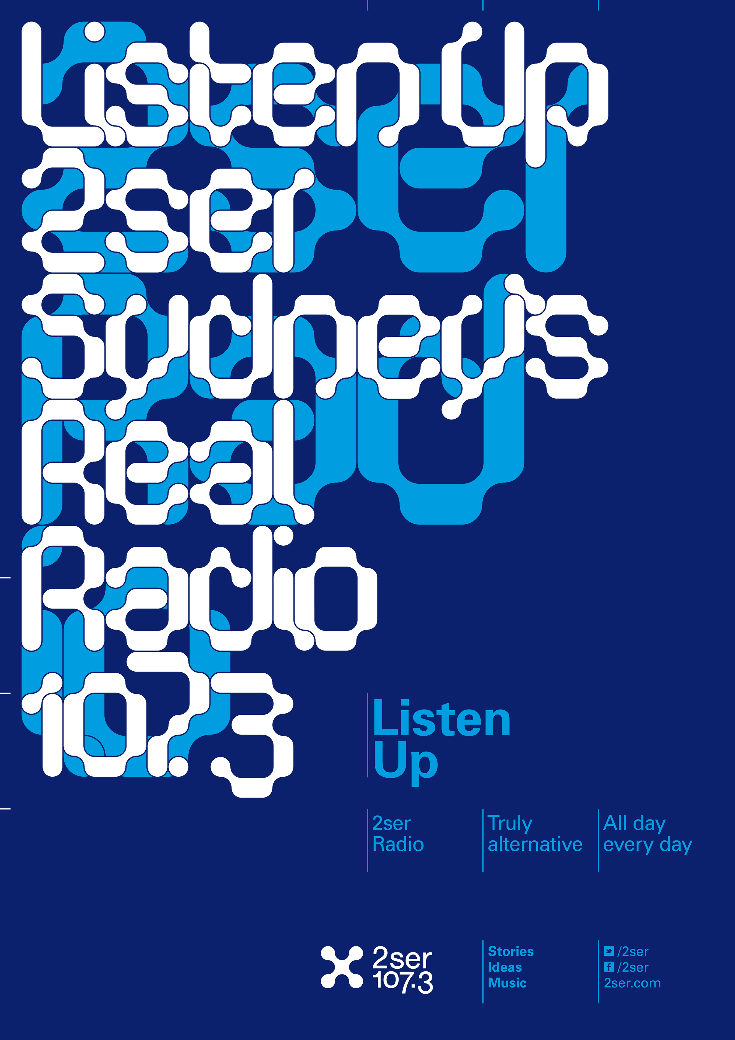 Promotional posters for 2SER underground radio station. Formist Serous is used with interlocking geometry. Type is layered at proportional sizes to create exact overlaps and interlocking relationships. Partnered with Univers.