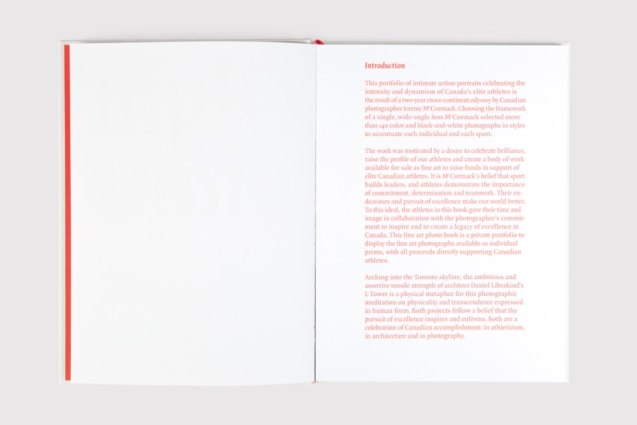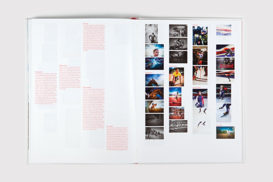 The 160-page book features more than 140 colour and black and white photographs, in styles that accentuate each individual and each sport. The cover and box is nod to Canada’s identity in both colour and dimension – the format is such that when laid out next to each other, the red boxes on either side of the white book would equal the proportions of the official Canadian flag. The book was curated by combining similarly themed images from different sports rather than by athlete – each athlete is featured with a portrait and several action shots but spread through the entire book, equally and without hierarchy.” — Bruce Mau Design