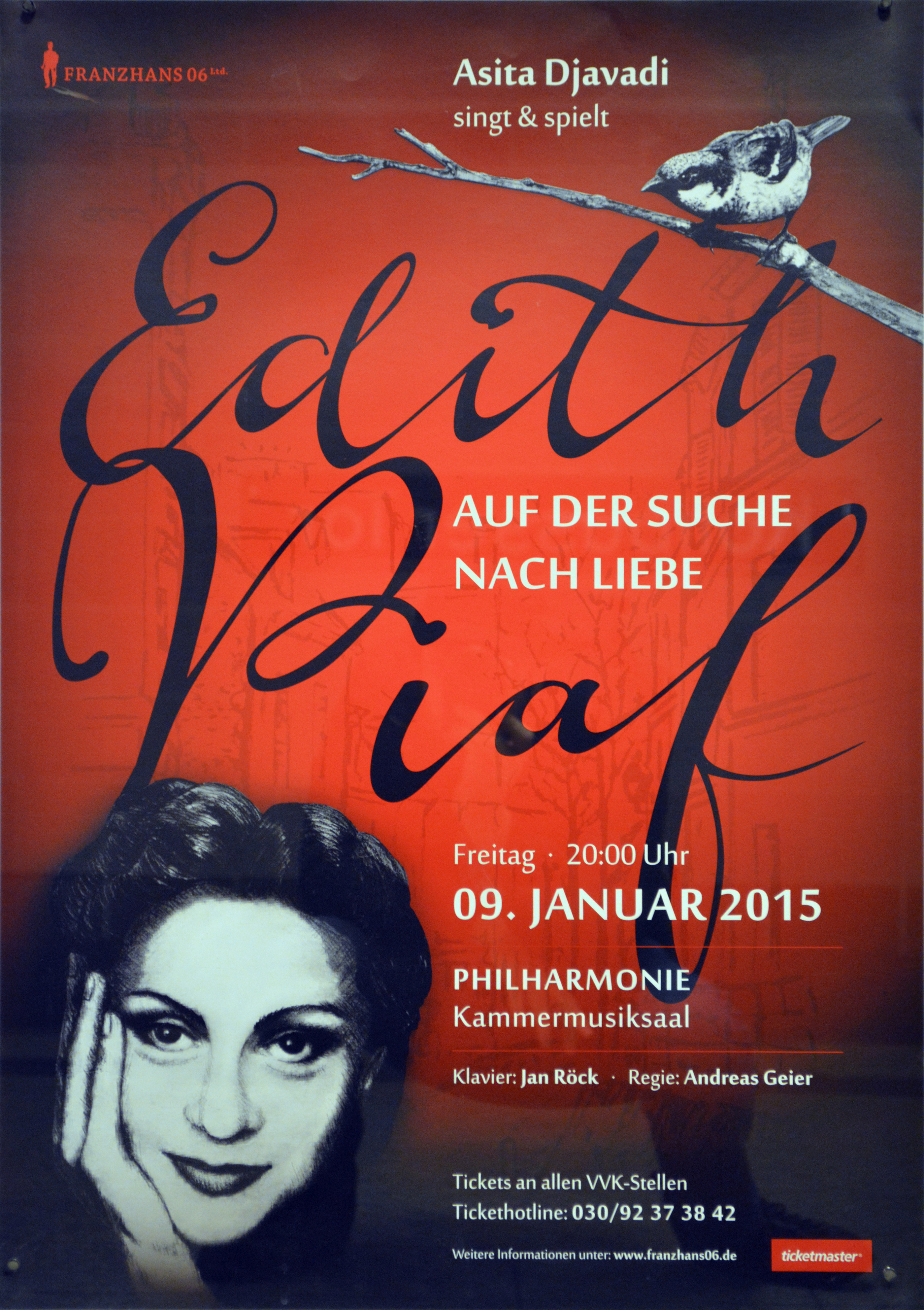 “Edith Piaf” is based on Emily Conners’ bestseller release Bombshell (2012), but with smoothened contours and a few customizations. Bombshell’s ‘t’ with its bar floating above the stem was obviously considered too quirky. For an ad-hoc modification, the clash of ‘i’ dot and ‘t’ bar is unsatisfactory. The smaller type in white is the Latin part of Sakkal Majalla, an Arabic typeface that comes bundled with Microsoft Windows.