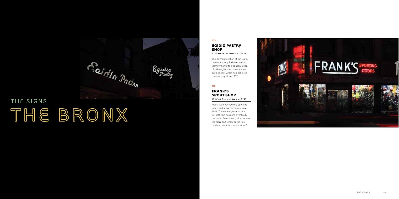 Modern Good designed the book, rounding the corners of Tarzana for the cover and outlining it in neon fashion for chapter openers, such as “The Bronx” title below.