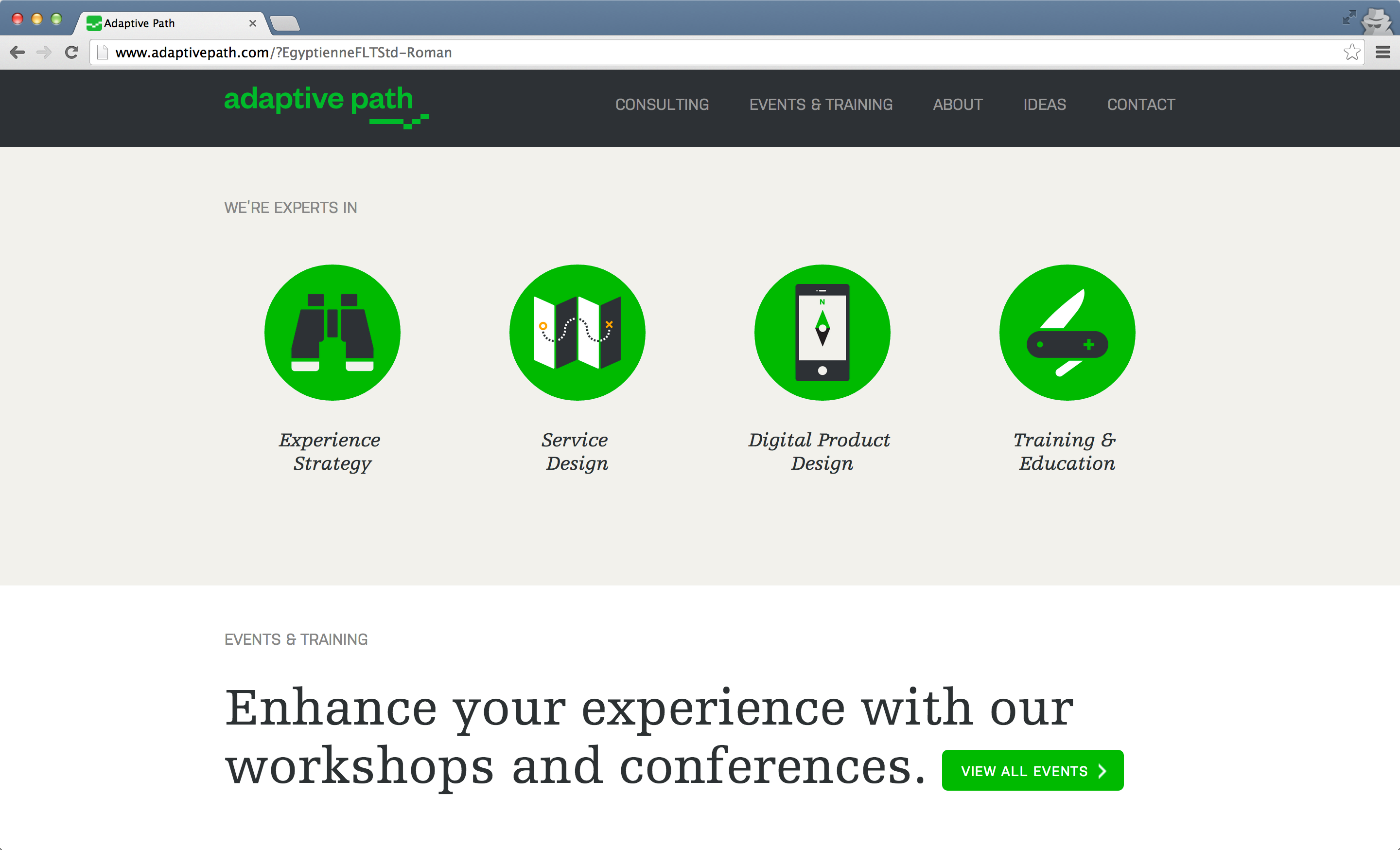 Adaptive Path Contributed by Duncan Brown on Feb 28th, 2015. Source: www.adaptivepath.com http://www.adaptivepath.com/. License: All Rights Reserved. Source: www.adaptivepath.com Photo: Duncan Brown. http://www.adaptivepath.com/. License: All Rights Reserved. Typefaces More about Egyptienne FGet Egyptienne F Formats Web (5557) Topics Services (1537) Post a comment Name Email – will not be published Website Your response Submit Comment More Egyptienne F in use anCnoc Highland Single Malt Scotch WhiskyContributed by Stephen Coles Staff Pick Modernités plurielles. 1905–1970 catalog2013PrototypeAurore JanninLaurent PinonContributed by Swiss Typefaces Otto’s Burgerc. 2015HochgestaltenContributed by Lecter Johnson Sponsor More in Services Reklamekollektivet website2013ReklamekollektivetContributed by Thomas Dahl Birkeland The Jacky Winter Group2013Patrick CampbellThat MobContributed by Stephen Coles Staff Pick Rapid Dyne Management website2023Revival MediaContributed by Jonas Pelzer House Captain websitec. 2023nokoFionn O’NeillContributed by Simon Riisnæs Dagfinrud More in Web Dixneufcentquatrevingtsix websitec. 2022République StudioContributed by Store Norske Skriftkompani Piccalio2025Cait GoodmanContributed by Cait Goodman Sveriges Skolledare2023Oké DesignContributed by TypeType Metron Architektur identity2014Baldinger•Vu-HuuContributed by BVH Type Staff Pick More Fonts In Use An Atlas of Commoning2018Heimann + SchwantesContributed by Florian Hardwig Staff Pick In Between2013Magpie StudioContributed by Stephen Coles Staff Pick The Great Discontent, Issue One2014Frank ChimeroAnotherContributed by Stephen Coles Staff Pick Clip Books of Line Art, Volk (1975)1975Harry Volk Jr. Art StudioPhoto(s) by Bart Solenthaler on Flickr. Staff Pick