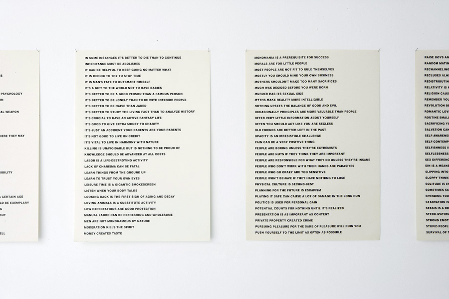 Although Holzer’s first works employed the commercial technique of photolithography and appeared on telephone booths and walls around the city, she has since reissued the same or similar pithy, ironic, and acerbic declarations, observations, and aphorisms in a variety of formats and has placed them in countless venues.