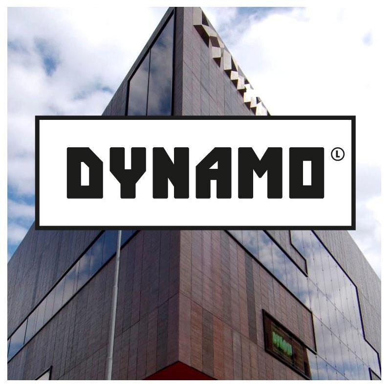 The official logo for the Dynamo center is less … dynamic, omitting the swash extensions so the word fits in a flat rectangle. Corners were also softened in the mark.