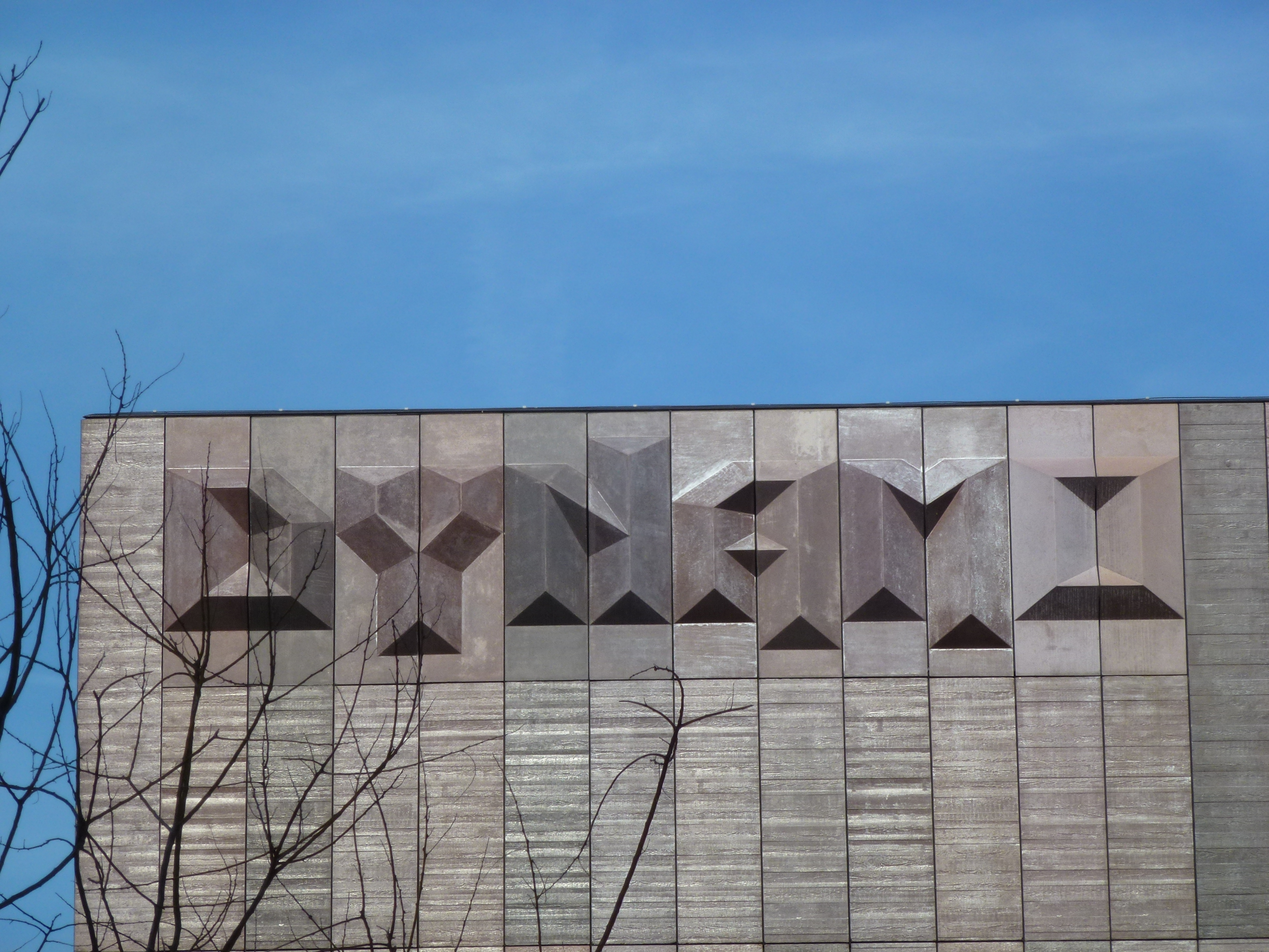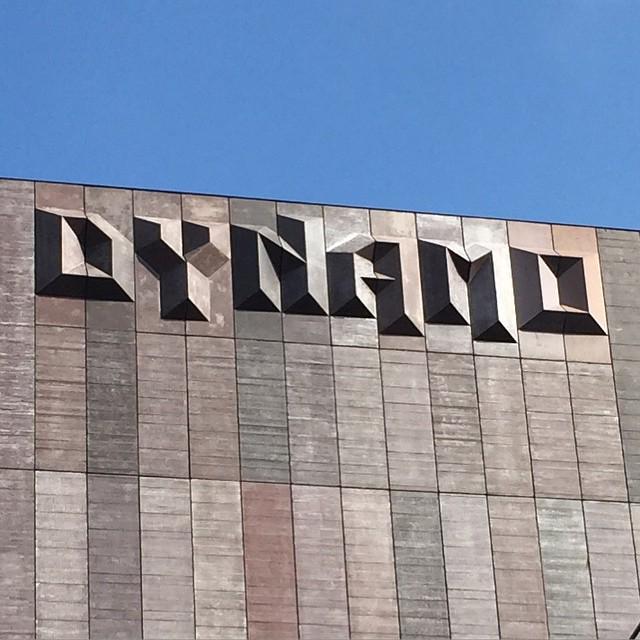 The name protrudes from the building in faceted, blocky letters that are unmistakably based on ITC Pioneer. The typeface’s shadow is gone and some strokes and widths modified, but otherwise it’s quite felicitous how nicely the modularity of Pioneer matches the grid of the façade segments, with its angles echoed in the faceting. The letters with strokes that extend beyond the baseline and capline (‘Y, N, A, M’) are not found in the digital version of ITC Pioneer, but they were in Tom Carnase and Ronne Bonder’s 1970 original, perhaps most famously seen in the logo for Shaft.