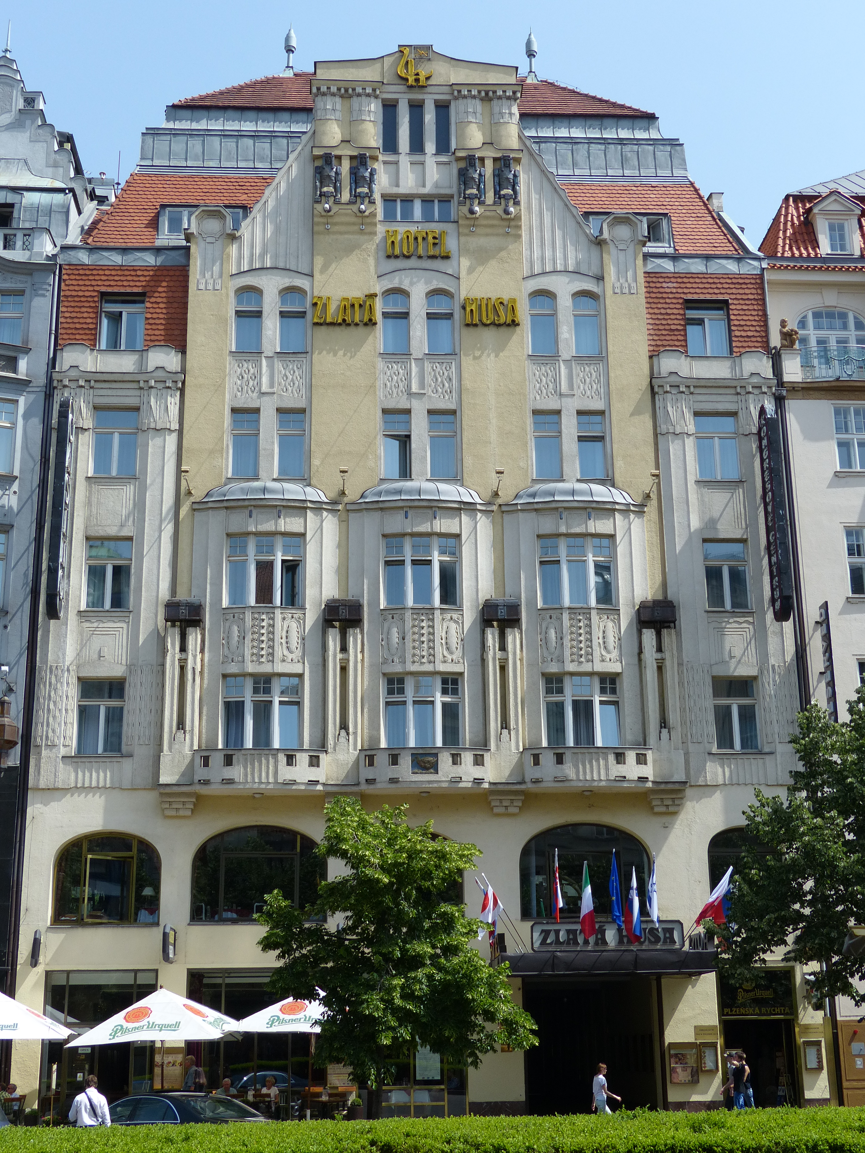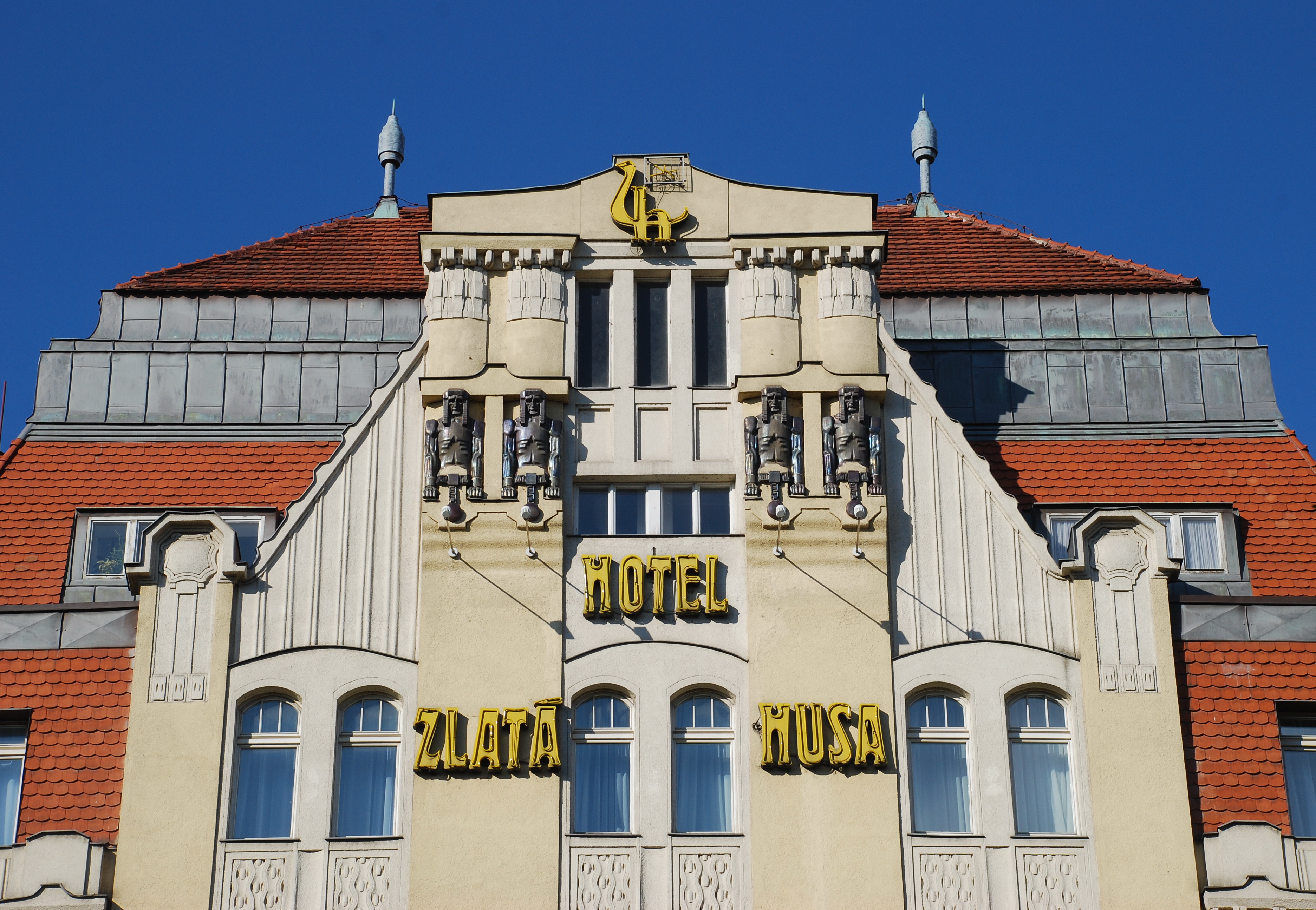 Hotel Zlatá Husa (“Golden Goose”) at Wenceslas Square in Prague was designed by architect Emil Králíček together with Matěj Blecha in 1909–10. The typeface used for the neon sign is a match in period: Herold was issued in 1901. Note the monogram at the top: ‘Z’ and ‘h’ form a goose.