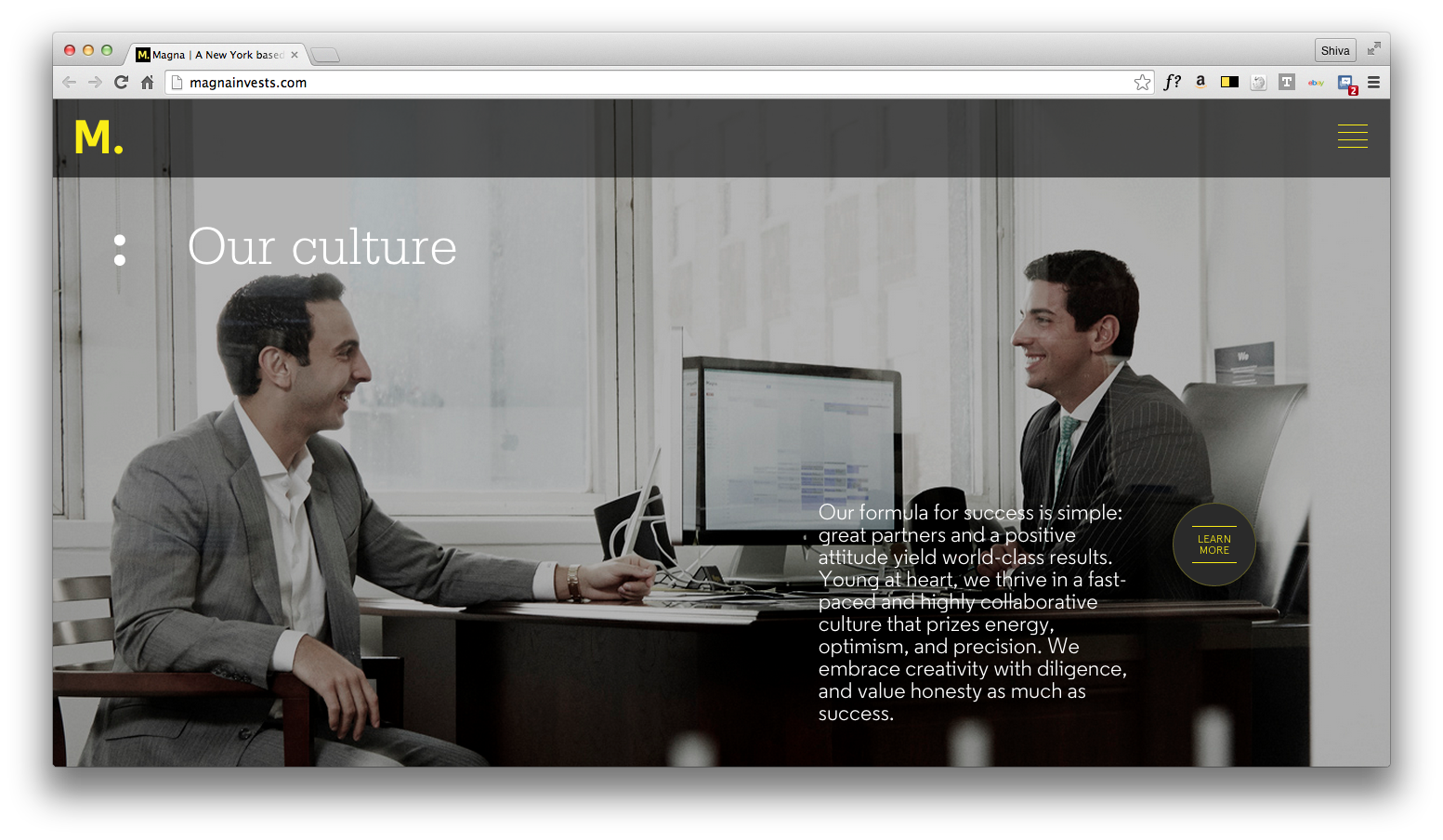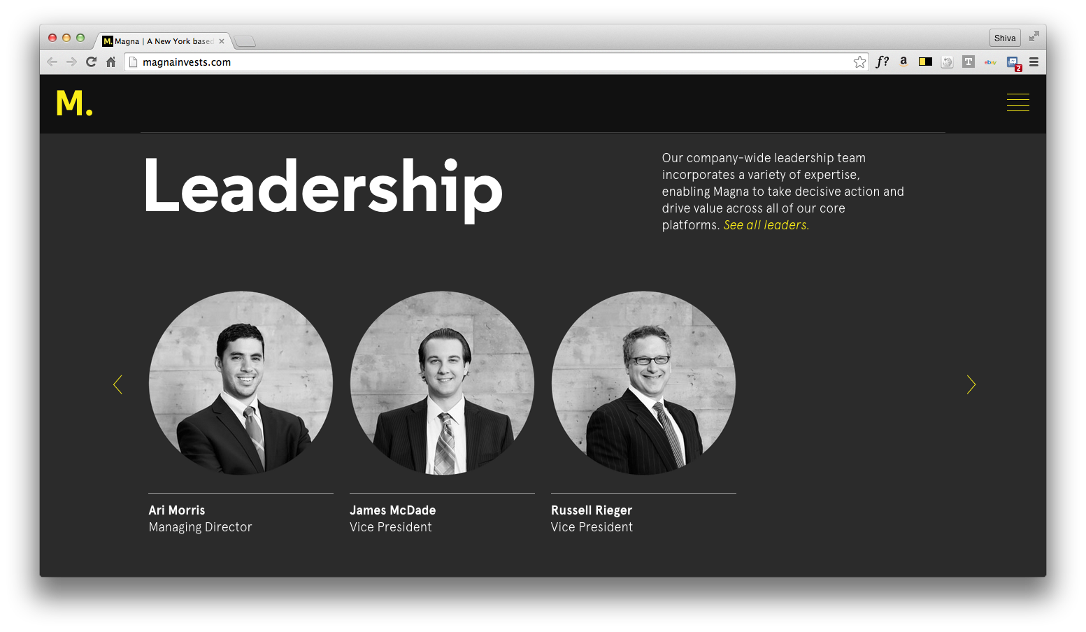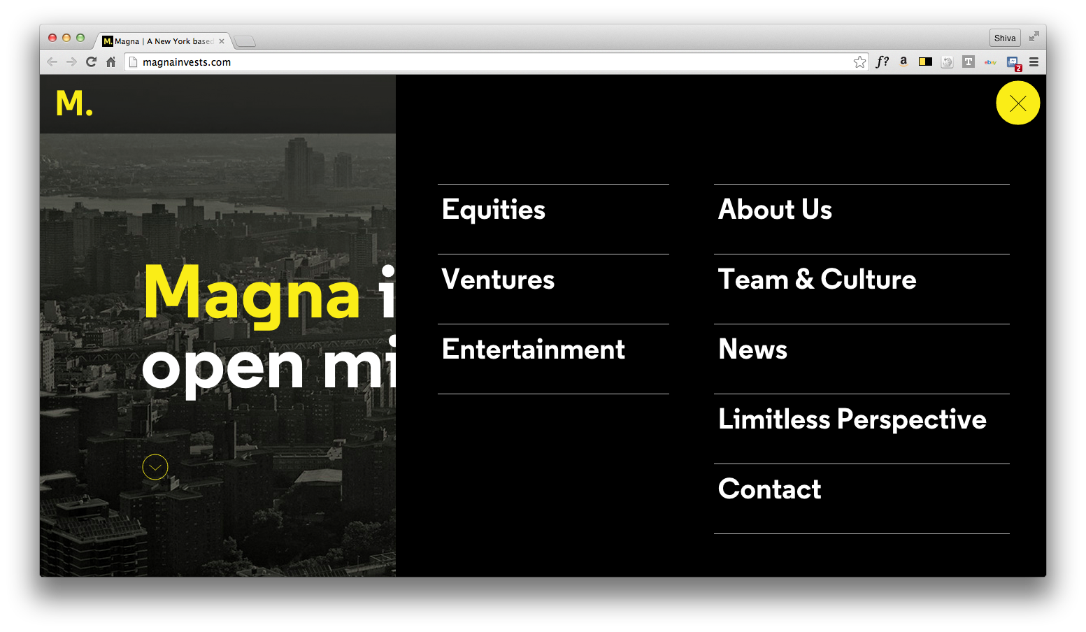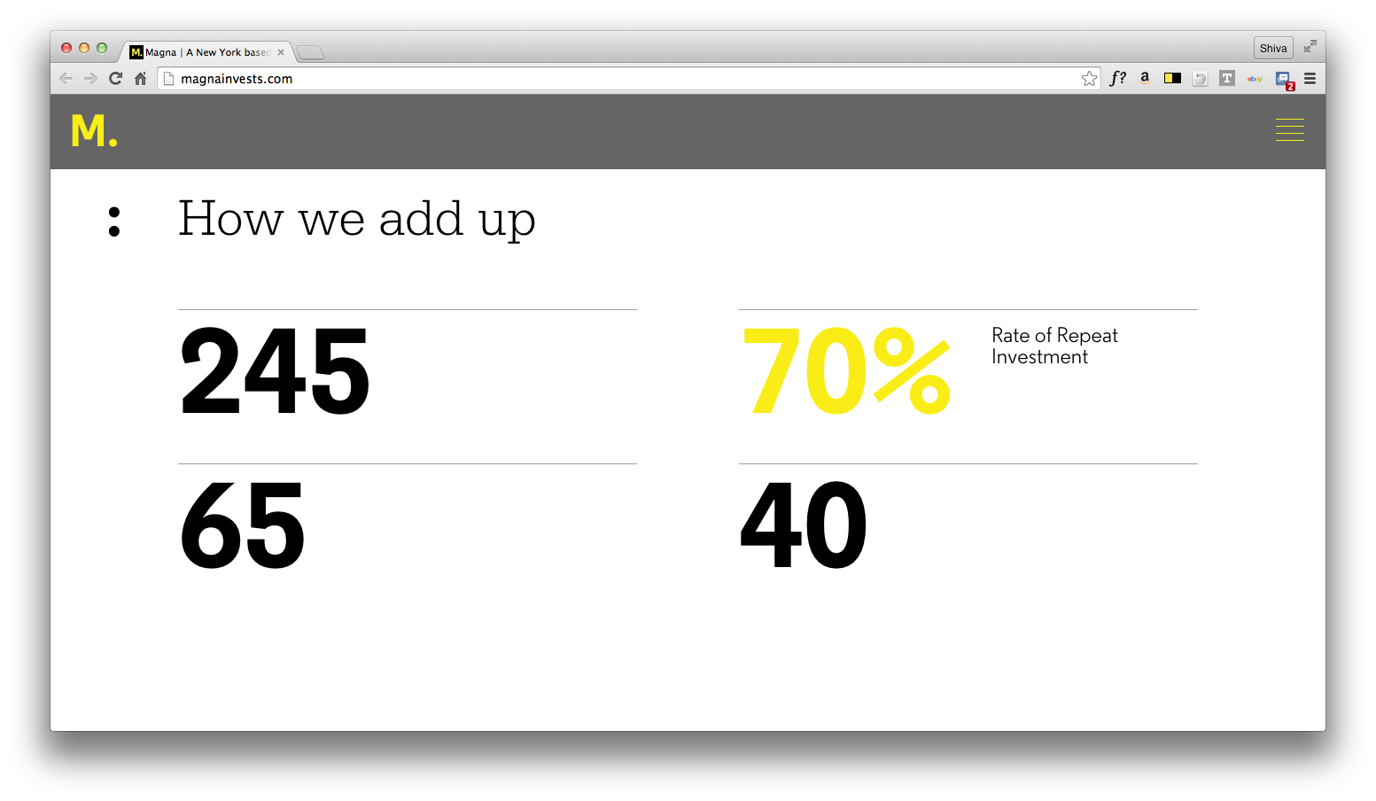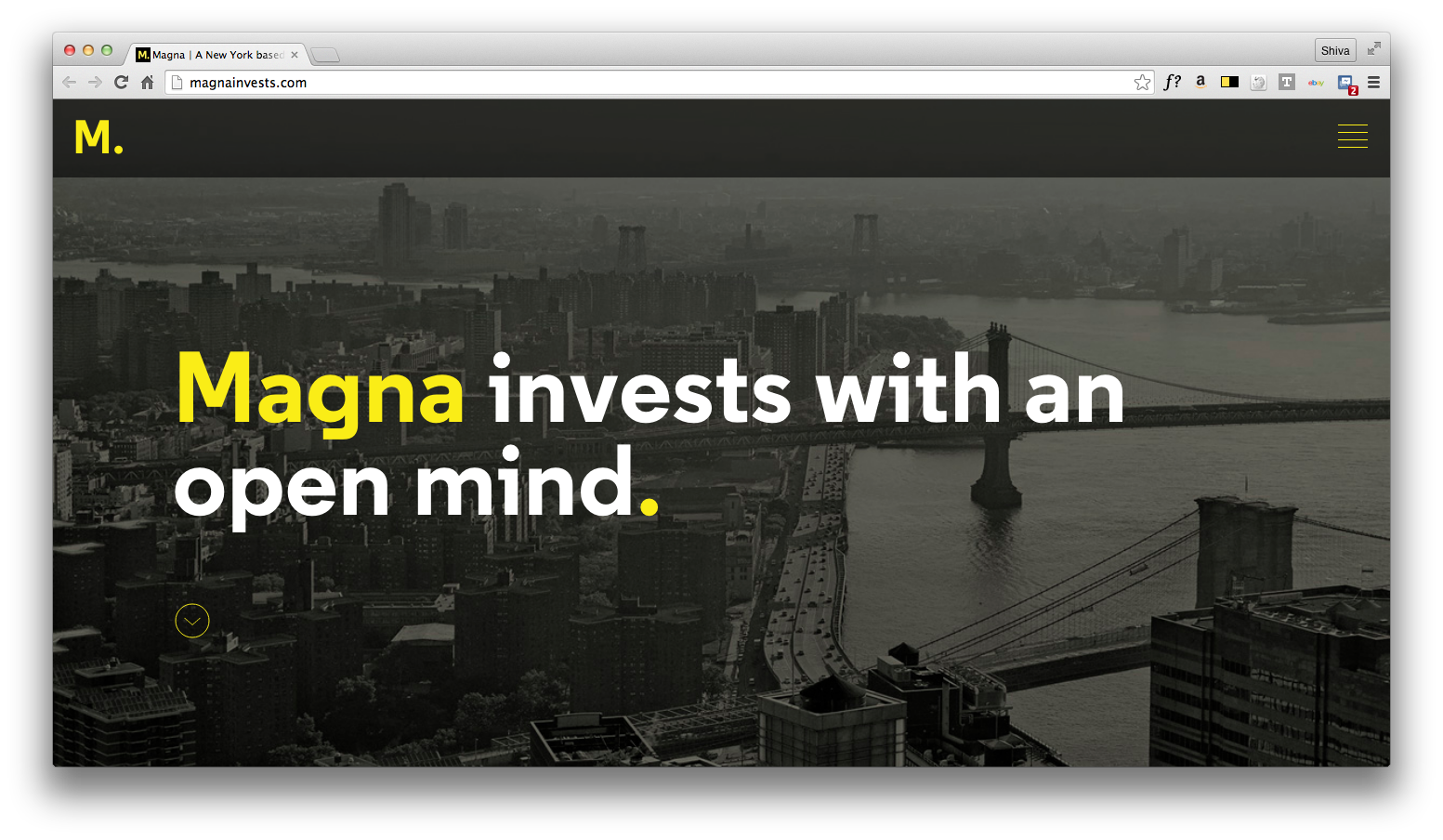Magna Invests Contributed by Shiva Nallaperumal on Mar 20th, 2015. Artwork published in 2015. Source: magnainvests.com Magna. License: All Rights Reserved. Magna’s site is set in an interesting combination of A2’s Regular, Adrian Frutiger’s Serifa and the darling of the web, Aperçu. Source: magnainvests.com Magna. License: All Rights Reserved. Source: magnainvests.com Magna. License: All Rights Reserved. Source: magnainvests.com Magna. License: All Rights Reserved. Source: magnainvests.com Magna. License: All Rights Reserved. Source: magnainvests.com Magna. License: All Rights Reserved. Source: magnainvests.com Magna. License: All Rights Reserved. Typefaces More about A2 RegularGet A2 RegularMore about AperçuGet AperçuMore about SerifaGet Serifa Formats Web (5516) Branding/Identity (8287) Topics Business/Finance (762) Designers/Agencies unknown (4082) Tagged withwebfonts (449)responsive (165) Artwork location United States (9771) New York City (2869) In SetsTypefaces (Shauna Buckley) (12)Rowac (Dieter Amick) (30) Post a comment Name Email – will not be published Website Your response Submit Comment More A2 Regular in use Motorola Moto X ad campaign2013Contributed by Stephen Coles Porto city identity (2014)2014Studio Eduardo AiresContributed by Afonso Ribeiro Staff Pick The World Cook website2018Sam MorrisShannon ThomasContributed by Fonts In Use Staff Sponsor More in Business/Finance Innovationsbericht Standortc. 2018CapitaleContributed by Matthijs Sluiter Copper bankingc. 2020Jeff HuntKate HarrisSiren SFContributed by Jeff Hunt Square One District2020VanderbrandContributed by Vanderbrand Ariac. 2024TogetherContributed by Smuss Studio More in Branding/Identity Choice2019A New Kind Of KickContributed by A New Kind Of Kick I Doc. 2015groza.designContributed by Gayaneh Bagdasaryan Hanayu CBD oil2020EIGA DesignContributed by Nikolas Wrobel Stickannc. 2022OOOZContributed by Nikolas Type More Fonts In Use The Book Block / O Miolo do Livroc. 2019itemzeroContributed by Fábio Martins Staff Pick Studio X Amman Workshop Poster2011Contributed by Indra Kupferschmid Staff Pick Taco Mesa2024Studio FuriousContributed by Studio Furious Staff Pick Ways of Being. Advice for Artists by Artists2018BibliothèqueContributed by Florian Hardwig Staff Pick