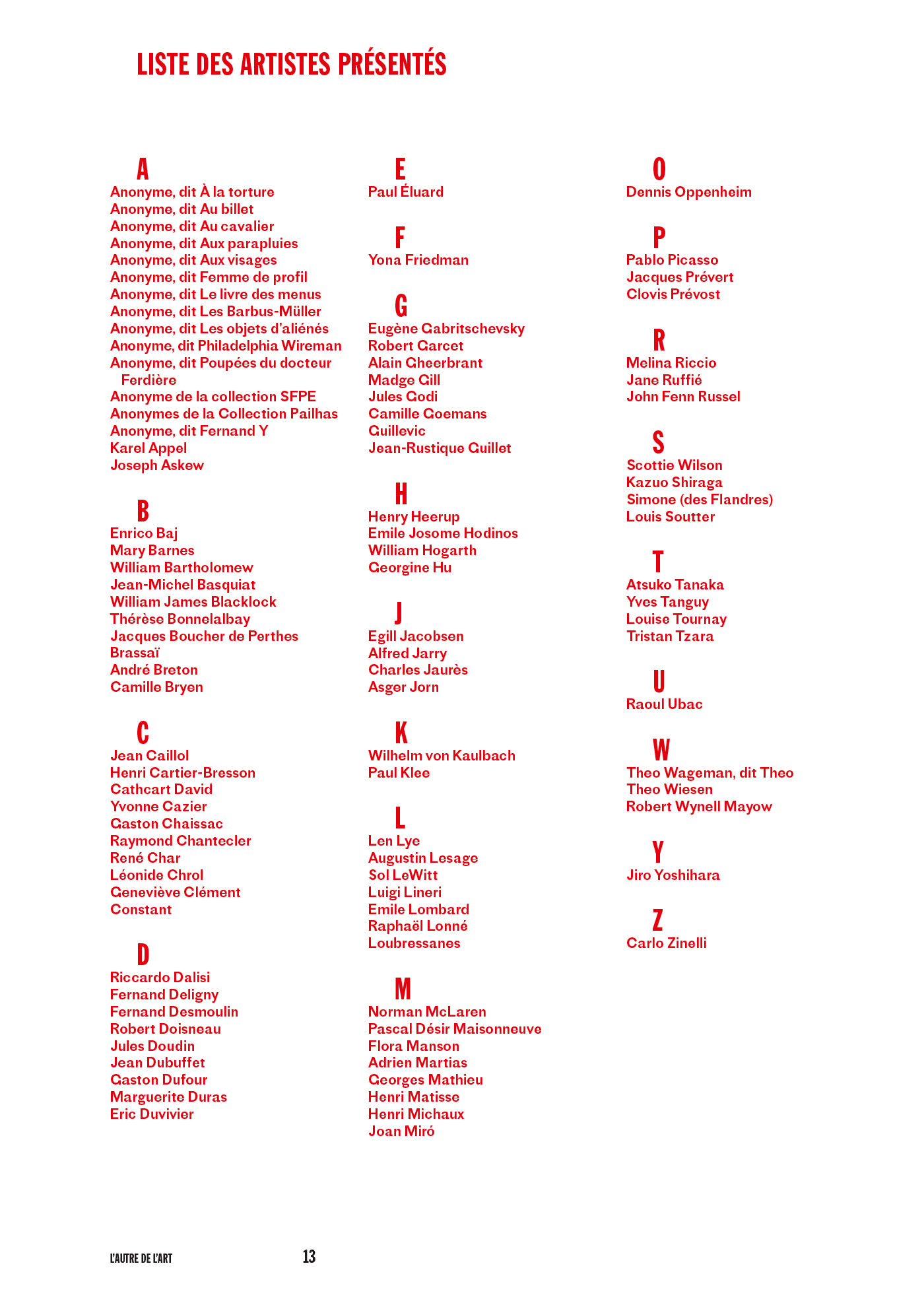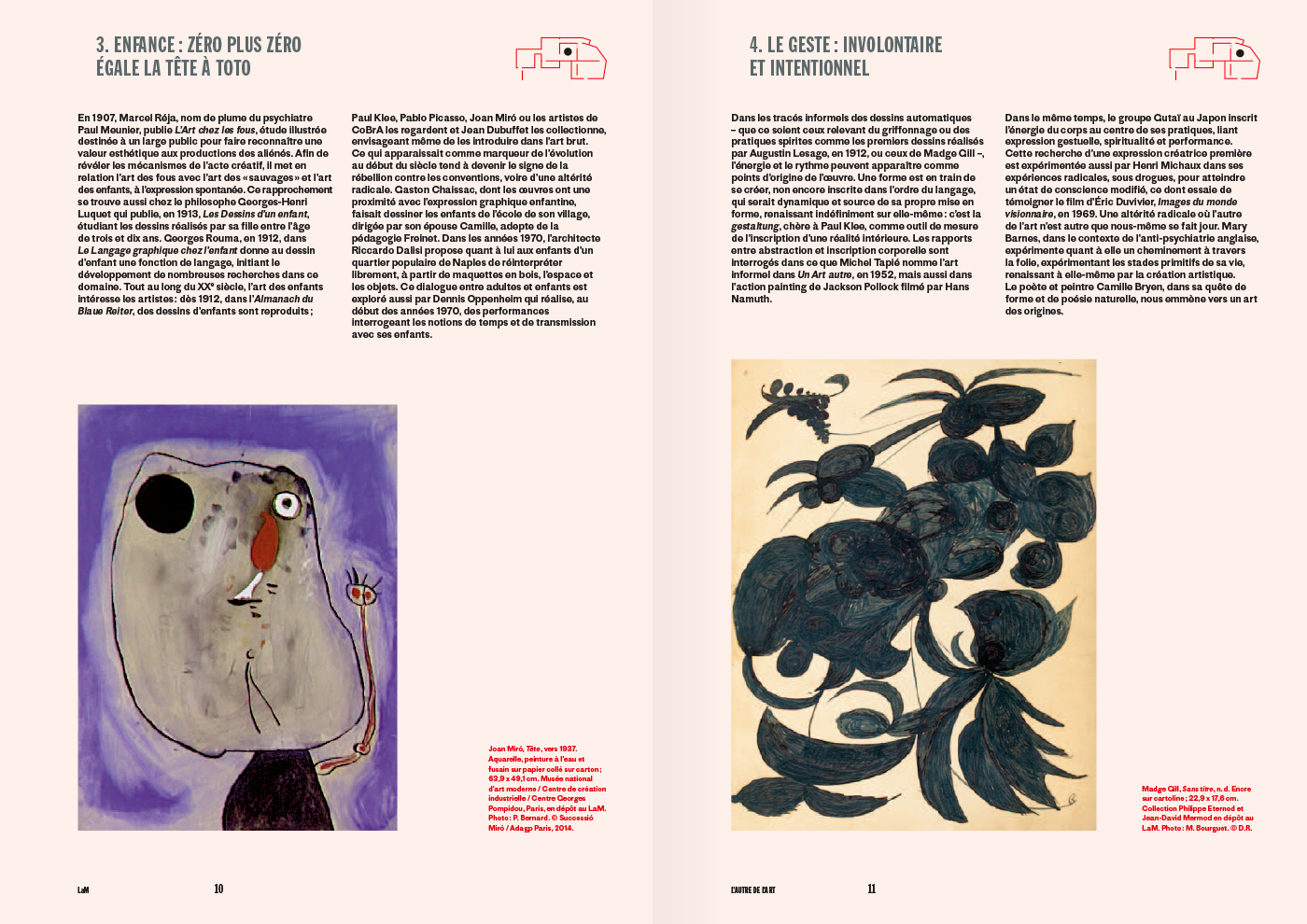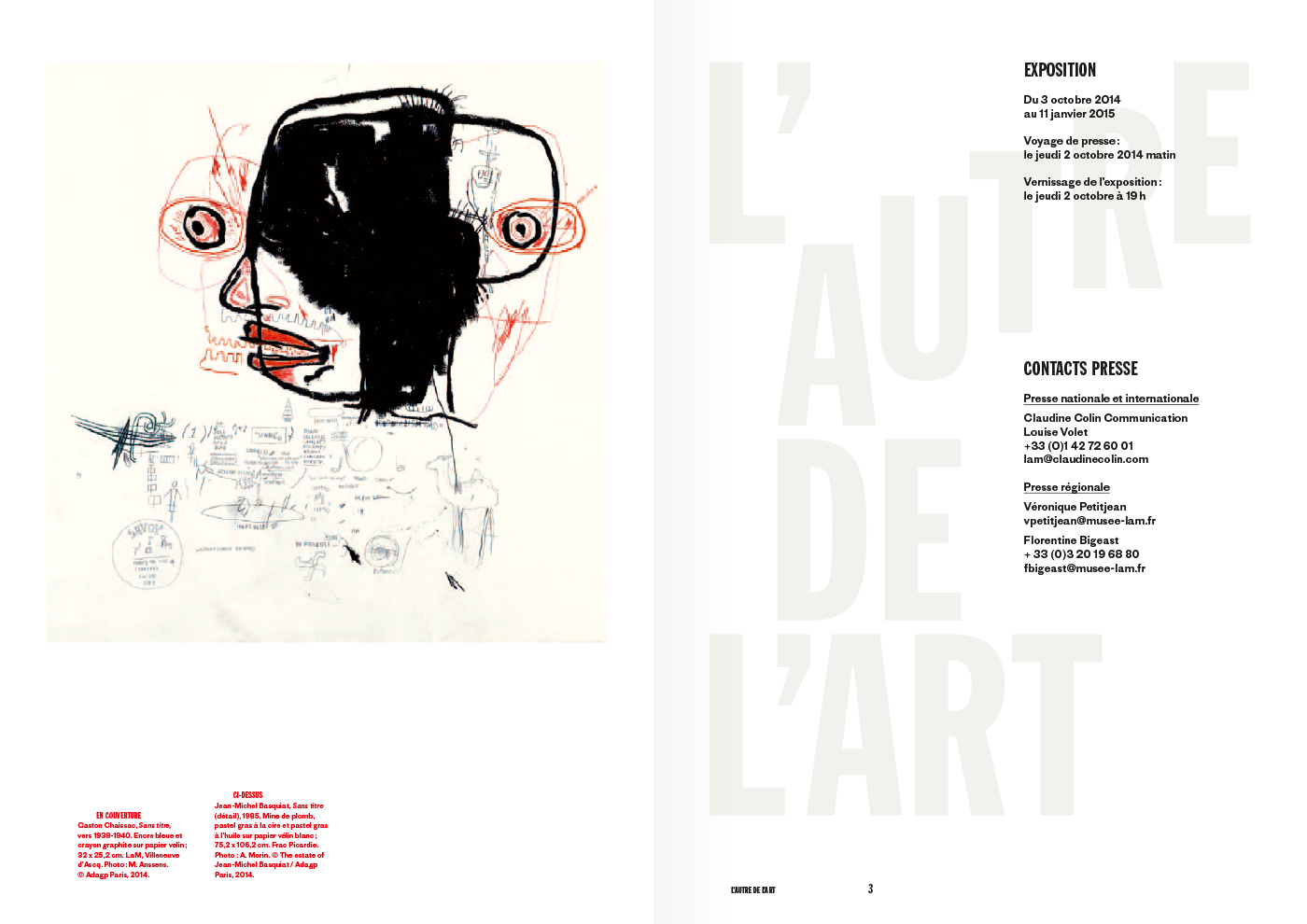 L’Autre de l’art is the first exhibition hosted by the LaM to tackle all three of its specialities – modern art, contemporary art and art brut – in a cross-disciplinary approach encompassing art, literature, ethnology, psychoanalysis, music and cinema. The exhibition intends to show how, in the course of the 20th century and following the constitution of the first collections of so-called primitive arts contemporaneously with collections of the art of the insane and children’s art, the European art world gradually broke away from exploration of a geographical or evolutionist elsewhere and began to ponder its own interiorities and approaches.