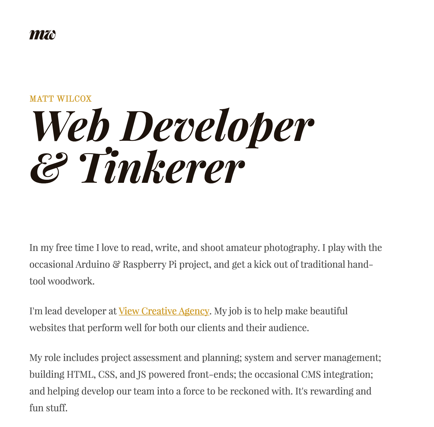 Matt Wilcox Contributed by Noah Chase on Mar 29th, 2015. Artwork published in circa 2015. Source: mattwilcox.net License: All Rights Reserved. License: All Rights Reserved. Menu in all-caps Montserrat Typefaces More about Playfair DisplayGet Playfair DisplayMore about Old StandardGet Old StandardMore about MontserratGet Montserrat Formats Web (5564) Topics Social Media (265) Designers/Agencies Matt Wilcox (1) Tagged withpersonal websites (261) In SetsInspiration (Ethan Waind) (47)bgsc (Angelique Cassell) (5) Post a comment Name Email – will not be published Website Your response Submit Comment More Playfair Display in use Vogue España website2013Contributed by Claus Eggers Sørensen Moore College of Art & Design brandingc. 2020CCADavid A. MooreContributed by Kontour Chidusz magazinec. 2018Stanislaw ZaykowskiContributed by Stanisław Zaykowski Sponsor More in Social Media Space Matters2014Kod & FormChristopher WestContributed by Florian Hardwig Staff Pick Serendipity2014Kyle McDonaldContributed by Shiva Nallaperumal WordPress Lyretail theme header2015Automattic, Inc.WordPressMel ChoyceContributed by Christopher Bentley Random Music Stuffc. 2020Beng Yi Wei DamienContributed by Jeff Ward More in Web Tzegoh2011Thomas Manss & CompanyContributed by Stephen Coles Blog Crystal Bridges Museum of American Artc. 2019Crystal Bridges Museum of American ArtContributed by Darden Studio WeTransfer (2012)2012Contributed by Laura Serra Club 3602020Bureau NuitsContributed by Production Type More Fonts In Use The Terminator Polish movie poster1987Jakub ErolContributed by Stephen Coles Staff Pick Evangelisches Frankfurt2016Jan FamiraContributed by Willerstorfer Font Foundry Staff Pick “Dear Ketel One Drinker” ad campaign2003M&C SaatchiAtomic TypeAlan JarvieContributed by Stephen Coles Blog The True Story of Megaverb2019Rob StensonGoodhertzContributed by Rob Stenson Staff Pick