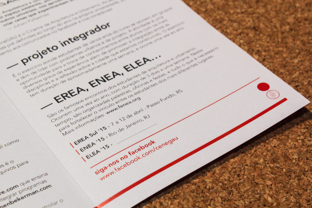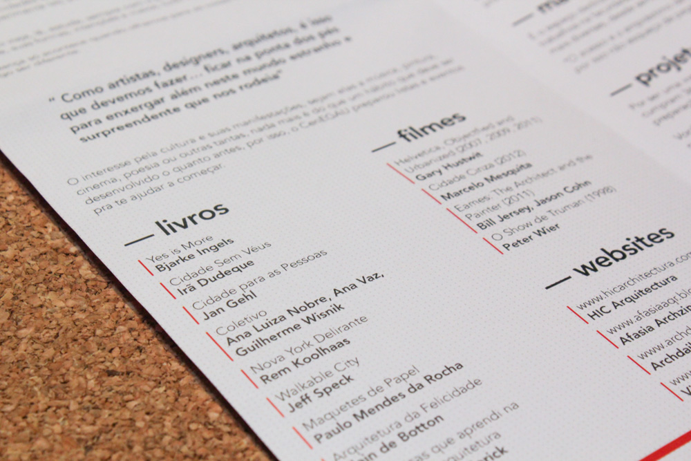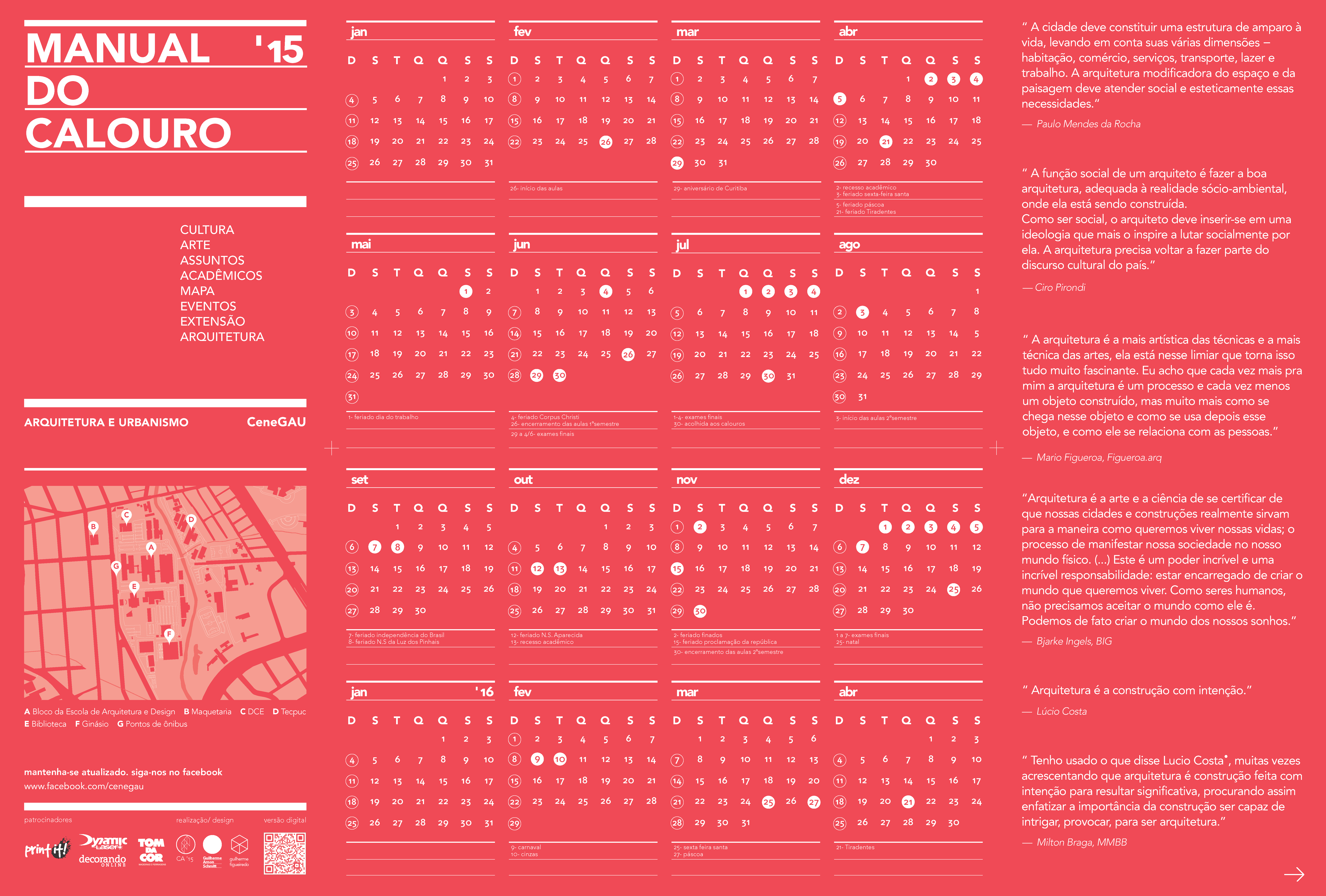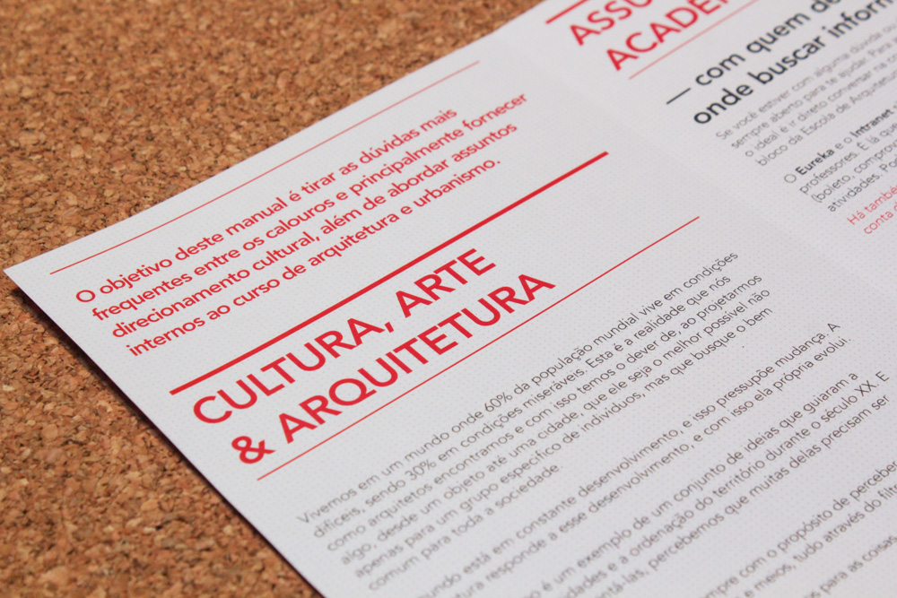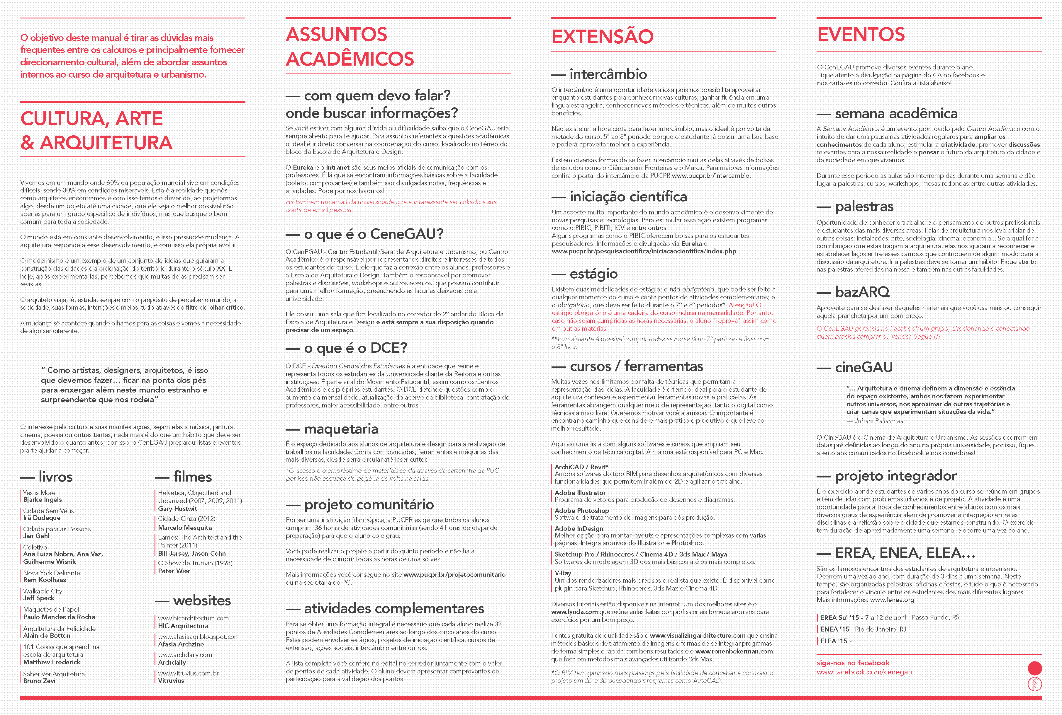 This is a freshmen’s guide designed for and by students of the School of Architecture and Urbanism of the Pontifícia Universidade Católica do Paraná –PUCPR, in Curitiba, Brazil. The guide is both a FAQ and a way to encourage new students to seek for culture and not to accept reality as it is but look at it with critical thinking. It was conceived as a folding pamphlet which can be easily transported on a small bag or hang on a wall.