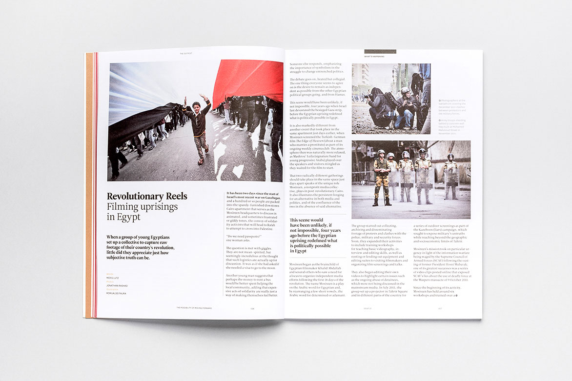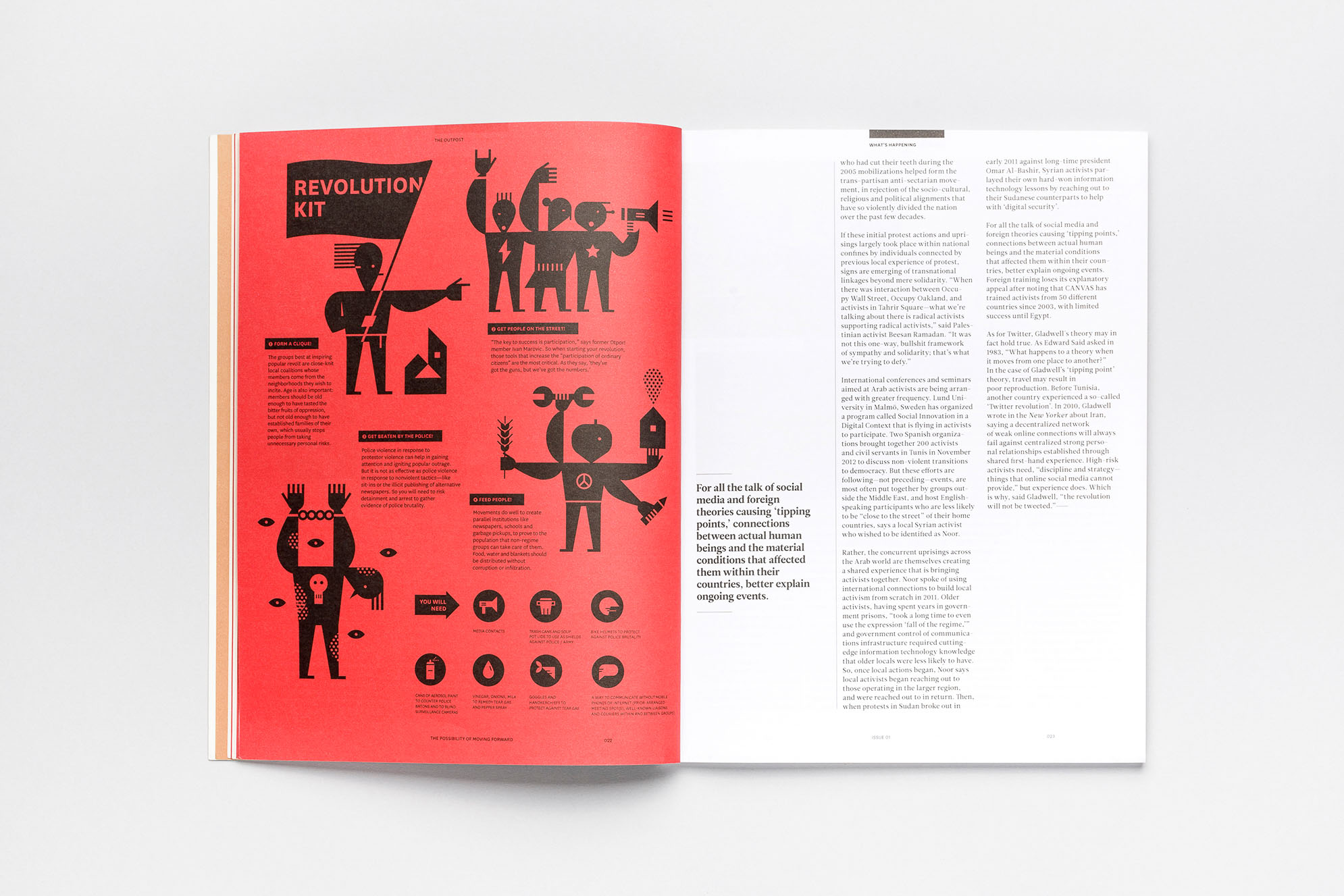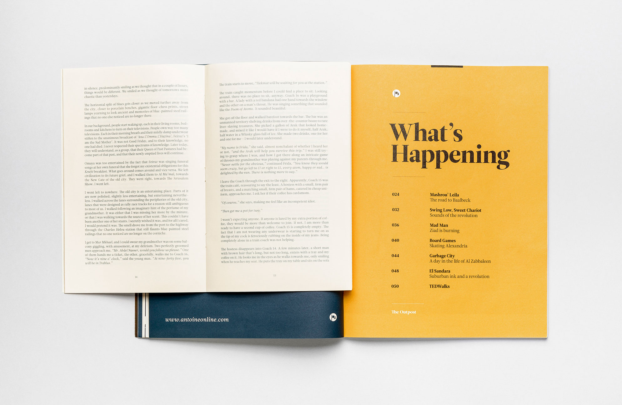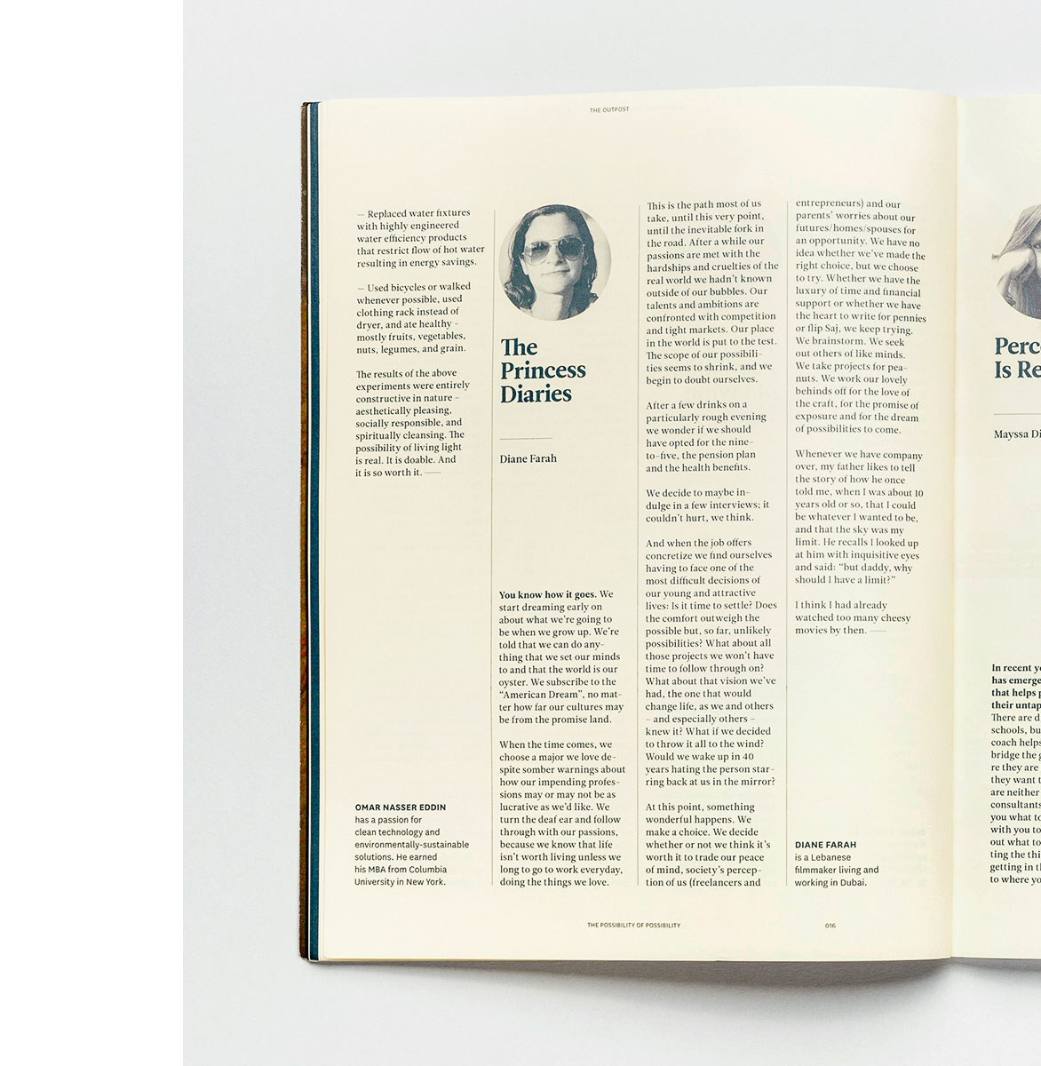 The Outpost is a beautifully designed, biannual magazine from Lebanon that explores possibilities in the ever changing Arab world. A very subtle visual system catagorizes the varied content of text, images and infographics. It was designed by Rifle, a brilliant young design firm known for their eclectic editorial design projects and careful consideration for typography.
