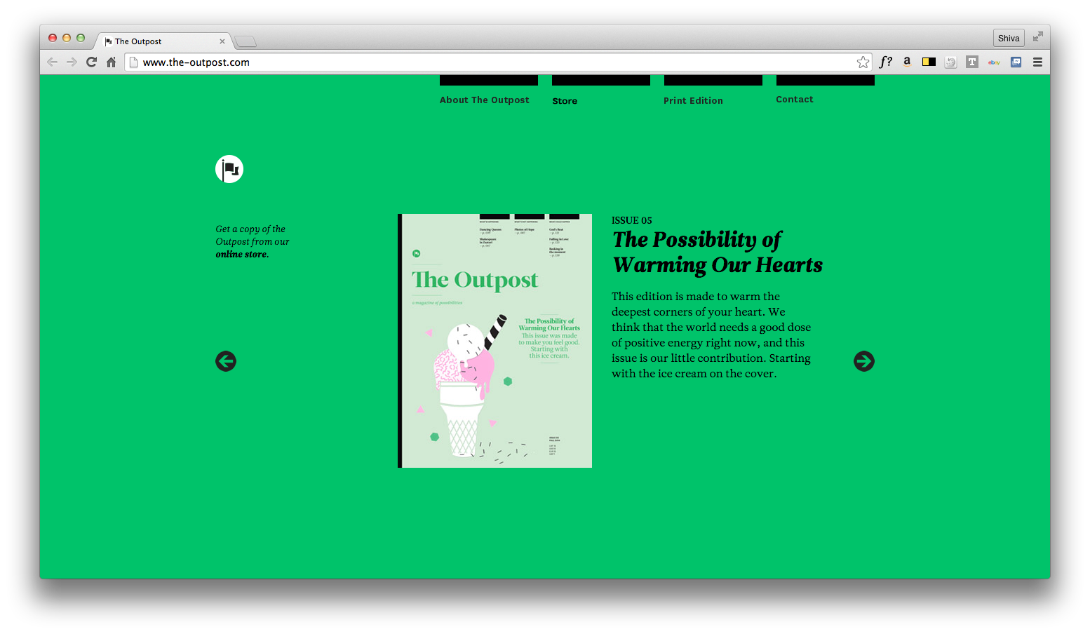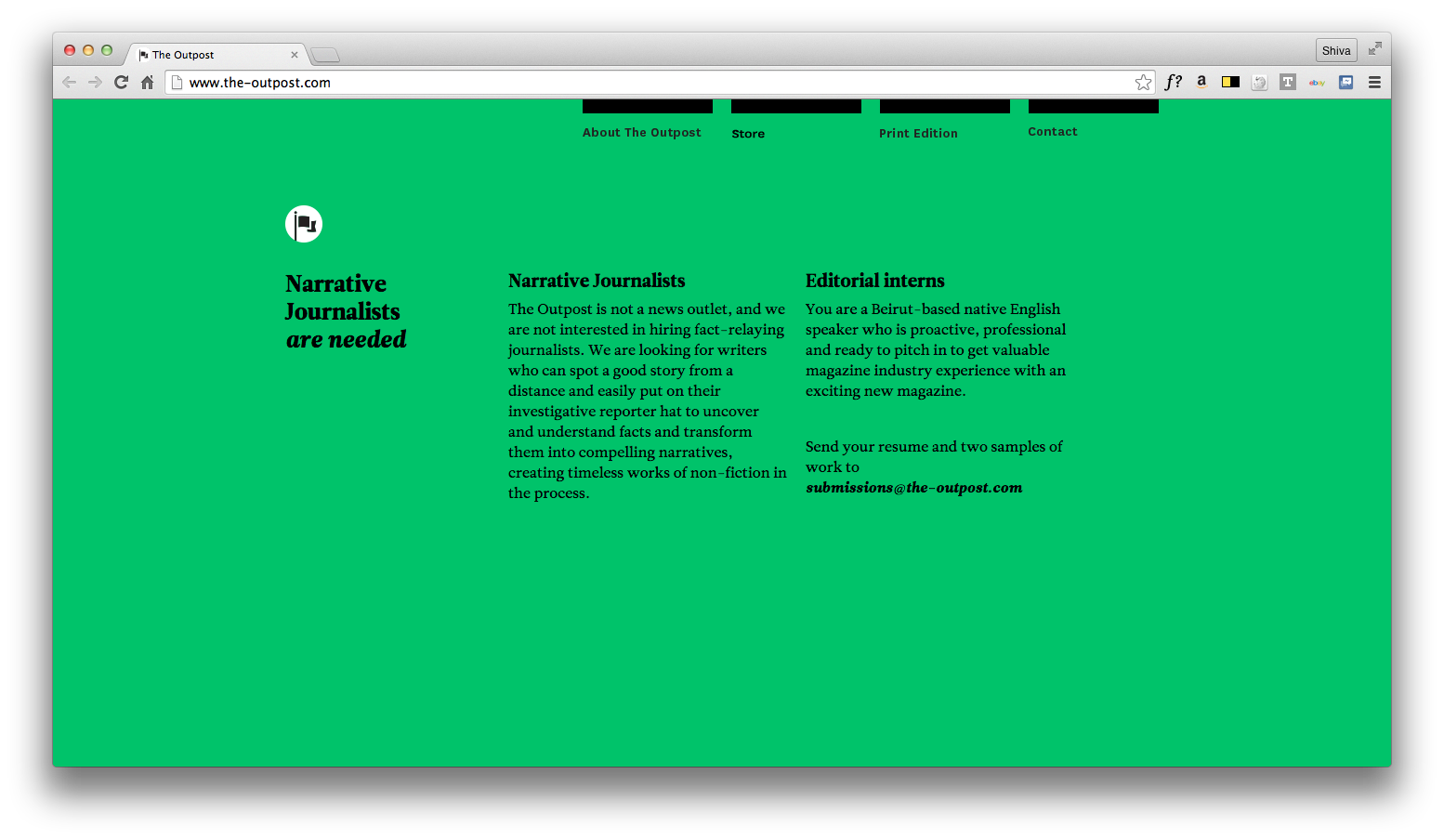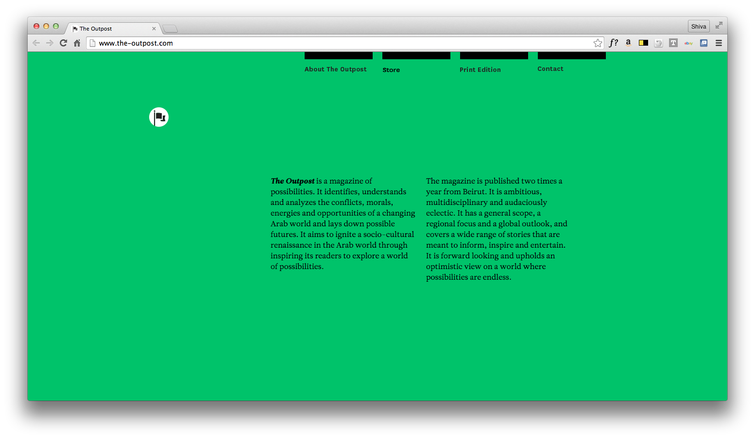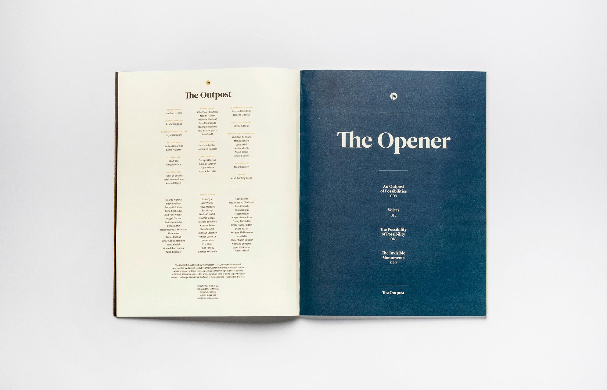 The Outpost is a magazine of possibilities. It identifies, understands and analyzes the conflicts, morals, energies and opportunities of a changing Arab world and lays down possible futures. It aims to ignite a socio-cultural renaissance in the Arab world through inspiring its readers to explore a world of possibilities.