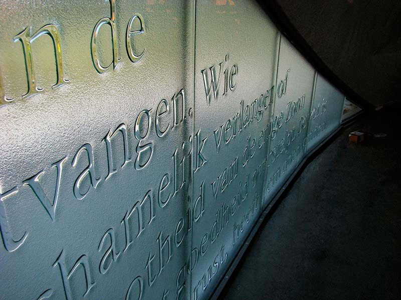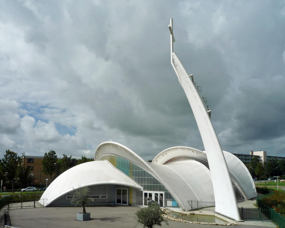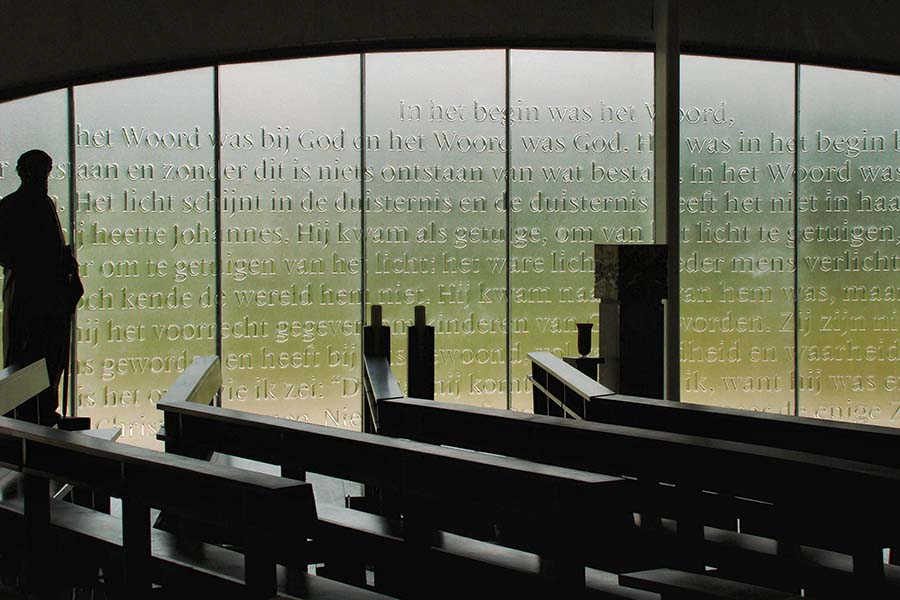 In 2007 the St. Peter and Paul Church in the Dutch city of Maassluis was put into service. The futuristic building is designed by the architects Mari Baauw and René Olivier. The church is constructed out of steel, which is covered with a double layer of canvas. The glass artist Stef Hagemeier was commissioned to design the window of the apse. Fascinated by the prologue of the Gospel of John, he decided to put this text into the window.
