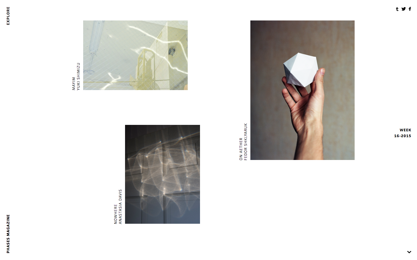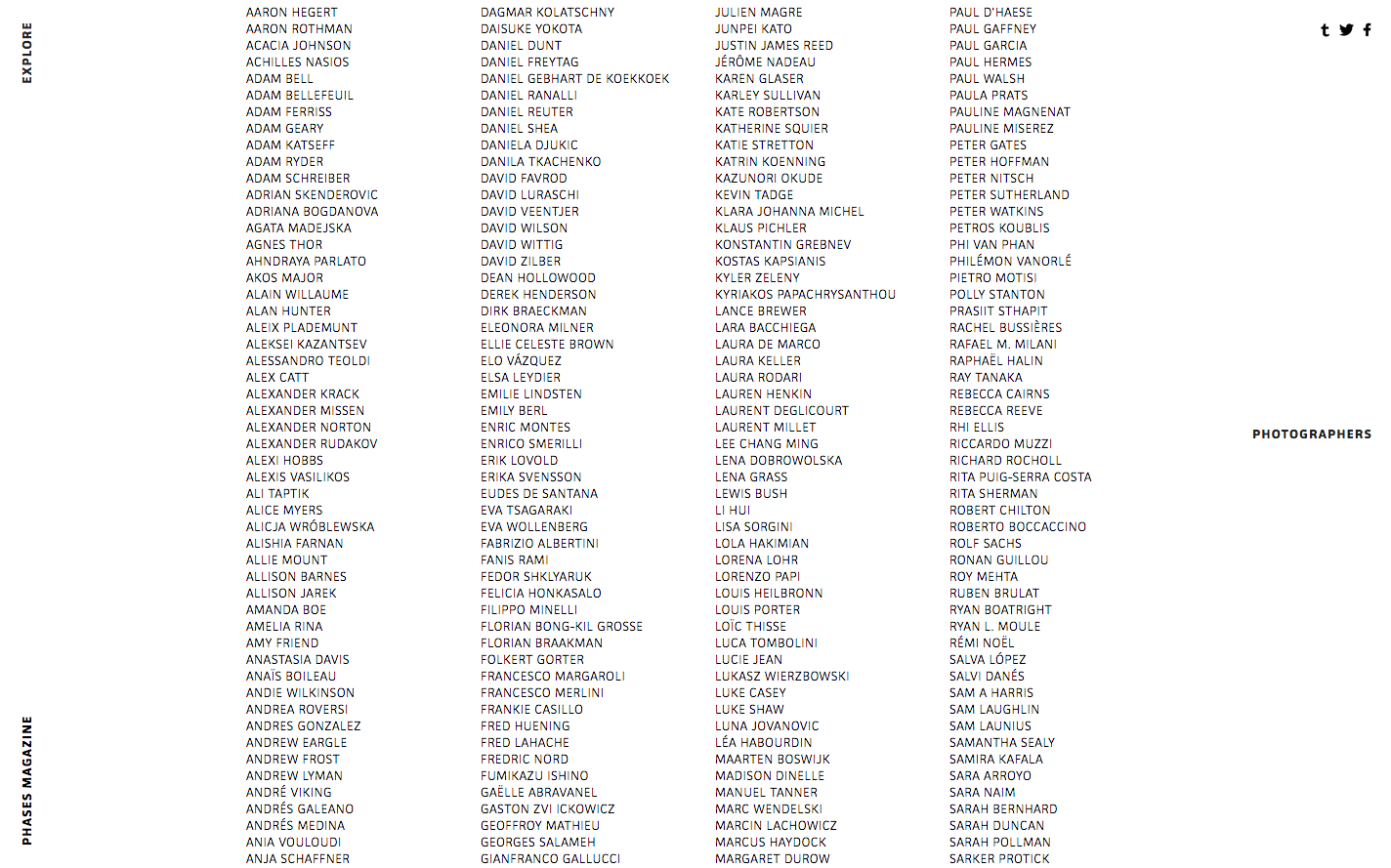 Phases magazine Contributed by Jerome Montagne on Apr 28th, 2015. Artwork published in April 2015. Source: www.phasesmag.com Phases Magazine. License: All Rights Reserved. Artwork by Jerome Montagne. Phases is an online magazine focusing on contemporary photography, publishing weekly a selection of 3 portfolios from talented emerging photographers. License: All Rights Reserved. License: All Rights Reserved. Source: www.phasesmag.com Phases Magazine. License: All Rights Reserved. Typefaces More about JAF FacitGet JAF Facit Formats Web (5616) Topics Art (4680) Designers/Agencies Jérôme Montagne (2) Tagged withminimalist (529)photography (970)magazines (24)white (46)monochromatic (4)all caps (7588)rotated type (2222) Artwork location France (2834) In Setscool (Karo Konieczna) (871)Thesis (Ryo Wazza) (87)Web (Lucas Bevilaqua) (361)Minimal/Clean (Lucas Bevilaqua) (396) Post a comment Name Email – will not be published Website Your response Submit Comment More JAF Facit in use Fukt – Magazine for Contemporary Drawing2013Ariane Spanier DesignContributed by JAF Casper Faassen websitec. 2020JUSTContributed by JAF Editorially2013Jason Santa MariaEthan MarcotteContributed by Patch Hofweber Sponsor More in Art Robert Ryman. Le regard en acte, Musée de l’Orangerie2024Camille GuittonContributed by 205TF Take – Festival for Independent Fashion and Artsc. 2016studio VIEContributed by Markus John Schimelrych bis Chrottehalde2024ROLE StudioBureau MiaContributed by Out of the Dark Staff Pick Project Space Festival Juárez 20252025David MatosShutupandanceContributed by David Matos More in Web Kamala Harris: For The People2019Wide Eye CreativeContributed by Yves Peters Staff Pick Monday Swimwearc. 2018unknownContributed by Jan Maack CO—RE2019DNCOContributed by Gareth Hague Afropunk Festival (fictional)2017Yuma NaitoContributed by Yuma Naito Staff Pick More Fonts In Use Various Artists – The Super Groups album art1969Loring EutemeyPhoto(s) by Bart Solenthaler on Flickr. Staff Pick Edgar Sarin monograph2024Lisa SturacciContributed by Out of the Dark Staff Pick “this is it” valentine card2013Starshaped PressJen FarrellContributed by Nick Sherman Staff Pick Medium collection coversc. 2019Renald LouissaintContributed by Florian Hardwig Staff Pick