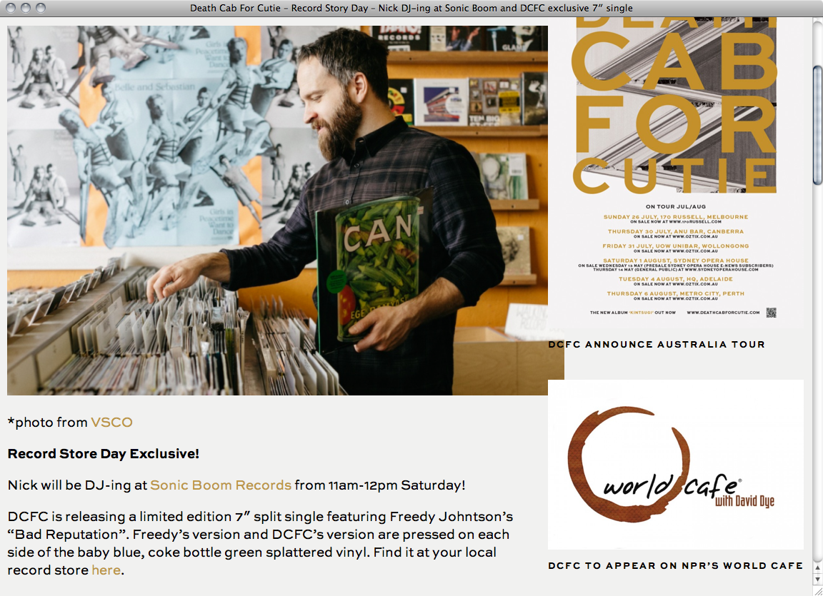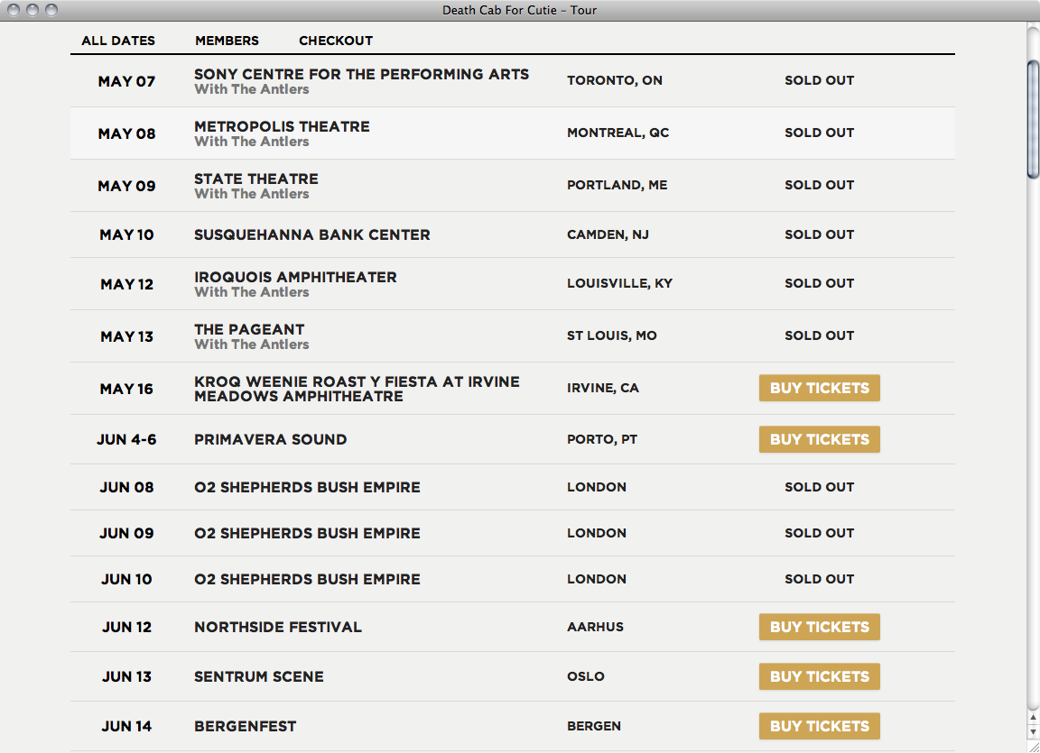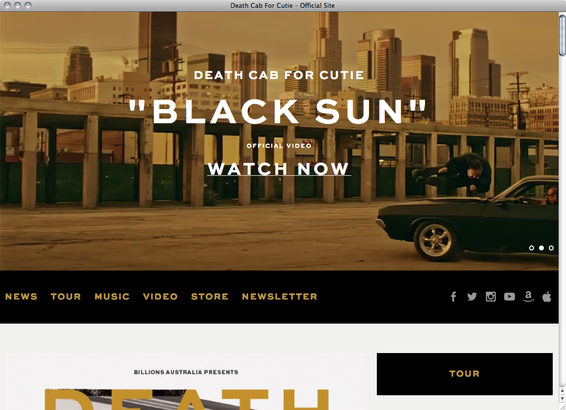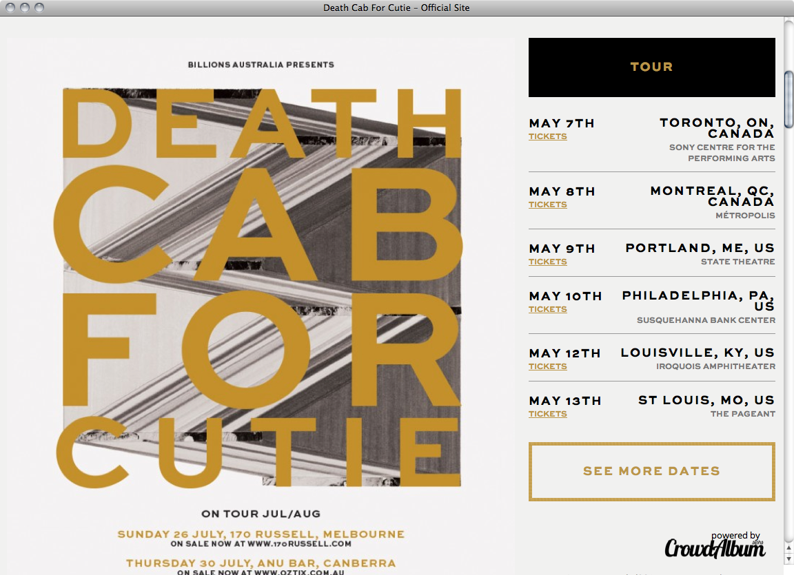 Death Cab For Cutie website Contributed by Webtype on May 7th, 2015. Source: deathcabforcutie.com License: All Rights Reserved. Design studio Hum Creative created the website of American alternative rock band Death Cab For Cutie using only Sweet Sans (mostly in caps). Source: deathcabforcutie.com License: All Rights Reserved. Source: deathcabforcutie.com License: All Rights Reserved. Source: deathcabforcutie.com License: All Rights Reserved. Source: deathcabforcutie.com License: All Rights Reserved. Typefaces More about Sweet SansGet Sweet Sans Formats Web (5613) Topics Music (6351) Designers/Agencies Hum Creative (3) Tagged withband/musician websites (15)center-aligned text (1899)gold (383)all caps (7585)one typeface (1753)Death Cab For Cutie (2)straight quotes (") (102) Artwork location United States (9905) Seattle (119) In Setsnutri (fy_younghtings) (12)Webtype (Webtype) (241)Bold Display (Sarah Brown) (29)stuffs (jae benjamin) (200) 1 Comment on “Death Cab For Cutie website” Florian Hardwig says: May 7th, 2015 12:27 pm Pity about the giant straight quotes, especially since they are dispensable anyway. Here’s a website that explains how to get them right: quotesandaccents.com Post a comment Name Email – will not be published Website Your response Submit Comment More Sweet Sans in use Readymag: 2013 Mags of the Year2013Anton HerasymenkoReadymagContributed by Stephen Coles Readymag Newsletter2013Anton HerasymenkoReadymagContributed by Webtype Staff Pick Pagos de Quintana wines2023Estudio Pablo GuerreroContributed by Juanjo Lopez Sponsor More in Music Hugo Strasser und sein Tanzorchester – Die Tanzplatte des Jahres 73/74 album art1973Contributed by Garrison Martin Neil Young – Decade album art1976Tom WilkesContributed by Rob Hudson The Philadelphia Orchestra – William Tell Overture album art1972Teresa AlfieriRoy CarruthersPhoto(s) by Bart Solenthaler on Flickr. Rod Stewart – Tonight I’m Yours album art1981Richard SeireeniDavid LarkhamContributed by Fonts In Use Staff More in Web Perimeter Books2021unknownContributed by WELTKERN® Typefaces Arthur Hochstein portfolio site2015Arthur HochsteinContributed by Stephen Coles St. Leo visual identity2020Alex Hunting StudioContributed by Alex Hunting Studio Staff Pick Rob Hemus portfolio website2024Brash AgencyContributed by Teguh Arief More Fonts In Use Isotype: Design and Contexts, 1925–19712013Christopher BurkeContributed by Maurice Meilleur Staff Pick Hocus Focus exhibition poster1979Keith GodardContributed by Herb Lubalin Study Center Staff Pick New York Botanical Garden2024Wolff OlinsContributed by Roman Shamin Staff Pick Krass Journal issue 22016Frame CreativeContributed by Gareth Hague Staff Pick