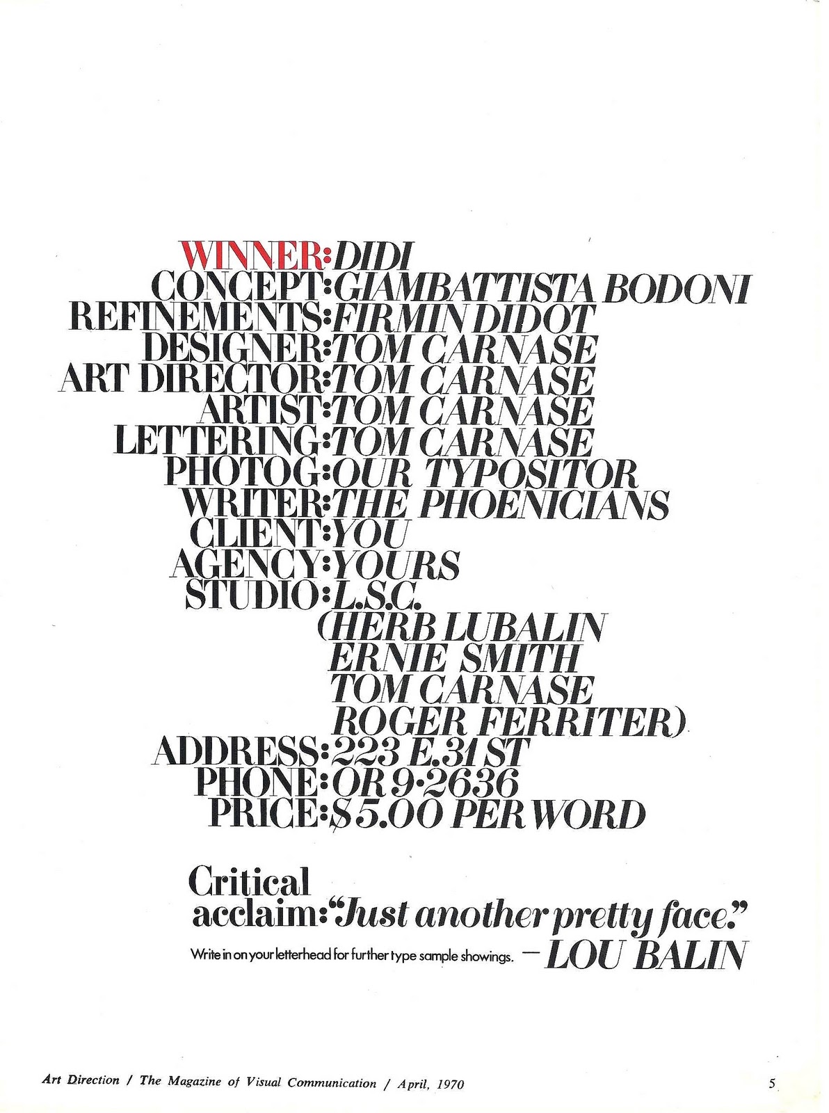 Didi typeface ad Contributed by Stephen Coles on May 7th, 2015. Artwork published in April 1970. Source: westread.blogspot.com Image via Robin Benson of Past Print. License: All Rights Reserved. Appeared in Art Direction magazine, April 1970. Typefaces More about ITC DidiGet ITC DidiMore about FuturaGet Futura Formats Advertising (2133) Topics Product (2123) Graphic Design (3027) Designers/Agencies Herb Lubalin (32) Lubalin Smith Carnase (5) Tagged withtype promotion (112)all caps (7697)humor (159)red and black (1144)type specimens (178)repetition (786)stacked lines (230)tight linespacing (358)all caps italics (582)only type (1288) Artwork location United States (9987) New York City (2942) In SetsITC (Florian Hardwig) (390) 1 Comment on “Didi typeface ad” Cave Grove says: May 8th, 2015 3:28 am Love it! It had an italic variant, too? Beautiful! Post a comment Name Email – will not be published Website Your response Submit Comment More ITC Didi in use IDCNY Sign System1987Massimo VignelliVignelli AssociatesJanice CarapellucciContributed by Stephen Coles IDCNY Newsletters1986Michael BierutVignelli AssociatesLucy CossentinoContributed by Stephen Coles PF·XL1982Massimo VignelliVignelli AssociatesContributed by Stephen Coles Staff Pick Sponsor More in Product Braun TS 45 control unit1964Dieter RamsBraunContributed by Stephen Coles Staff Pick Detomaso Watches2020DetomasoContributed by Emtype Foundry J.G. Schelter & Giesecke ads (1922)1922Schelter & GieseckePhoto(s) by Kirsten Solveig Schneider on Flickr. Honeywell Kitchen Computer ad in Neiman Marcus catalog (1969)1969unknownContributed by Kenneth Woolley More in Advertising 1964 Revlon ad: “tawny”1964Contributed by Stephen Coles Terminal X identityc. 2018Dan Alexander & Co.Contributed by Stephen Coles Jacob K. Javits U.S. 1968 Senatorial campaignc. 1968Milton GlaserJason McWhorterContributed by Stephen Coles Staff Pick DiaTipo Campinas 20162016Estúdio AnalógicoContributed by Diego Maldonado More Fonts In Use National Pork Board logos, 1987 & 20051987BozellCampbell MithunContributed by Stephen Coles Staff Pick The Beatles – ΑΩ (Alpha Omega) album art1972Art WingContributed by Reybach C Staff Pick Lampa festival 10th anniversary2024Dārta ApsīteValters KalsersContributed by Edgar Walthert Staff Pick Tobias Frere-Jones website2014Oak StudiosContributed by Caren Litherland Staff Pick