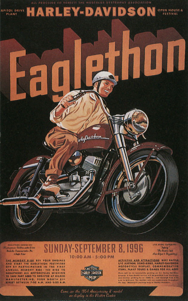 FB Agency convincingly emulates 1950s poster lettering in this invitation to an event for classic motorcycle enthusiasts. Dana Arnett rounded the flat, angled edge on the typeface’s ‘e’ and added extrusion and airbrush gradient effects to complete the look.