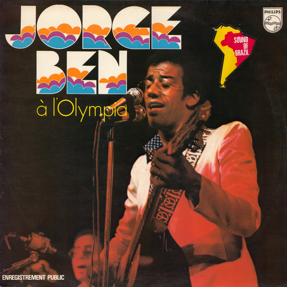The cover of this live album by Brazilian musician Jorge Ben Jor uses Indigo. Here its solid shapes are not filled with rainbows, but rather with multicolored clouds. This cloud pattern already made another appearance on a magazine cover three years earlier, which suggests that it was available off-the-shelf from Hollenstein Phototypo.