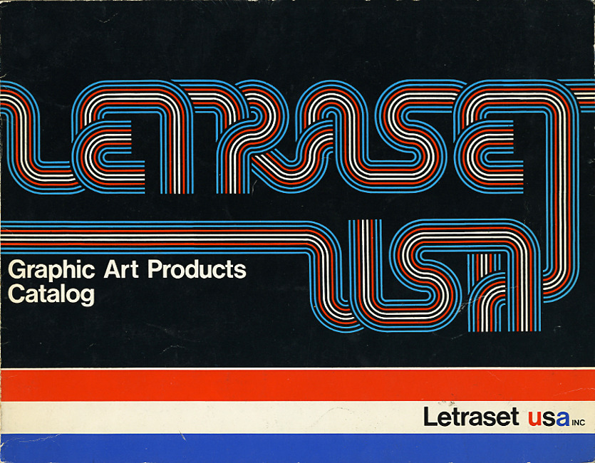Stripes was designed by Tony Wenman in c. 1972 and came with several alternates that enabled settings like this one for the cover of Letraset USA’s Graphic Art Products Catalog, where the multiline letters are joined up to form racetrack-like logotypes.