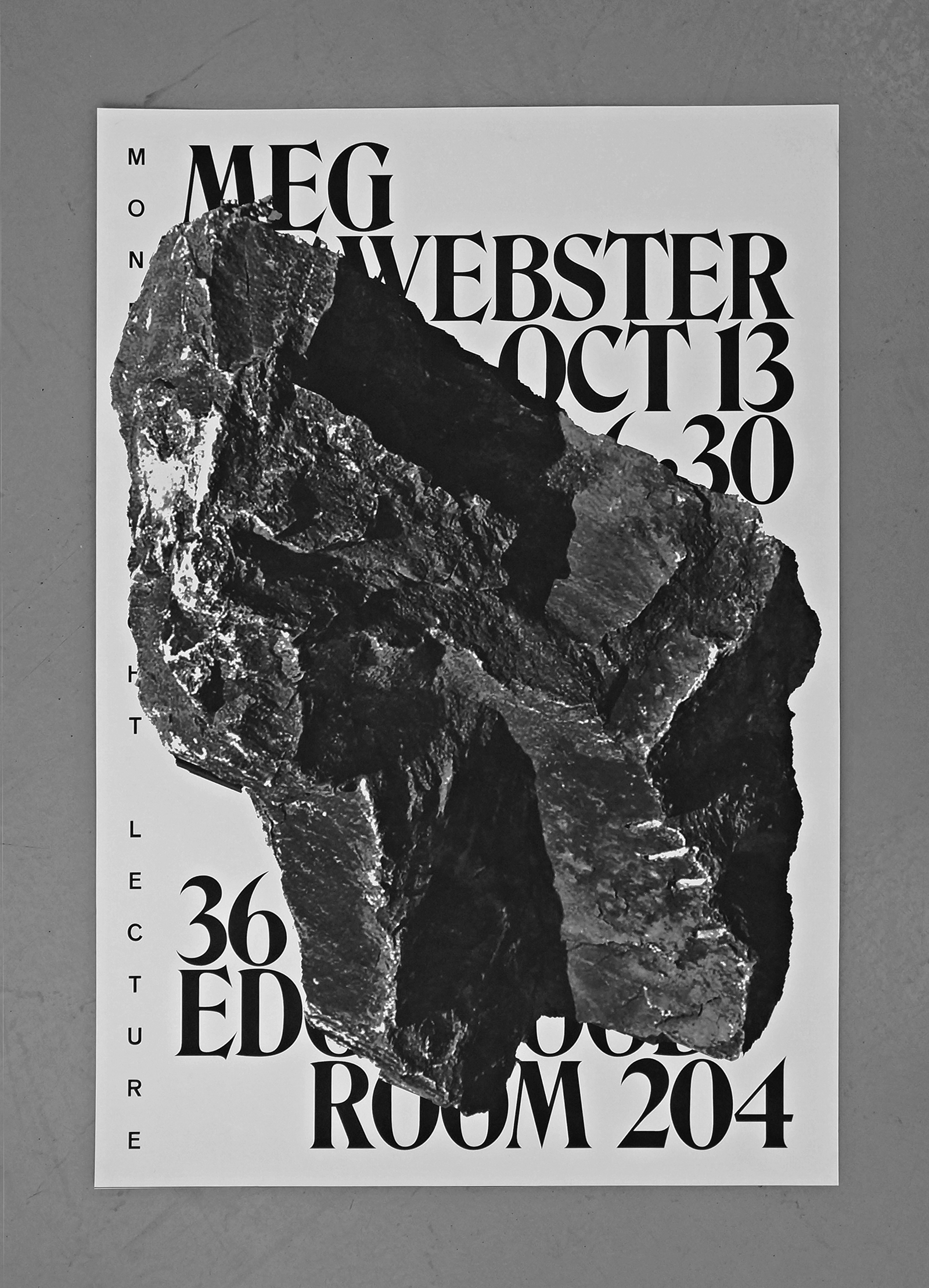 A poster announcement for a lecture by sculptor Meg Webster at the Yale School of Art, part of the Monday Night Lectures series. Featuring ITC Bernase Roman and URW Venus Bold covered by an image of a rock taken from Webster’s Stonefield installation at the Hudson River Park in New York.