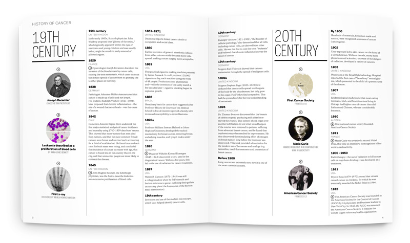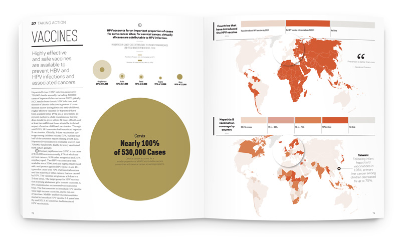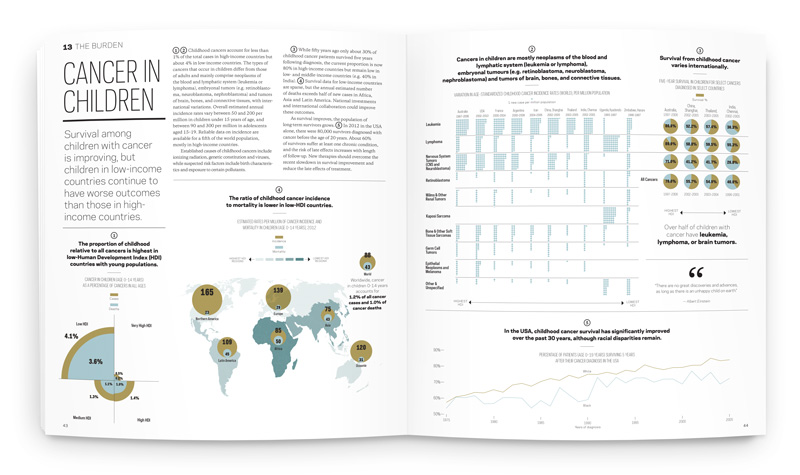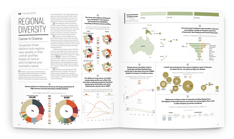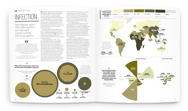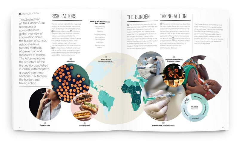 The 136-page book comprises nearly 100 insets and 44 choropleth-coded maps illustrating global data. The visual voice was inspired by academic quarterly publications; sophisticated but digestible, with a color palette inspired by tissue and cell photography. Circles are used as a consistent throughline, to represent the cellular and global levels that cancer strikes.