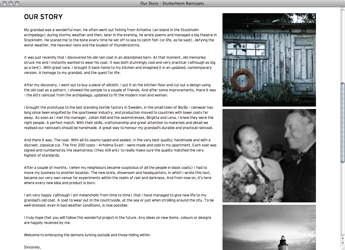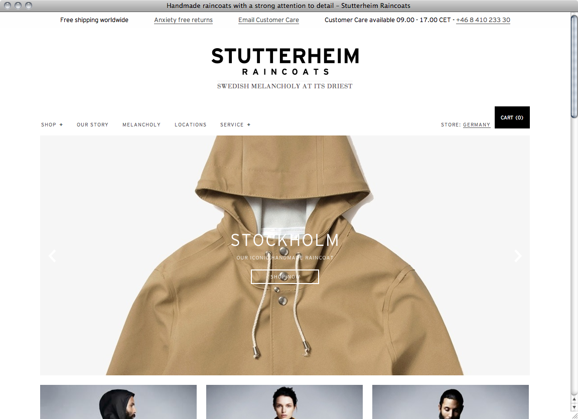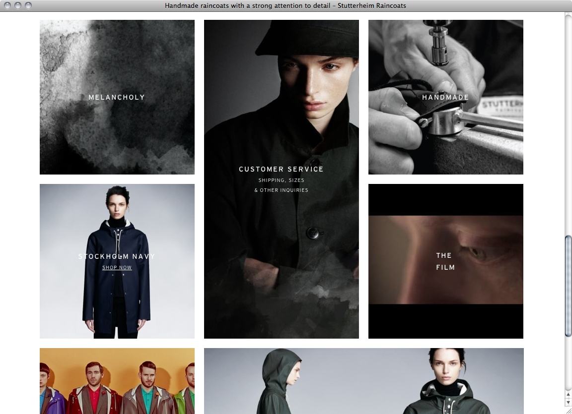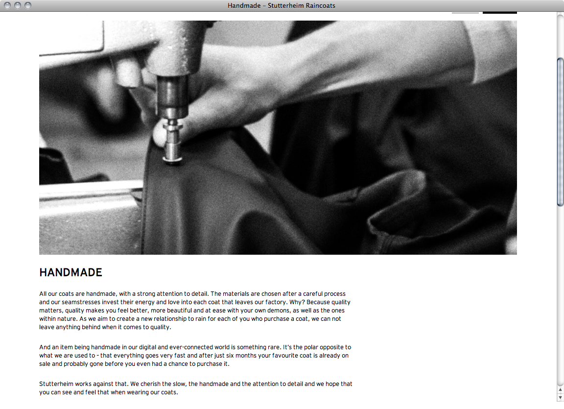 Based in Stockholm Stutterheim produces rarefied handmade raincoats. Design agency think99 and web development agency Karlsson&Lord created the corresponding online appearance using Bauer Bodoni for small highlighted passages and Interstate for everything else like headings, navigation and continuous text.
