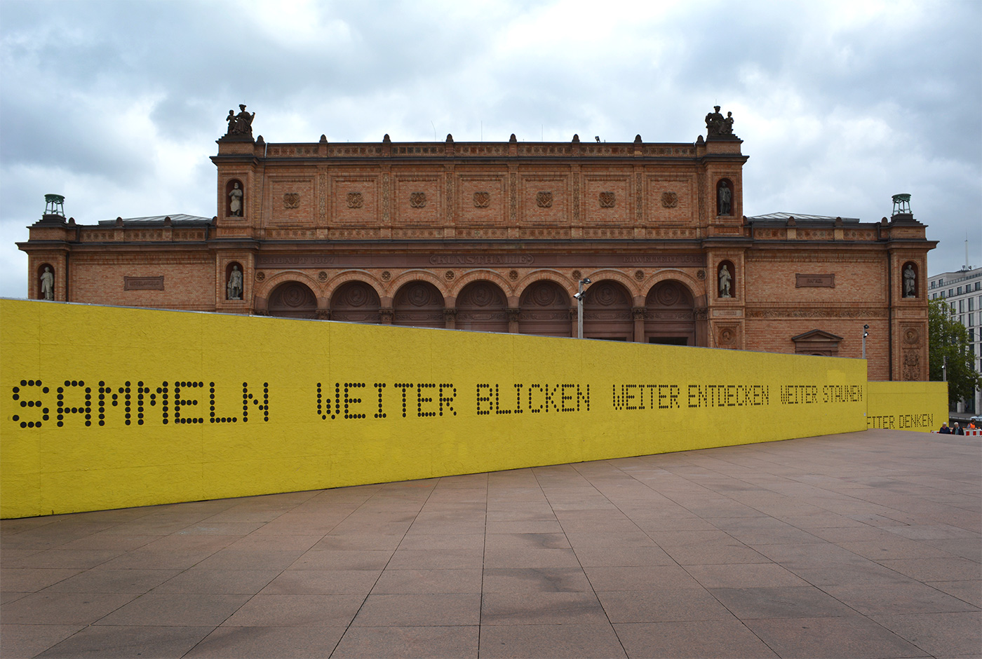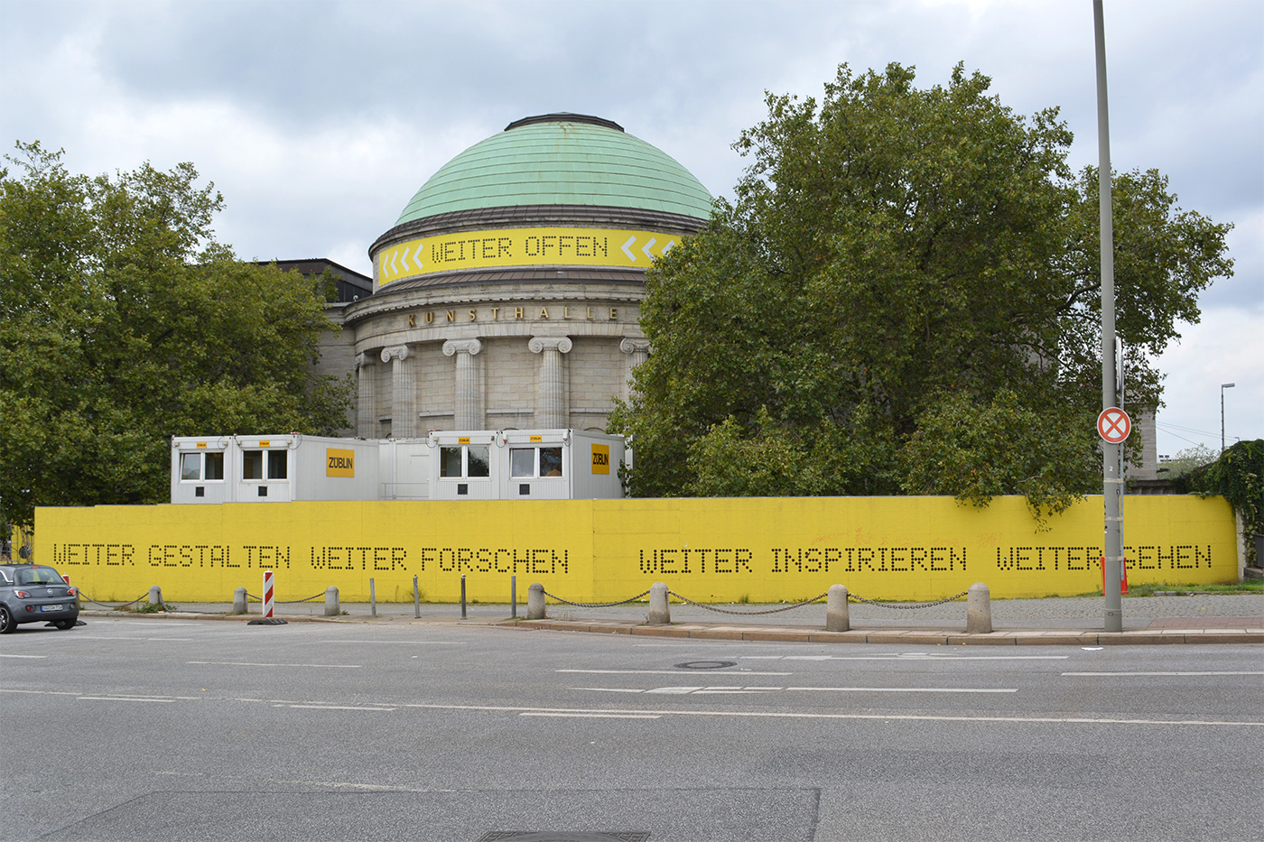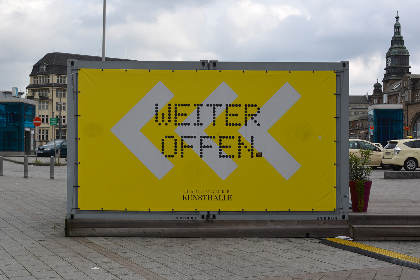 Hamburger Kunsthalle temporary signs Contributed by Florian Hardwig on Sep 24th, 2015. Artwork published in circa July 2014. Photo: Florian Hardwig. License: All Rights Reserved. “The Hamburger Kunsthalle is currently being modernised but remains open to visitors.” — www.weiter-offen.de See more images of the “Weiter offen” (“Further Open”) campaign on the website of Heine/Lenz/Zizka. Photo: Florian Hardwig. License: All Rights Reserved. Photo: Florian Hardwig. License: All Rights Reserved. Photo: Florian Hardwig. License: All Rights Reserved. Photo: Florian Hardwig. License: All Rights Reserved. Typefaces More about MatriseGet MatriseMore about Maison NeueGet Maison Neue Formats Signs (2129) Branding/Identity (8368) Topics Institutional (1393) Art (4638) Designers/Agencies Heine/Lenz/Zizka (3) Tagged withtemporary (19)yellow (401)art museums (206)type made of dots (132)yellow and black (469)all caps (7517)fences/hoarding (36) Artwork location Germany (3836) Hamburg (294) In Setsexhibition (miguel anønimo) (184) Post a comment Name Email – will not be published Website Your response Submit Comment More Maison Neue in use Côté Maison identity2015Studio 24/24Contributed by Studio 24/24 A More Than Human Release Party2014BedowContributed by Stephen Coles Going Down Swinging magazine, issue 372016Matt TambelliniContributed by Gareth Hague Staff Pick Sponsor More in Art Flor de Santiago by Ruth Varela2017AlpacaLuciano PerondiContributed by CAST Staff Pick Inspinniert 232023Stellwerk OstContributed by Matthias Niedermann Instant Nudes by Clara Hoppe2021Clara HoppeContributed by Parachute Sargent & Paris exhibition at The Met2025The Metropolitan Museum of ArtContributed by Greg Gazdowicz More in Signs CRIASc. 2025The 6thContributed by Jonas Pelzer Electric Lady Studios logoc. 1969John StorykContributed by Reybach C Staff Pick PB Boulangerie Bistroc. 2009Contributed by Richard Lipton Chatsworth and the Devonshire Group identity2024PentagramAngus HylandMariona AlegreContributed by R-Typography Staff Pick More Fonts In Use Garage Italia website2019DisplaySix Socks StudioContributed by Andrea Bergamini Staff Pick The Occupied Times of London2011Tzortzis RallisLazaros KakoulidisContributed by Florian Hardwig Staff Pick Instinct de liberté Collection, Lux Éditeur2017Jolin MassonContributed by Jolin Masson Staff Pick Cercle magazine nº10, “Parade”2022Cercle StudioContributed by Cercle Magazine Staff Pick