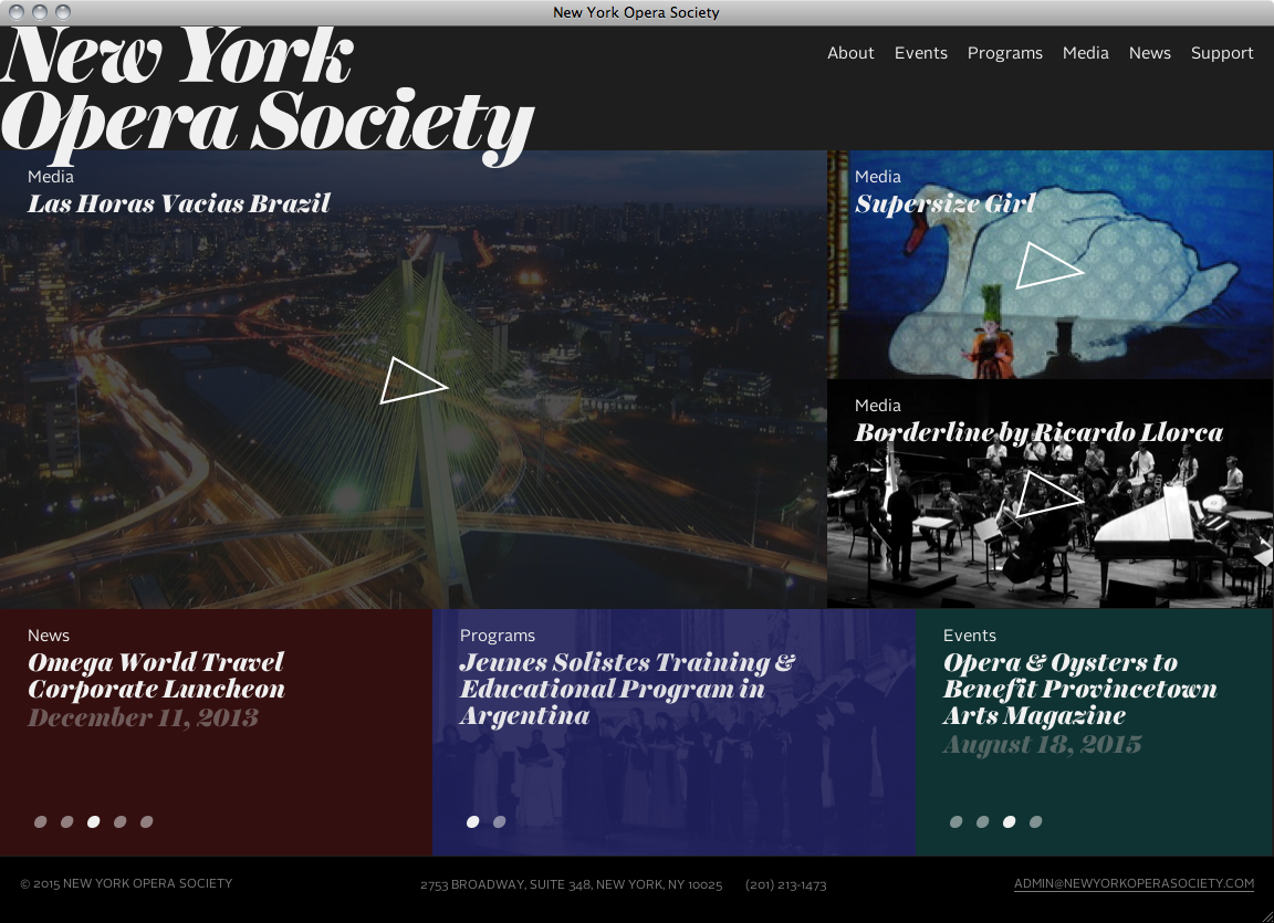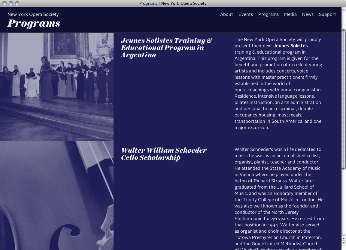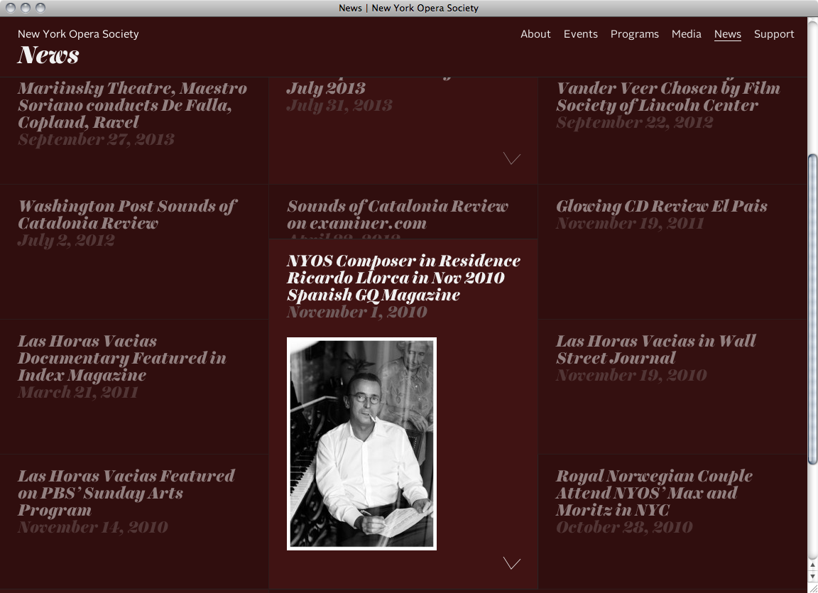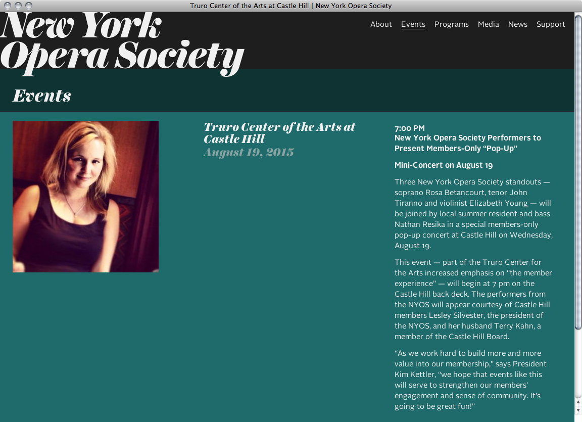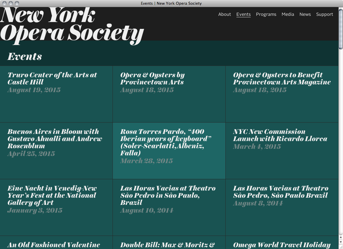 New York City based design and development studio CHIPS combined Harriet Display Black for headlines and dates with Alright Sans for section headings, continuous text and navigation for the website of the New York Opera Society, an organization in support of operatic artists and performances.