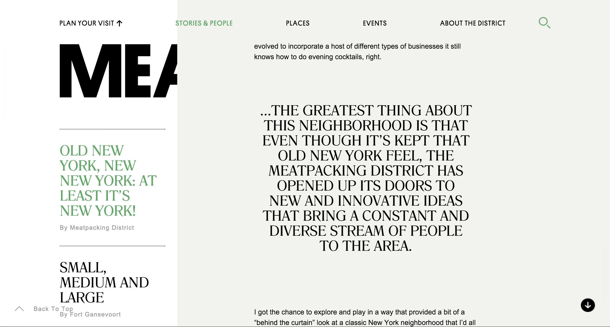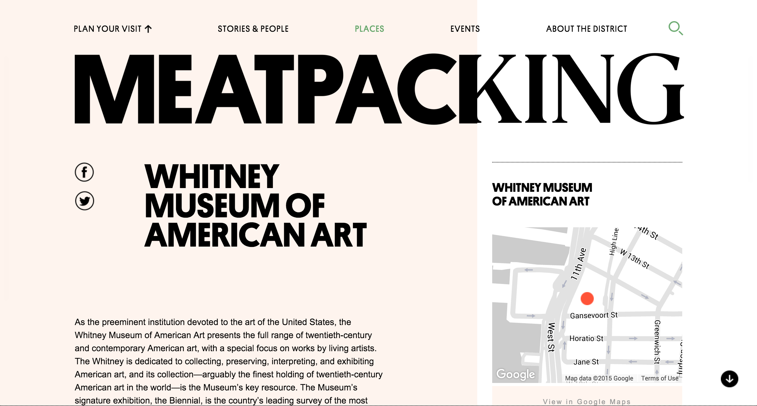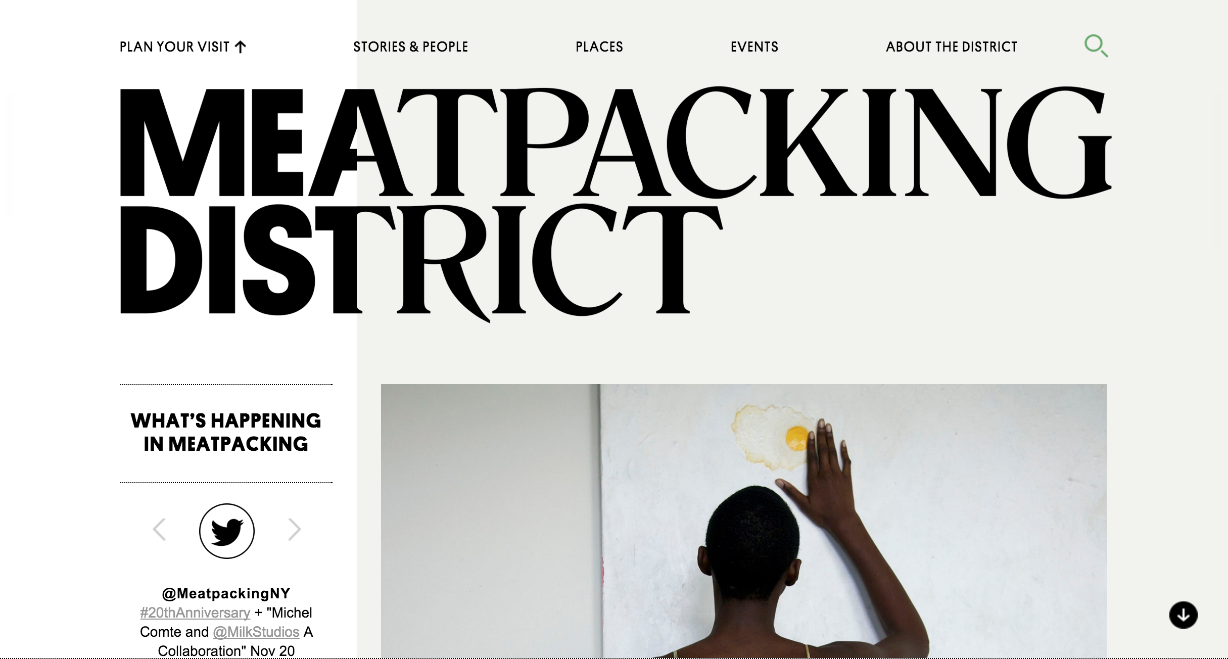 The Meatpacking District website is especially inventive with the split-personality identity. Each side is a column of content that scrolls independently. Webfont versions of Platform (from Commercial Type) and Romana (from Elsner+Flake) are used for headlines, nav, and pullquotes. The text is set in Arial.