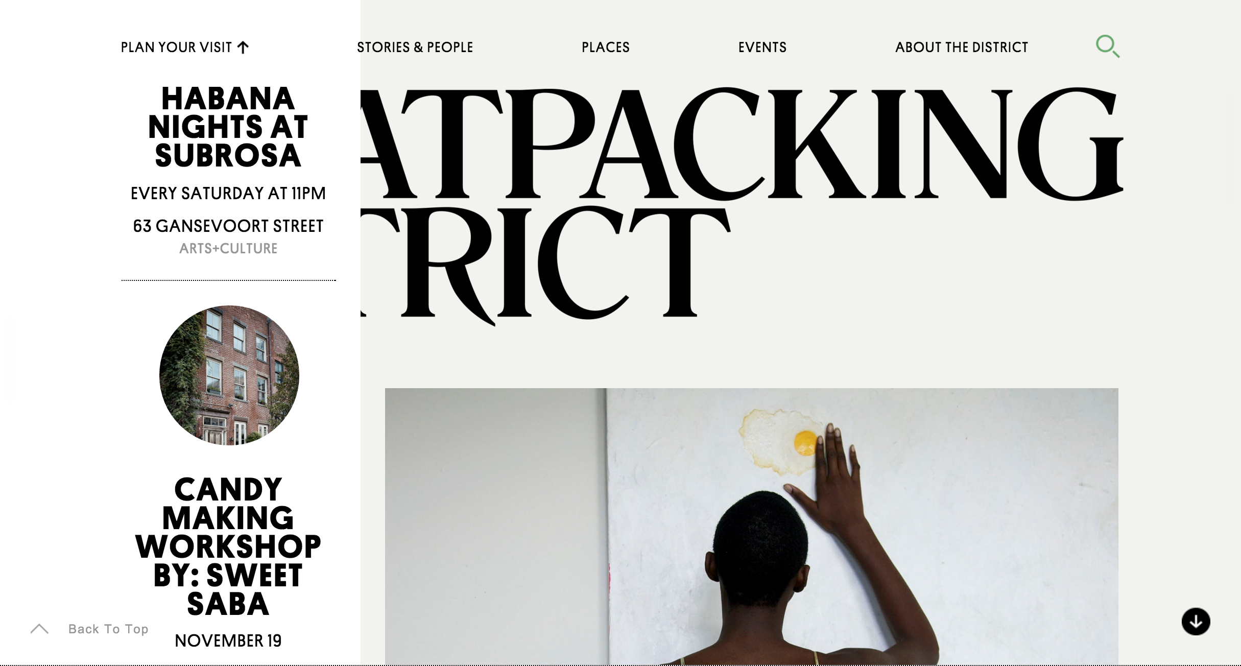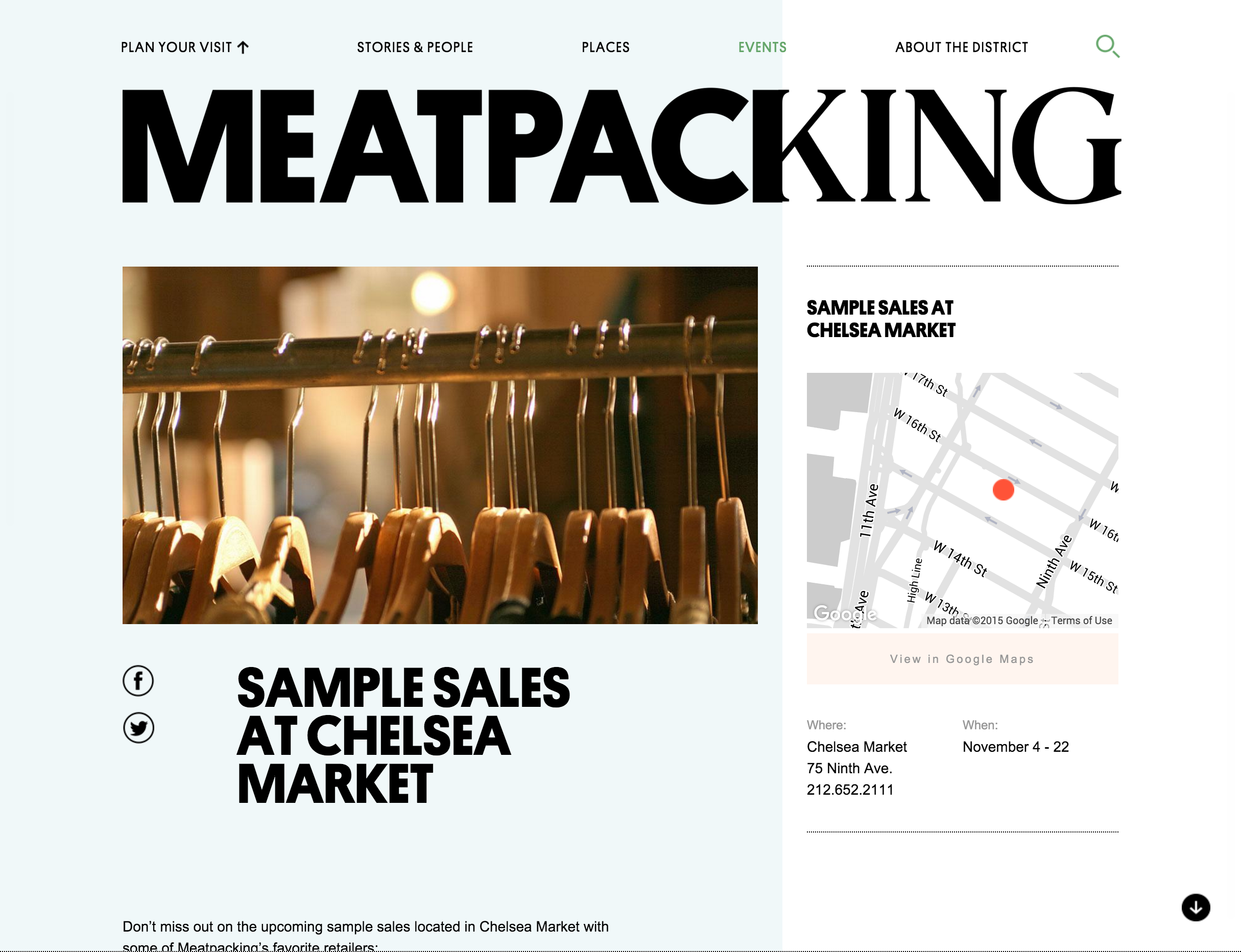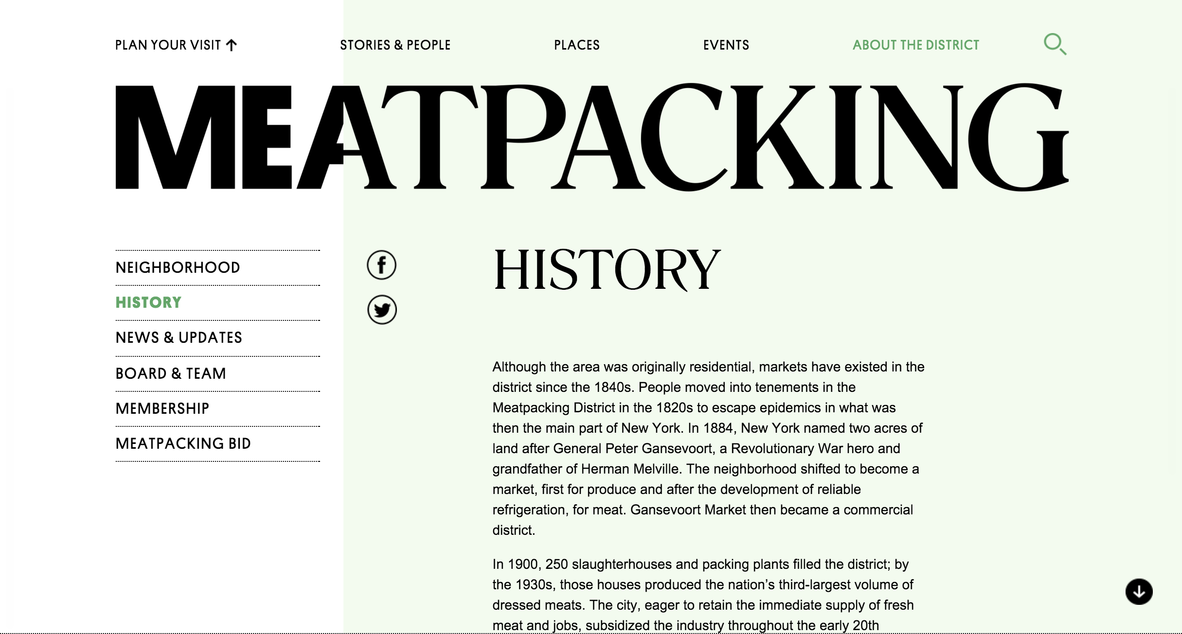 The Meatpacking District website is especially inventive with the split-personality identity. Each side is a column of content that scrolls independently. Webfont versions of Platform (from Commercial Type) and Romana (from Elsner+Flake) are used for headlines, nav, and pullquotes. The text is set in Arial.