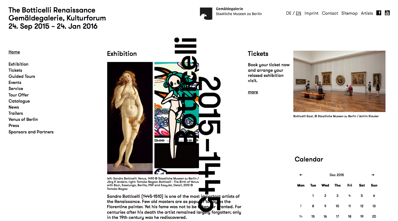 The Botticelli Renaissance is an exhibition in the Gemäldegalerie (Gallery of Old Masters) at Kulturforum Berlin. It features original works by Renaissance painter Sandro Botticelli alongside appropriations and re-evaluations of his work by artists such as Edgar Degas, René Magritte, Andy Warhol, Cindy Sherman, Jeff Koons, and Bill Viola.