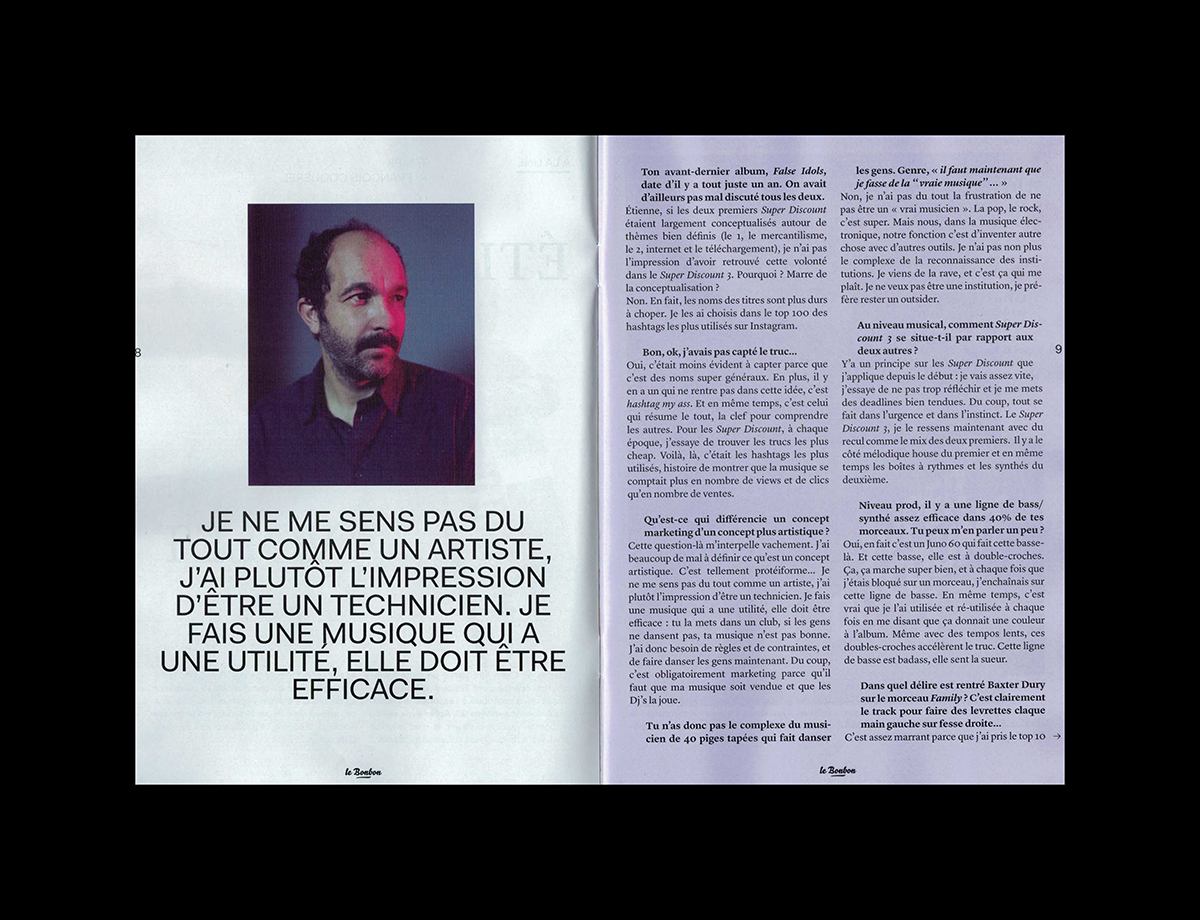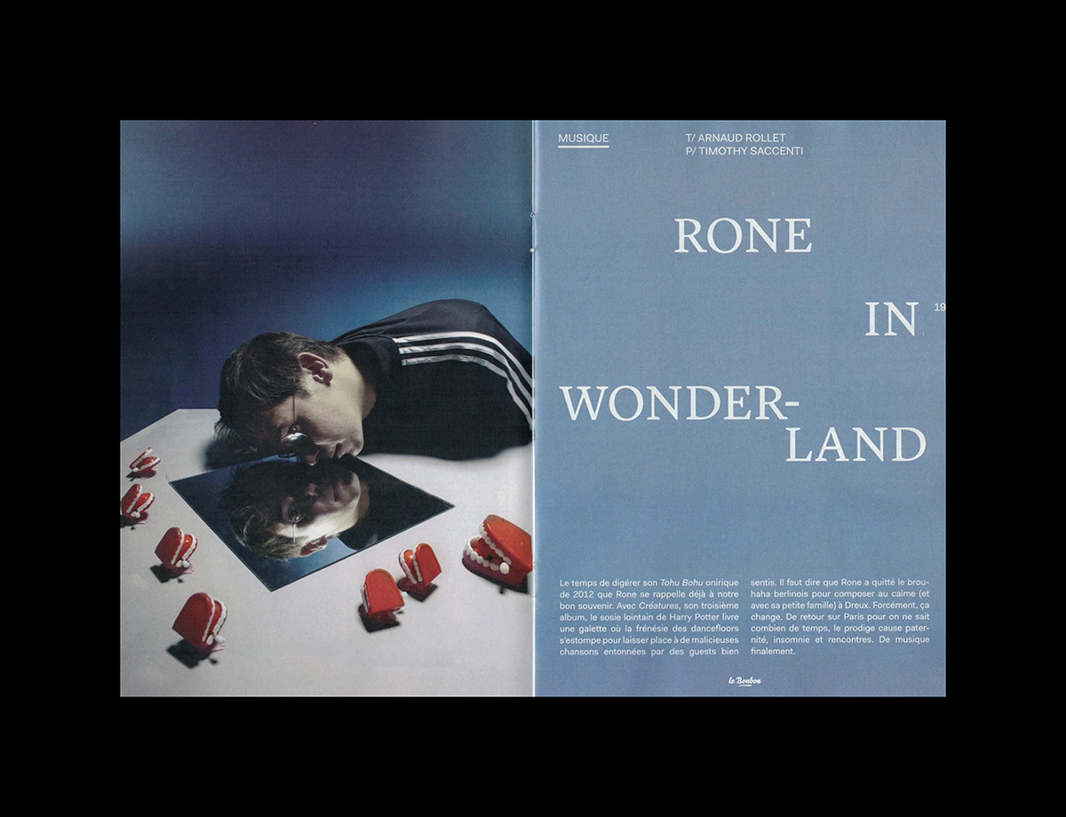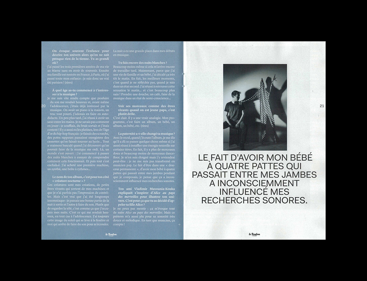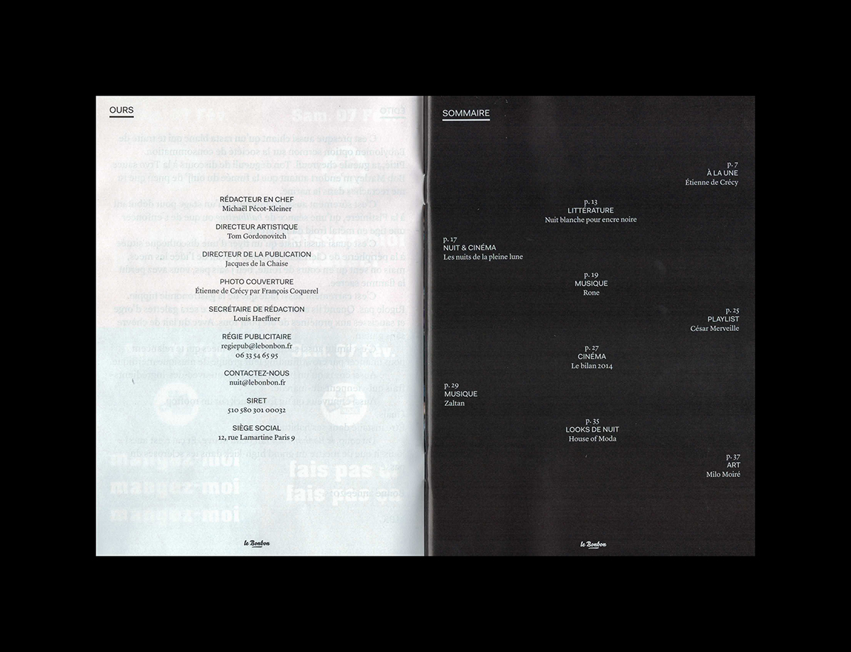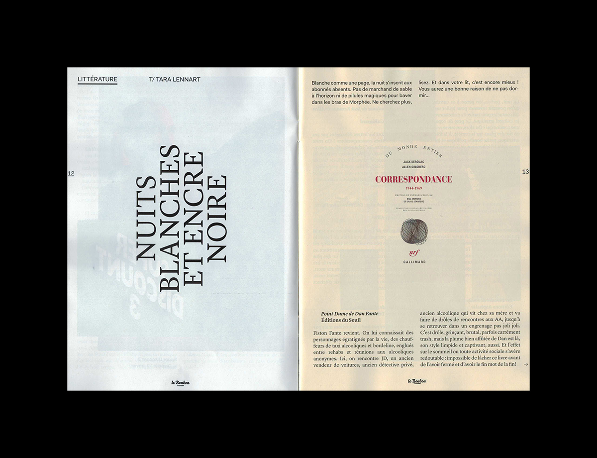 Le Bonbon Nuit nº49, January 2015 Contributed by République Studio on Dec 14th, 2015. Artwork published in 2015. Source: www.republique-paris.com République. License: All Rights Reserved. Le Bonbon Nuit is a magazine about music, art and nightlife in Paris. License: All Rights Reserved. License: All Rights Reserved. License: All Rights Reserved. License: All Rights Reserved. License: All Rights Reserved. License: All Rights Reserved. License: All Rights Reserved. License: All Rights Reserved. License: All Rights Reserved. Typefaces More about BelloGet BelloMore about LyonGet LyonMore about FaktGet Fakt Formats Magazines/Periodicals (1822) Topics Music (6275) Art (4627) Local (1537) Designers/Agencies République Studio (36) Tagged withLe Bonbon (8)magazine logos (494)magazine covers (1361)magazine interiors (1109)city magazines (41)nightlife (66)rotated type (2203)swash underline (5)underlined (741)center-aligned text (1878)reversed type (3333)all caps (7498)Paris (79) Artwork location France (2801) Paris (1301) In Setscool (Karo Konieczna) (871)revista (Carlos VargasCesa) (42) Post a comment Name Email – will not be published Website Your response Submit Comment More Bello in use Geeks On A Beachc. 2013Happy GarajeContributed by Florian Hardwig Airbnb Logo (2008–14)2008Contributed by Stephen Coles Bienvenue sur la route de Toulouse2017Martin Lavielledeux degréscollectif CANCANContributed by Martin LAVIELLE Staff Pick Sponsor More in Music Marvin Gaye – Let’s Get It On album art1973unknownContributed by Jae Ebey Markus Stockhausen / Jasper Van’t Hof – Aqua Sansa album art1980Markus StockhausenContributed by Robert Beatty Enrico – “Recuerdos Del Sol” / “Mi Amalia” Dutch single cover1975unknownContributed by Jorge Iván Moreno Majul MIC online magazine2021Jack KoloskusContributed by Production Type More in Magazines/Periodicals Producto magazine2016Juan CortazarContributed by Juan Cortazar Itinerari newspaper supplement2019Tomo TomoContributed by Luca Pitoni Staff Pick extra Magazin, no. 36c. 1991unknownContributed by Fernseh dienst Modern Data magazine (1970)c. 1970unknownWilliam KwiatkowskiContributed by Ben Zotto More Fonts In Use DO OVERContributed by Nick Sherman Staff Pick Temporäre Unordnung2020Nik ThoenenContributed by Thomas Hirter Staff Pick City Atlas by Amalia Barbozac. 2024mm, mManuel WeselyContributed by Manuel Wesely Staff Pick Tout le gentil garçon / All of the nice guy2011Huz & BosshardContributed by 205TF Staff Pick