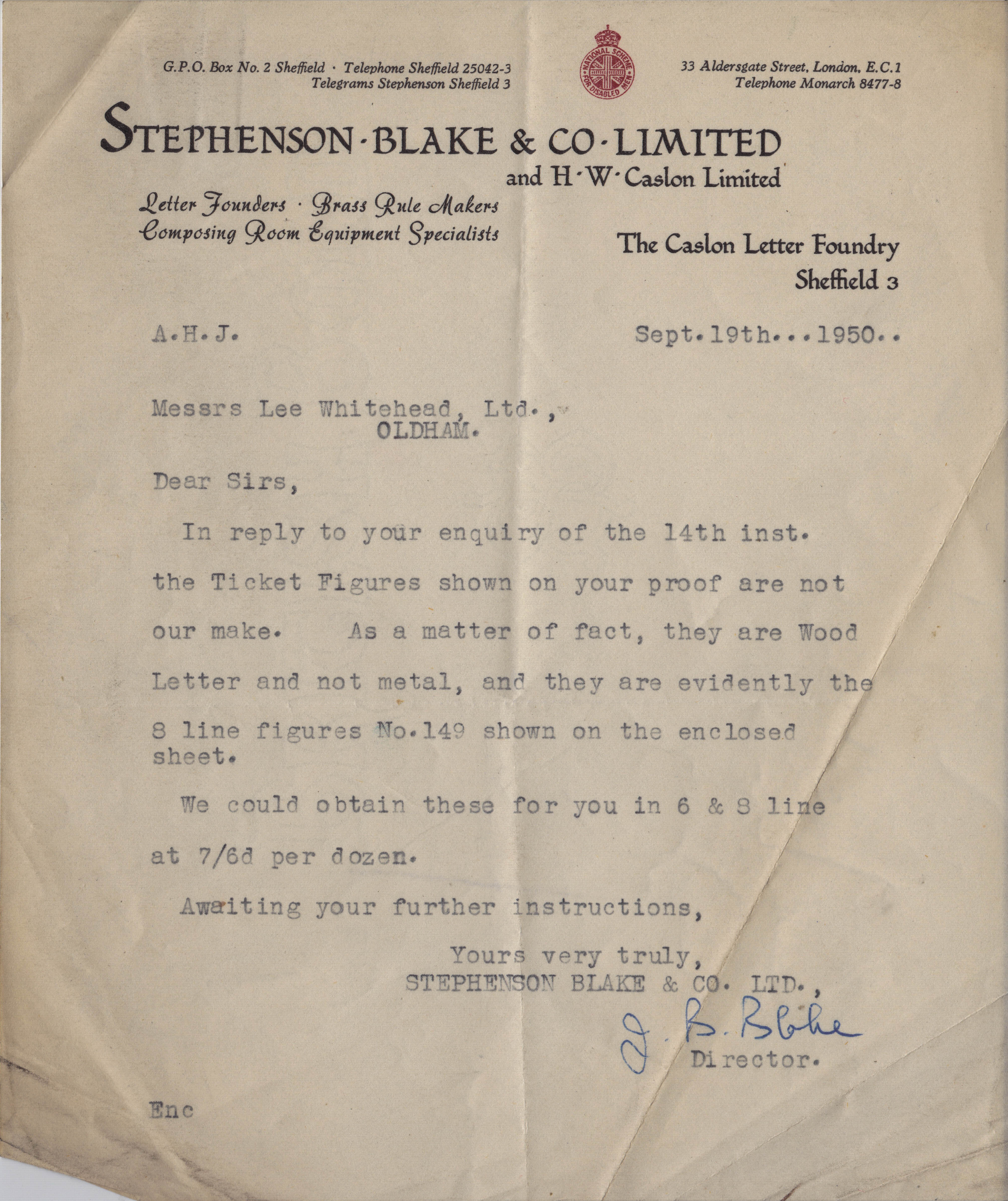 Letter to Messrs. Lee Whitehead, Oldham, Lancashire from Stephenson Blake & Co Ltd, letter founders, Sheffield, West Yorkshire – 1950