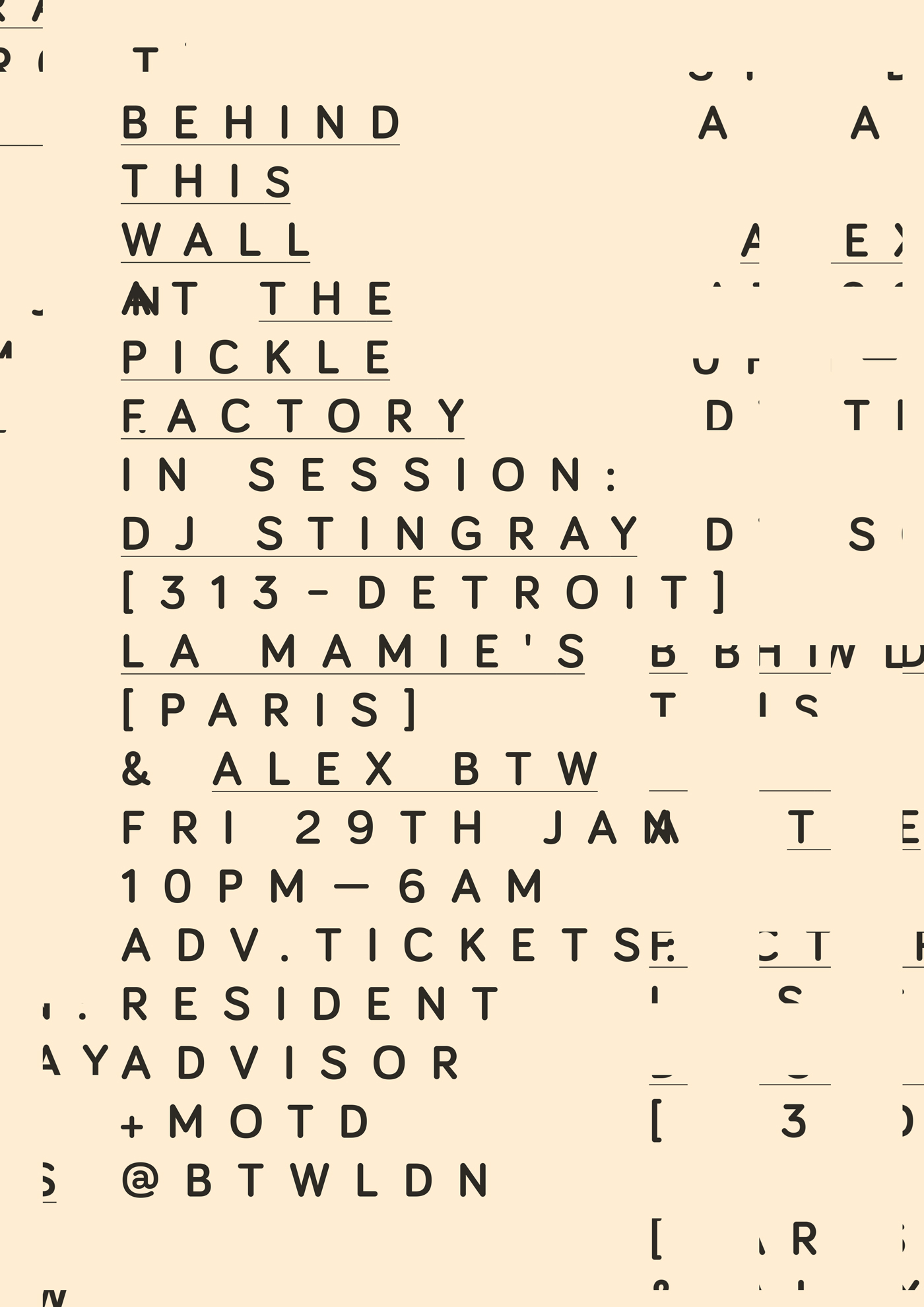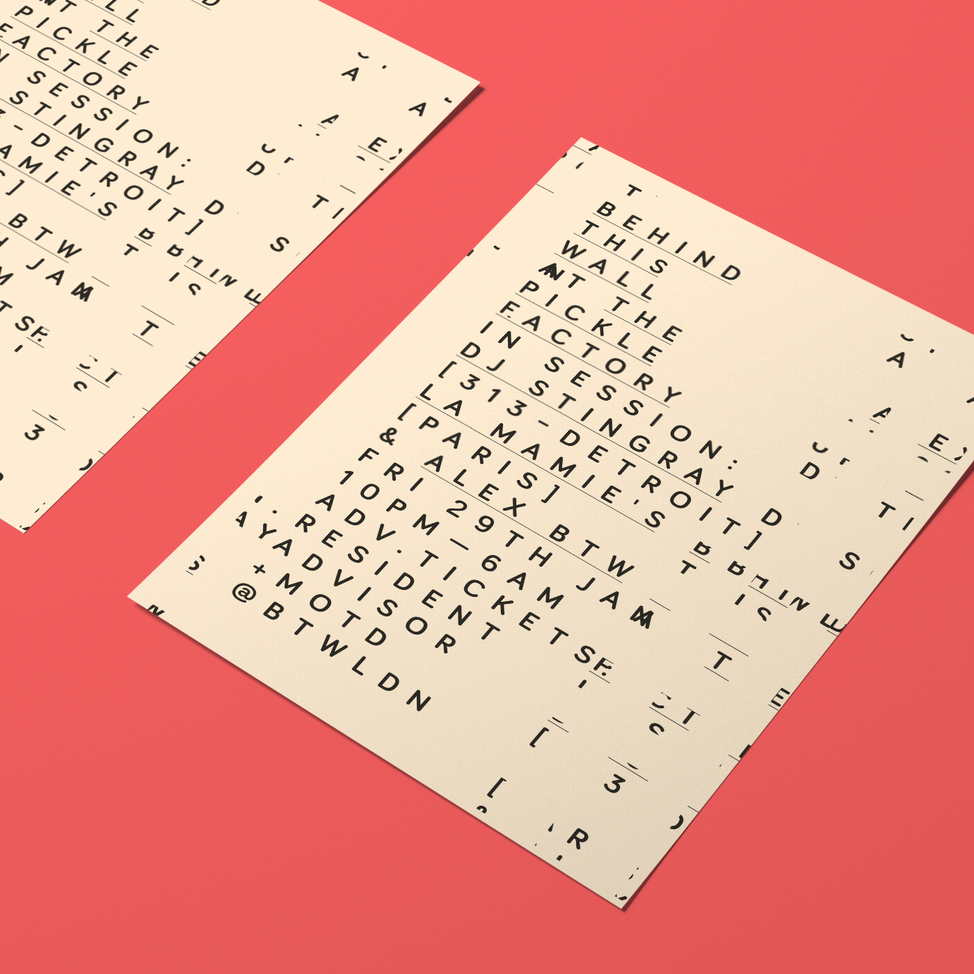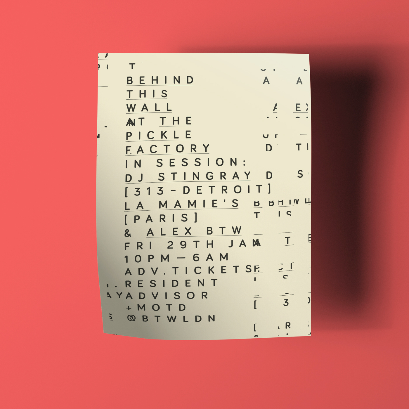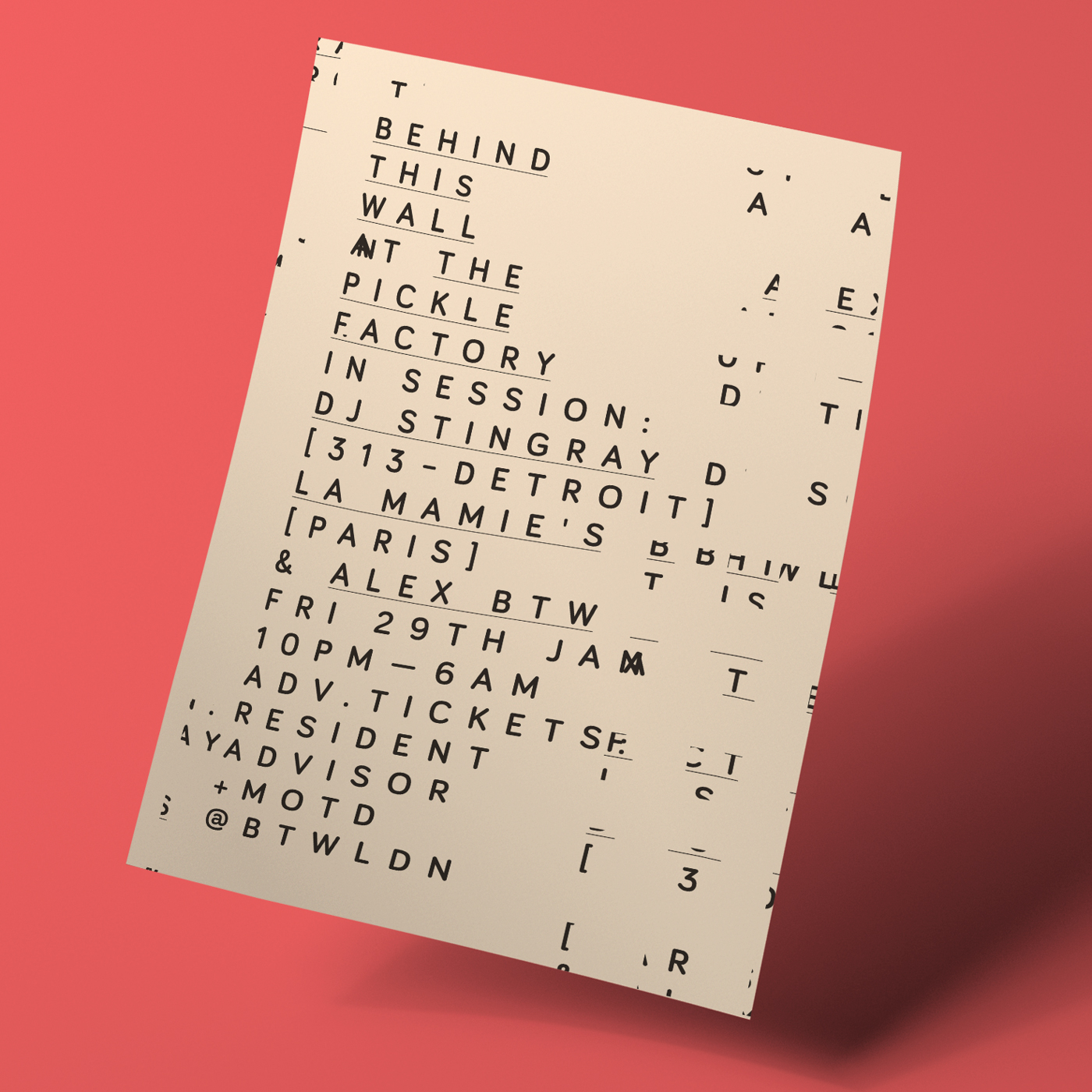 Behind This Wall at The Pickle Factory Contributed by David Matos on Jan 11th, 2016. Artwork published in January 2016. Source: www.behance.net Photo: David Matos. David Matos. License: CC BY-NC. Artwork by David Matos. Party poster for BTW at TPF in London. Bariol Bold only. Source: www.behance.net Photo: David Matos. David Matos. License: CC BY-NC. Artwork by David Matos. Source: www.behance.net Photo: David Matos. David Matos. License: CC BY-NC. Artwork by David Matos. Source: www.behance.net Photo: David Matos. David Matos. License: CC BY-NC. Artwork by David Matos. Typefaces More about BariolGet Bariol Formats Posters/Flyers (5803) Topics Event (3239) Designers/Agencies Shutupandance (21) David Matos (21) Tagged withall caps (7675)deconstruction (77)loose letterspacing (422)one typeface, one size (413)underlined (755)fractured type (19)Behind This Wall (5) Artwork location Germany (3898) United Kingdom (3311) Berlin (1161) London (1832) In Setsposter (julia hofmann) (6)Hammer (Florian Mörk) (73)Sans (Brett Harrison) (4)WEIGHTLESS (Tanner Notch) (40) Post a comment Name Email – will not be published Website Your response Submit Comment More Bariol in use Behind This Wall BTWr1703 party poster2017ShutupandanceDavid MatosContributed by David Matos The Nines by JoOrs, BTWr16012017ShutupandanceDavid MatosContributed by David Matos Spring Menu 2019 for Behind This Wall2019ShutupandanceDavid MatosContributed by David Matos Sponsor More in Event Clásicos en Alcalá 20192019Sonia Castillo StudioMario AlonsoContributed by Sonia Castillo Studio Staff Pick Dulce Agua exhibition2022Clara SanchoContributed by Clara Sancho Ôtsu-e – Popular Paintings of Japan2019Brice TourneuxContributed by Threedotstype “Be In” poster1967Peter MaxContributed by Florian Hardwig Staff Pick More in Posters/Flyers Mind the Gap. Zwischen bekannten und neuen Räumen2020Mark Julien HahnContributed by Softdrive Foundry Bruce Nauman: Contraposto Studies2021Zak GroupContributed by Adrien Menard voordekunst brand identityc. 2024The Phoney ClubContributed by Sanne de Wild Lou Reed 1974 fictional concert posterc. 2019Vitalii EmelianovContributed by Vitalii Emelianov More Fonts In Use FishAct2019MutaborContributed by TypeMates Staff Pick re:publica 192019fertig designContributed by Florian Hardwig Staff Pick The Cooper Union Academic Building2009PentagramAbbott MillerContributed by Stephen Coles Staff Pick Also sprach Zarathustra by Friedrich Nietzsche, Insel Verlag1908Henry van de VeldeOffizin W. DrugulinContributed by Rodrigo Staff Pick