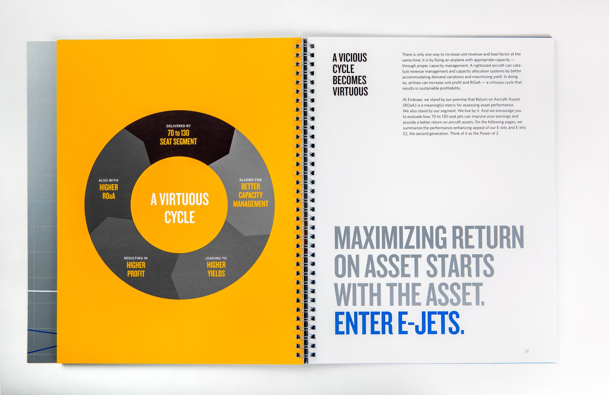 “The New Metrics of Success” is part of a continuing series of Embraer communiqués dedicated to helping airlines confront industry challenges. Subtitled “Fresh Perspectives on Airline Fleet Strategies,” the brochure makes a case for a business model that emphasizes profit-per-seat and return to shareholders over the pursuit of market share (which often involves discounted fares — and lower returns —in order to fill large aircraft of 170 seats or more). A key insight is that Embraer’s “right-sized” 70 to 130-seat aircraft segment can lead to better profits because lower-capacity aircraft generate higher revenue per seat.