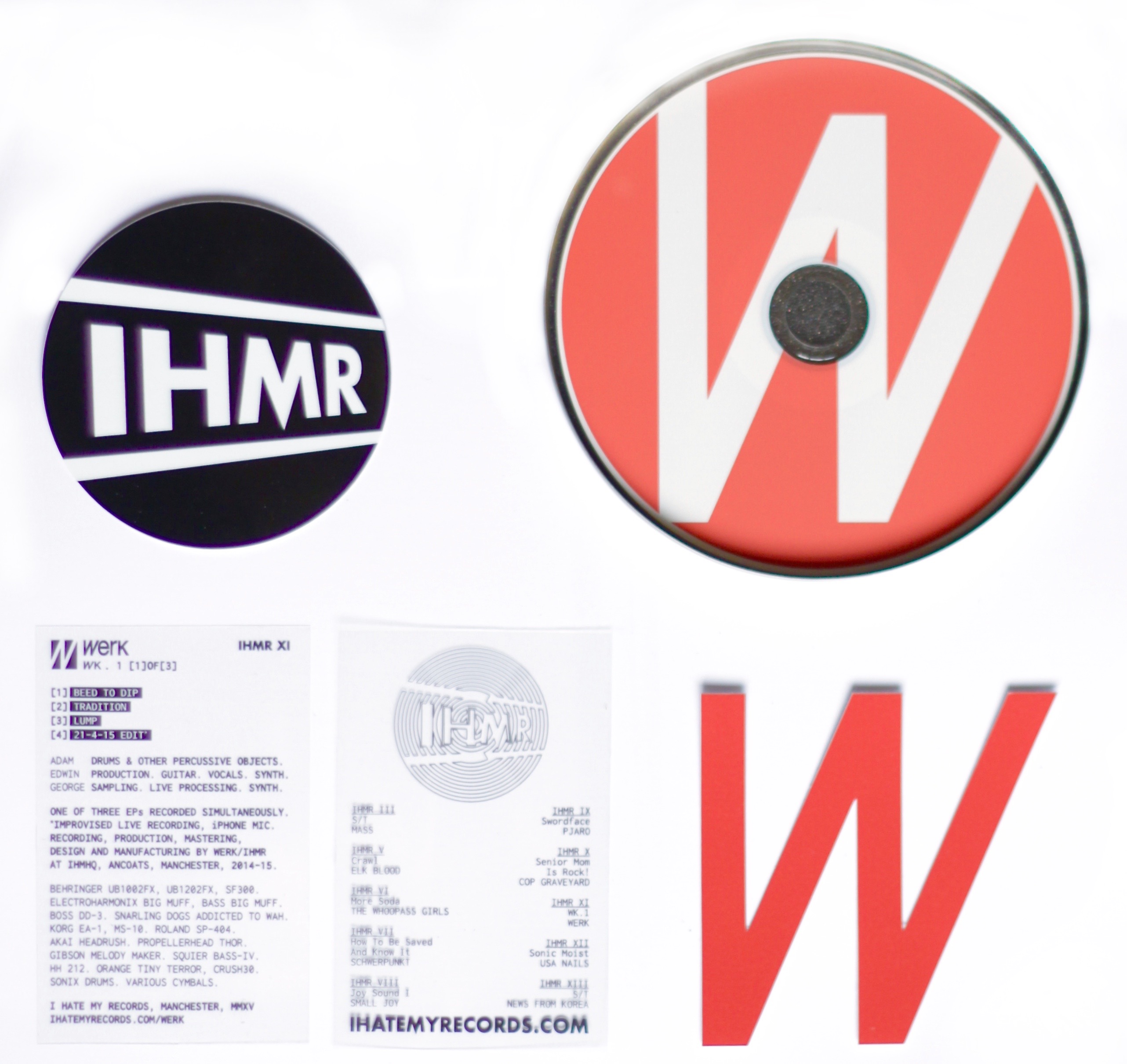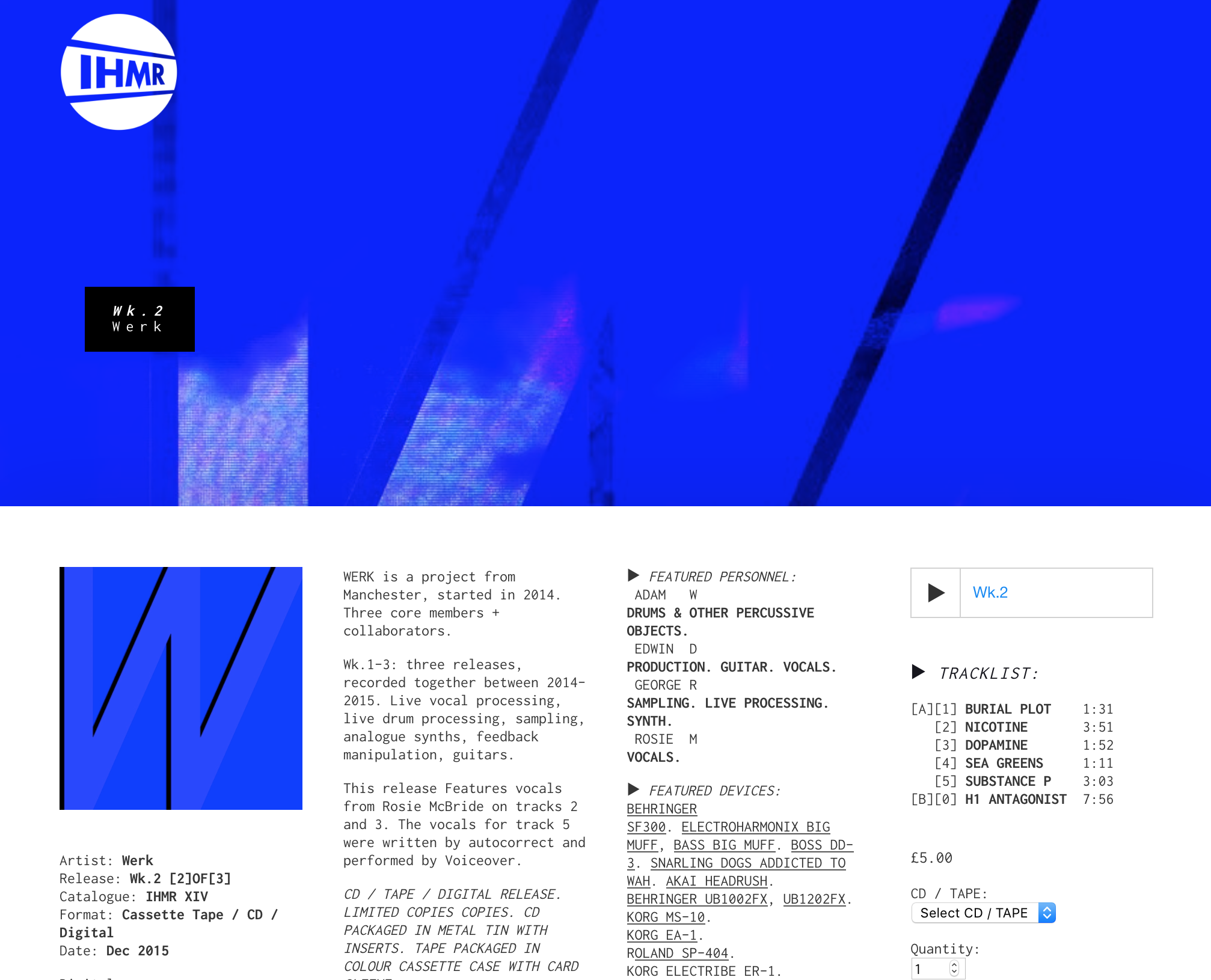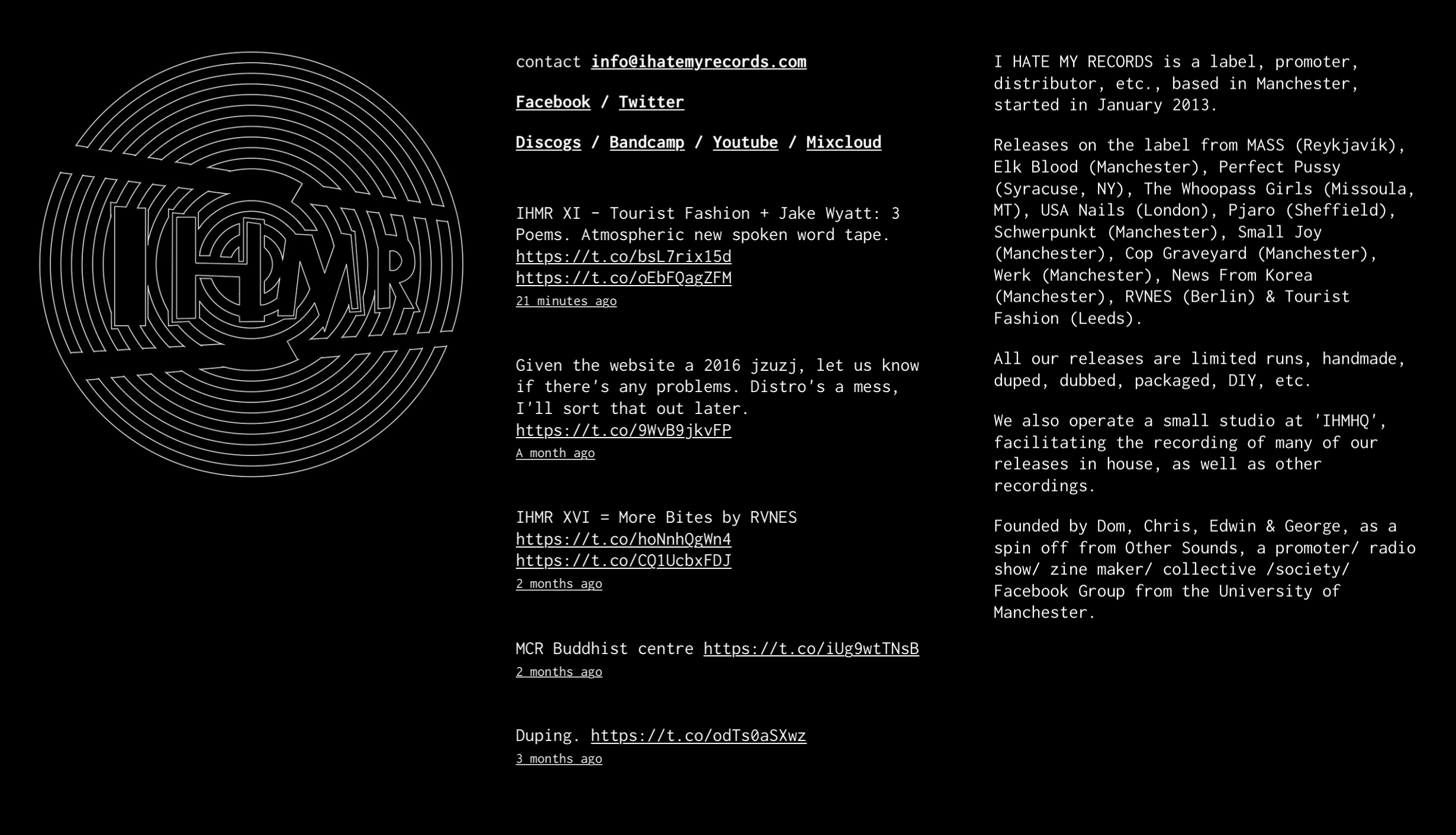 I Hate My Records is a DIY record label from Manchester, UK, mainly focused on limited cassette tape releases from artists around the world. Their website features a stack of parallax scrolling banners for each release. The globe logo references their origins in broadcasting as a local radio show. The logo initials are set in Futura Bold (with a modified ‘M’), whilst the body text online, and the small print in their packaging is Inconsolata.