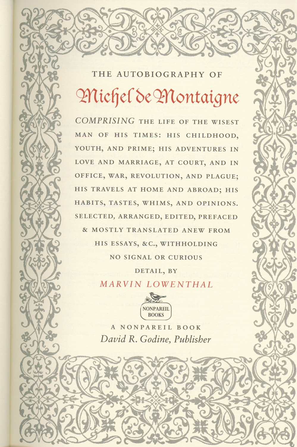 I made my first text typeface especially for this great classic (which was first planned six years before it went into production), though it appeared in a number of titles published before this one. It is called Montaigne Sabon, inspired in part by some drawings for a never-realized foundry version of Jan Tschichold’s famous Sabon types. The result is a very restrained design of generous proportions intended for long-haul reading at 11–12 point size.” — Scott-Martin Kosofsky