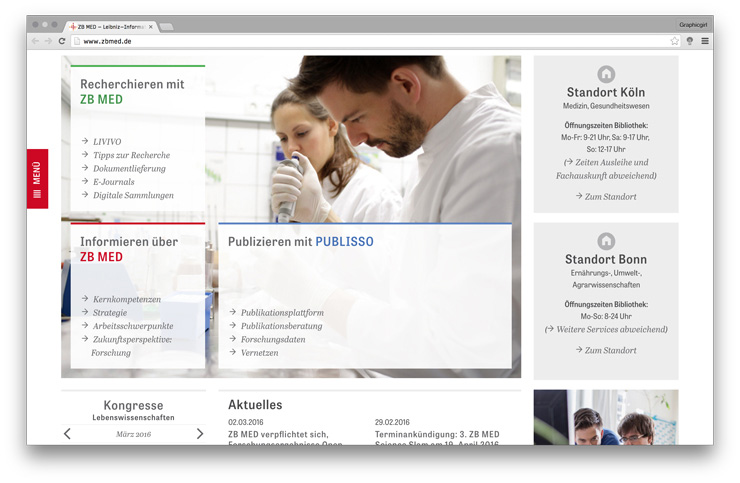 ZB MED hired the German designer Sabina Sieghart to design the new corporate identity, including an entirely new strategy and branding in line with their four areas of unique expertise, and studio 3pc was hired to implement their website. To lend credence and approachability to ZB MED, Tablet Gothic Narrow and Abril were chosen for the website and all print materials. Tablet Gothic Narrow can be seen in menus, texts, and headlines, and Abril is used in menus and short texts, usually in italics.